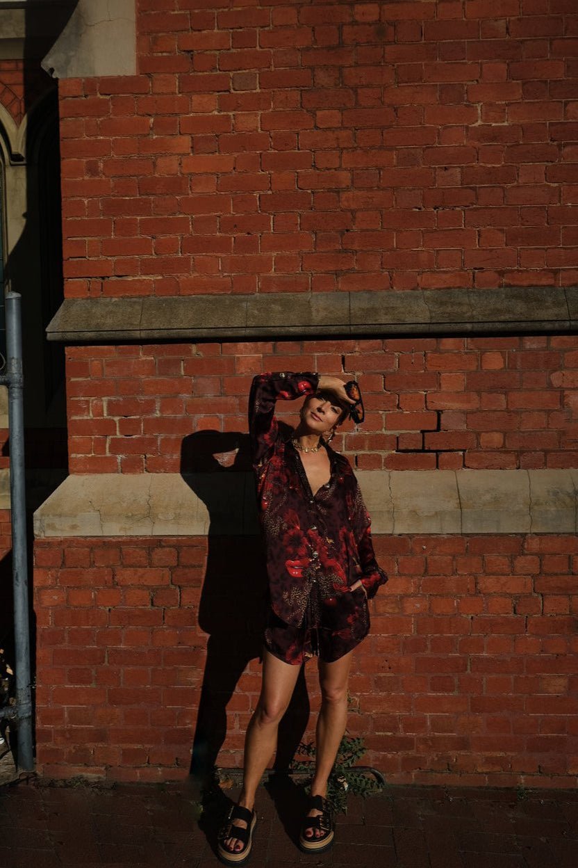 "Deep red hues like wine spilled under the glow of candlelight. Wild energy caged by no one."