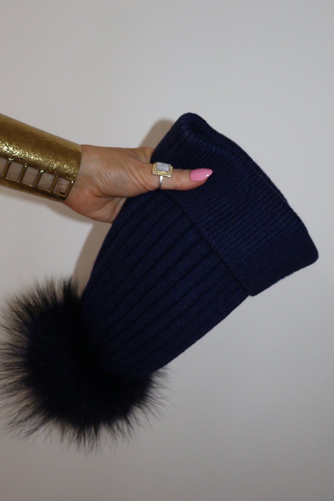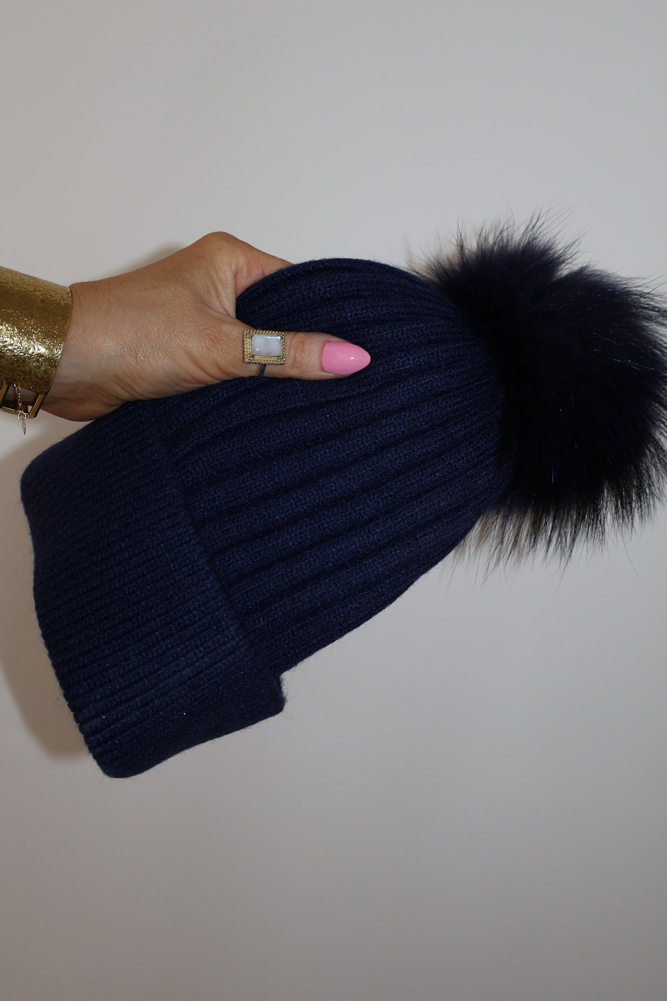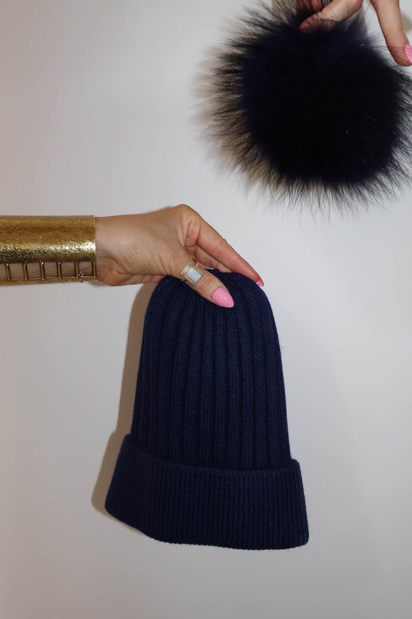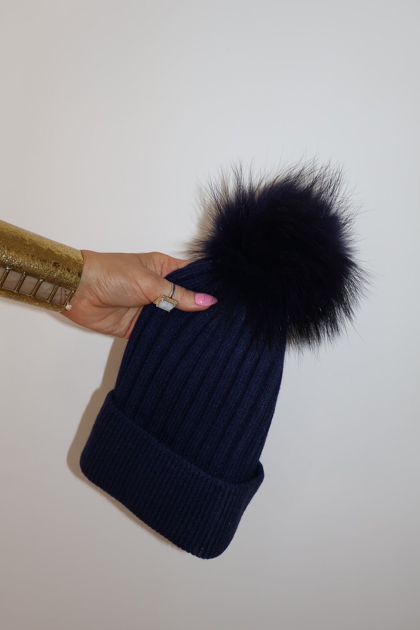 Detachable 100% racoon fur pom; press-stud attachment.