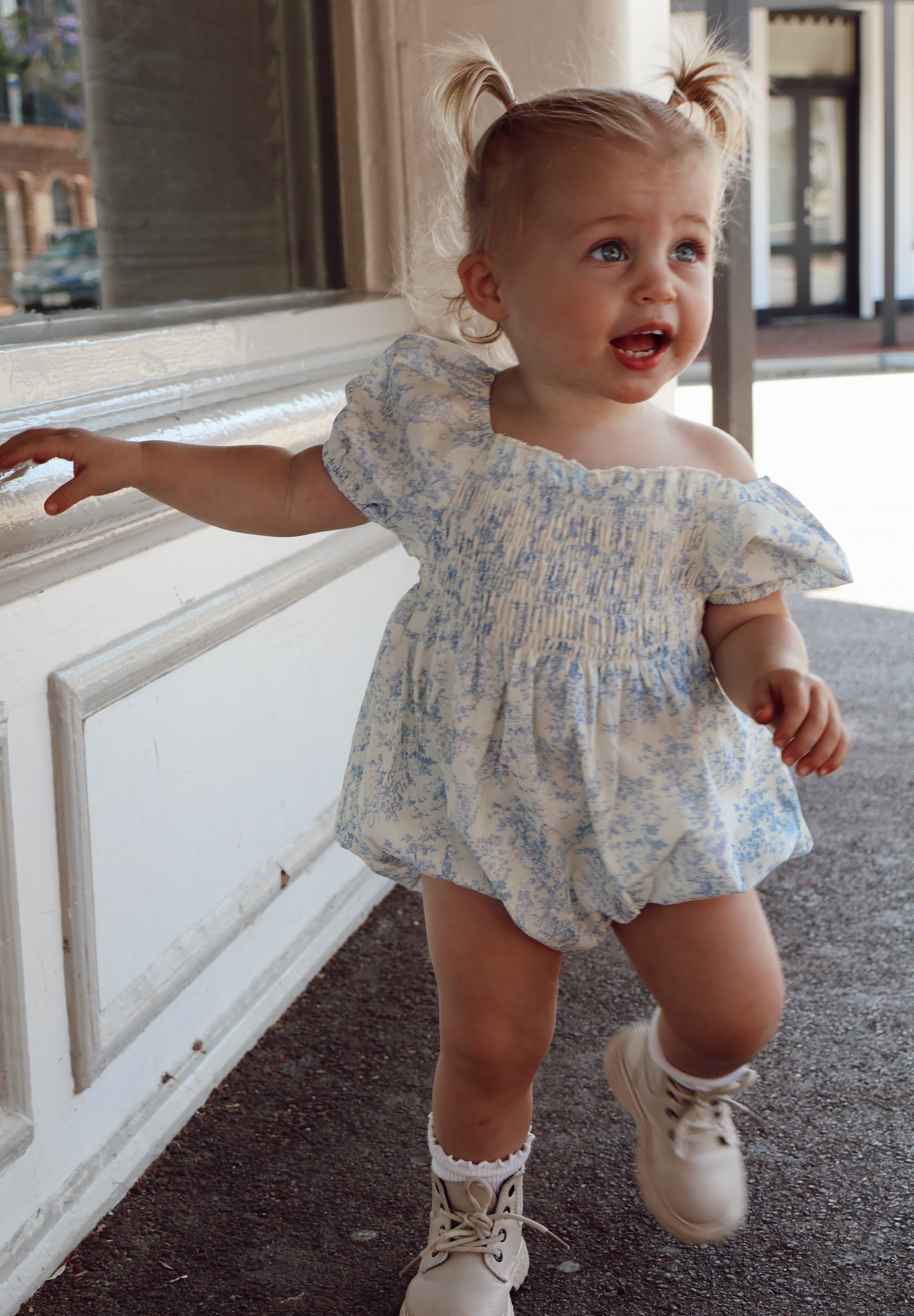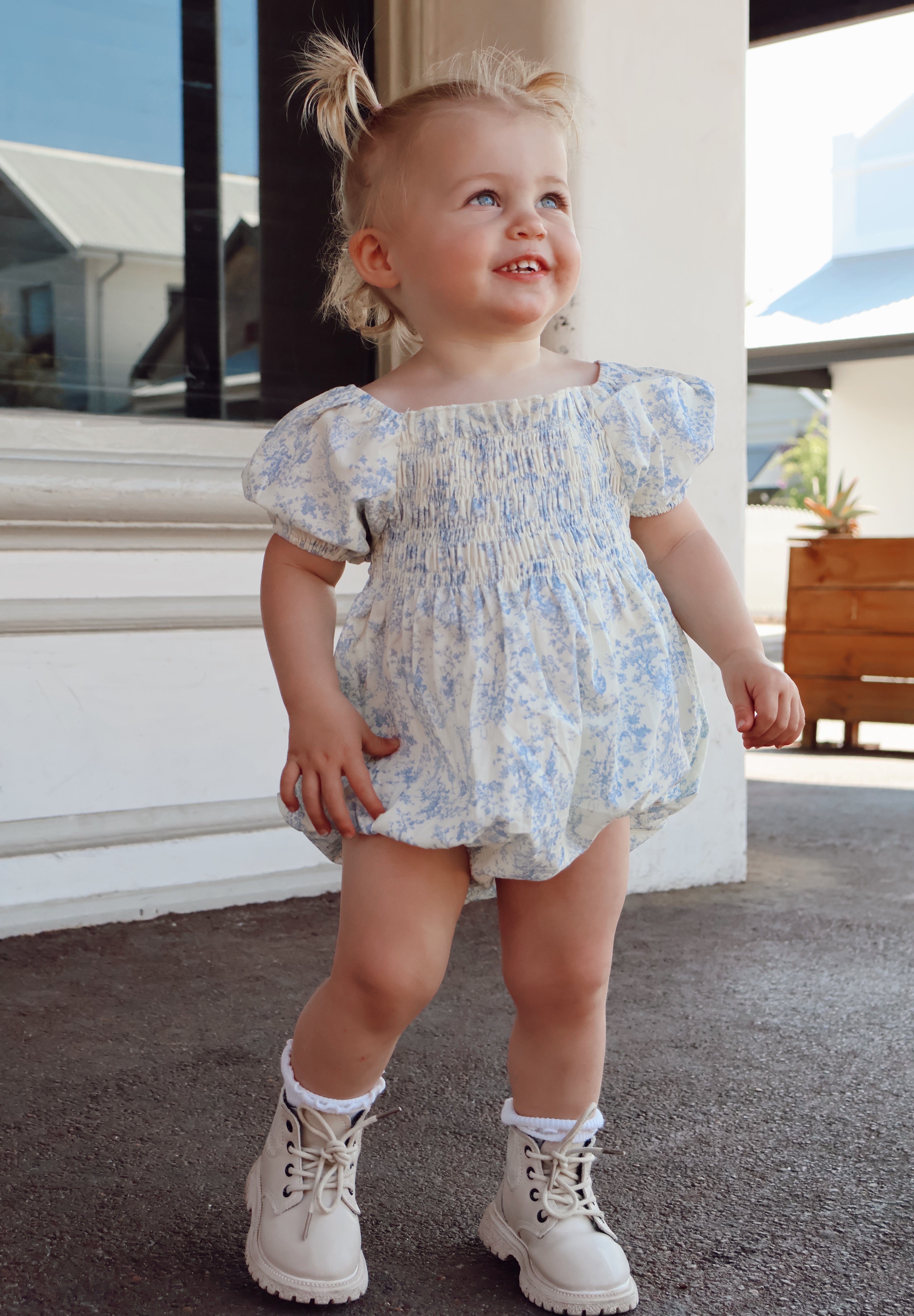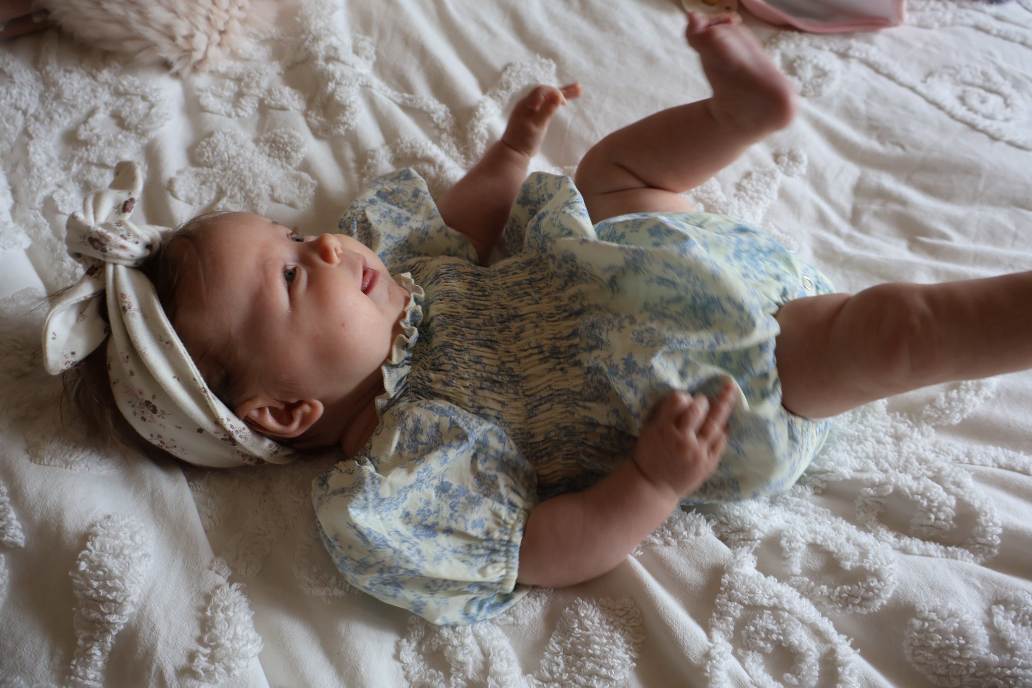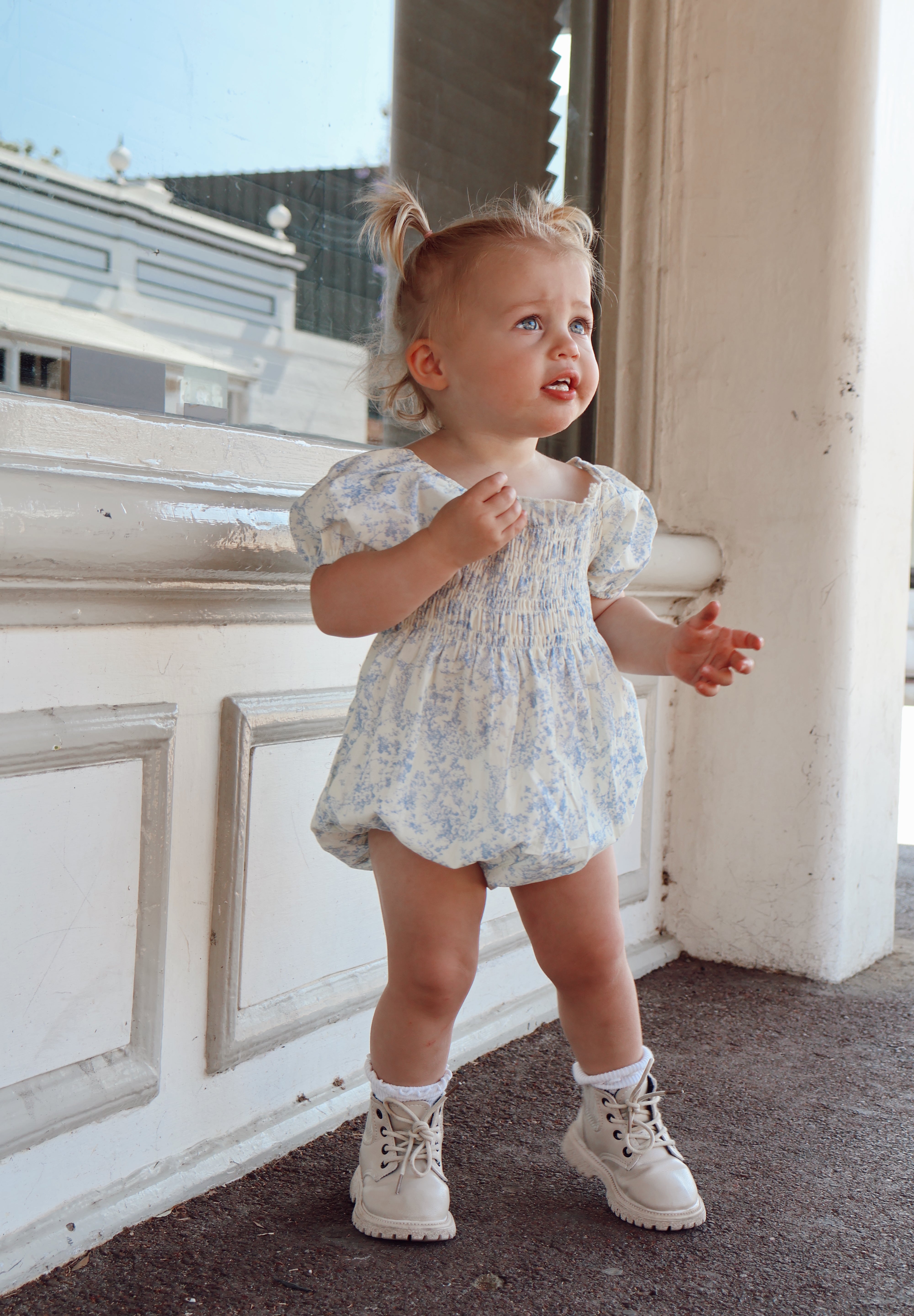The Immi Baby Romper in Bluebell is an ideal choice for your newborn. The adorable romper features a delicate blue floral print and puff sleeves, accentuated with elasticated shirring on the bodice. Give your little one a romantic touch with this charming and comfortable romper.