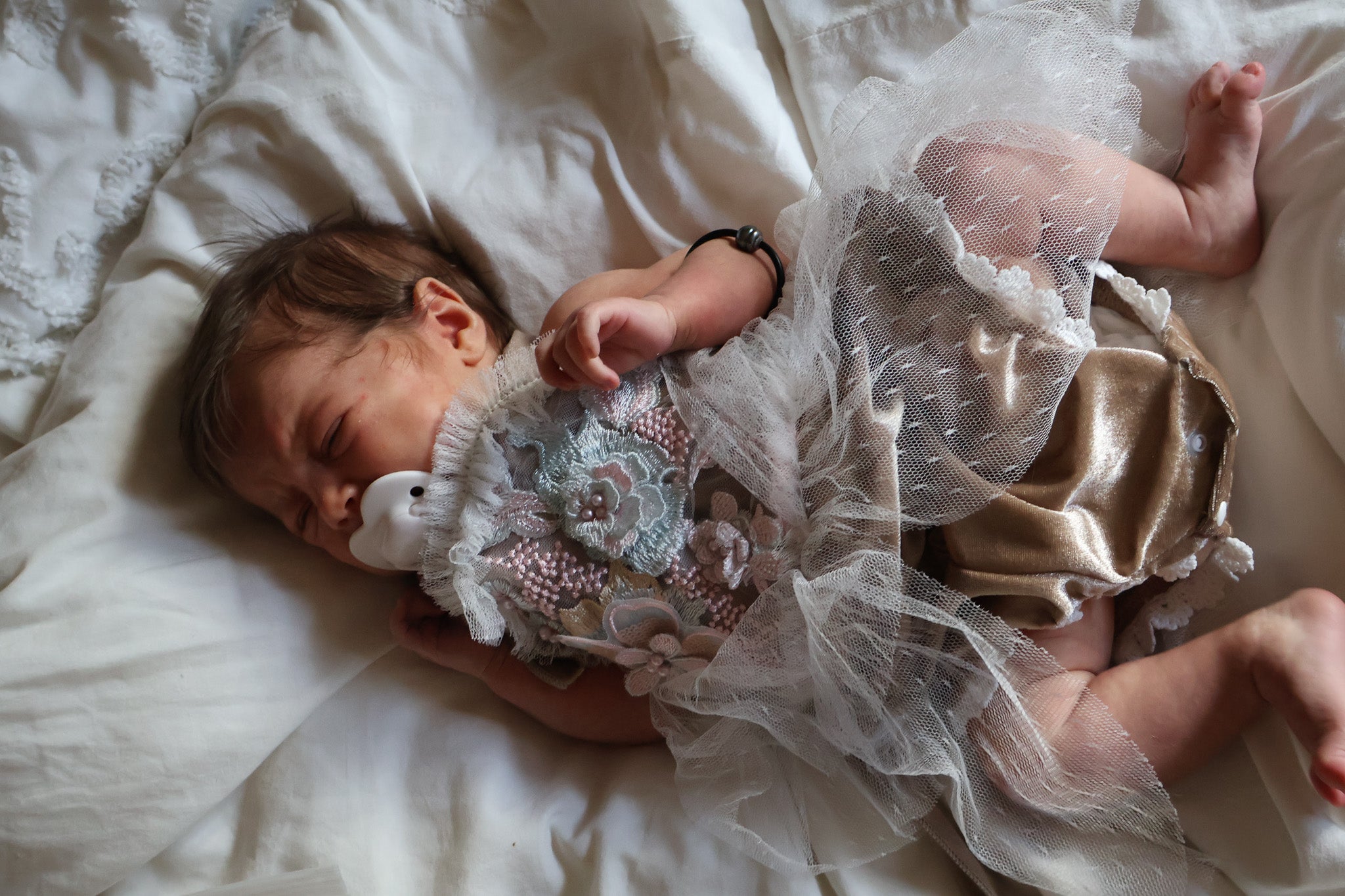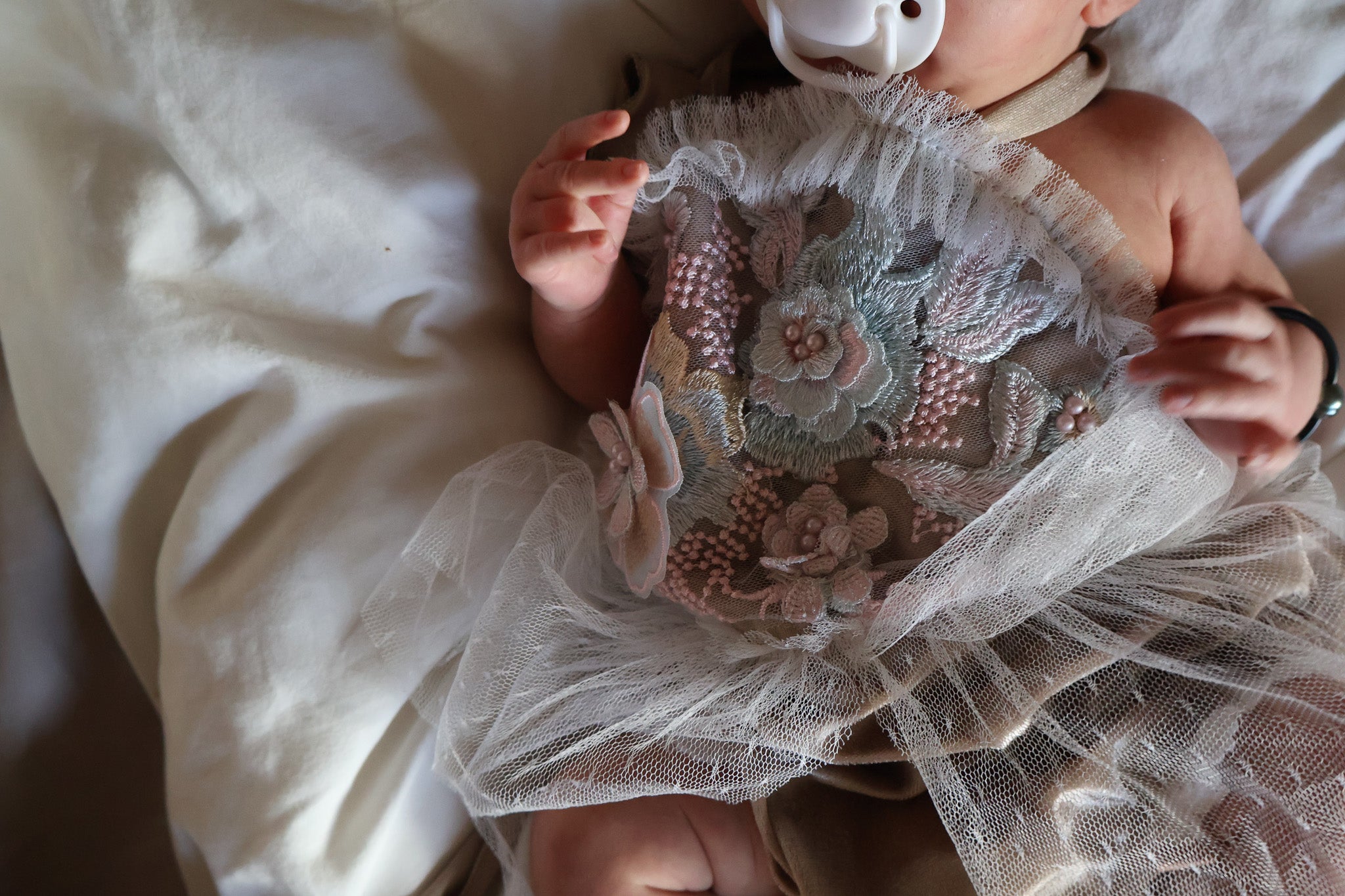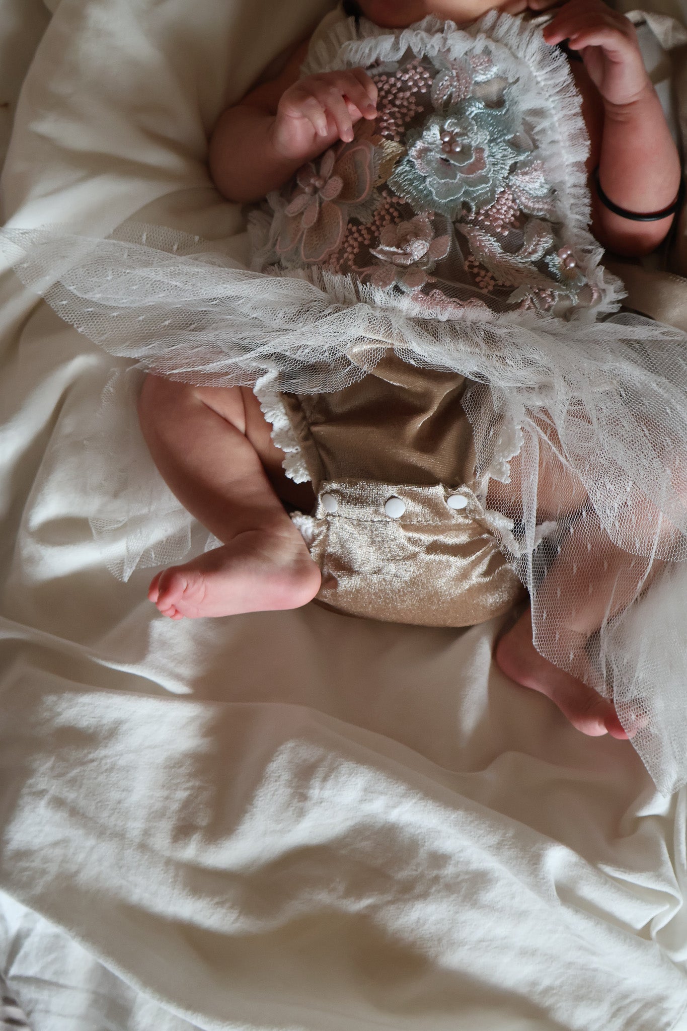 The super girly Imogen Velvet Romper is the cutest thing going around. From top to toe, with its ultra-soft velvet & gorgeous sequin appliqué detail to the bodice, right down to its lace trimmed bloomer bottoms and tulle skirt overlay.