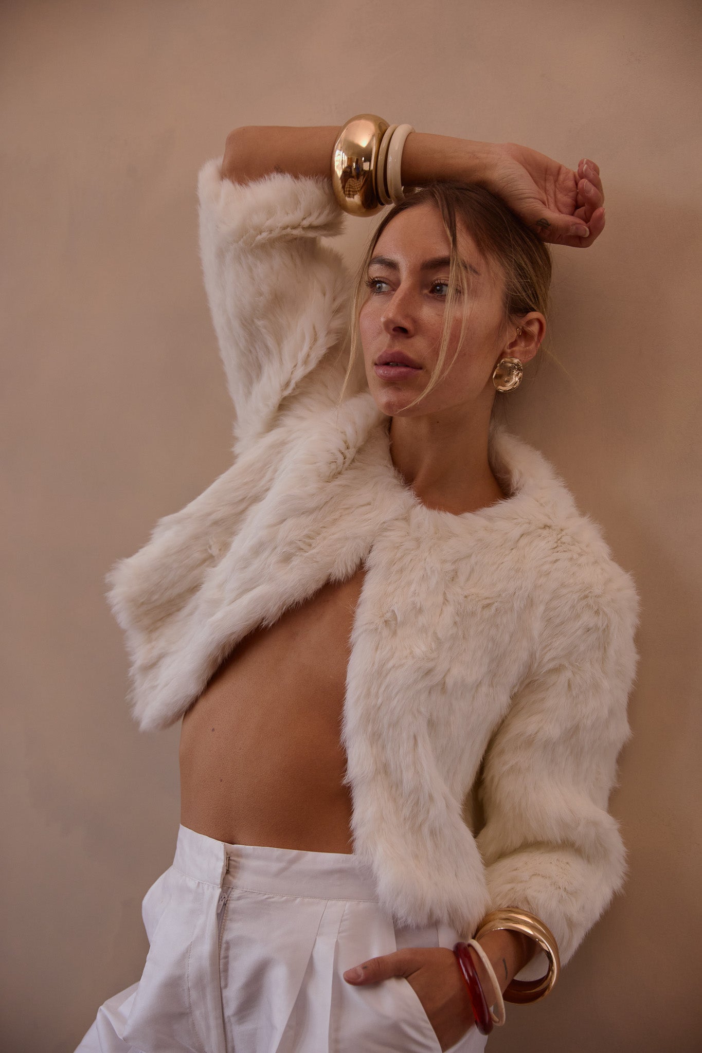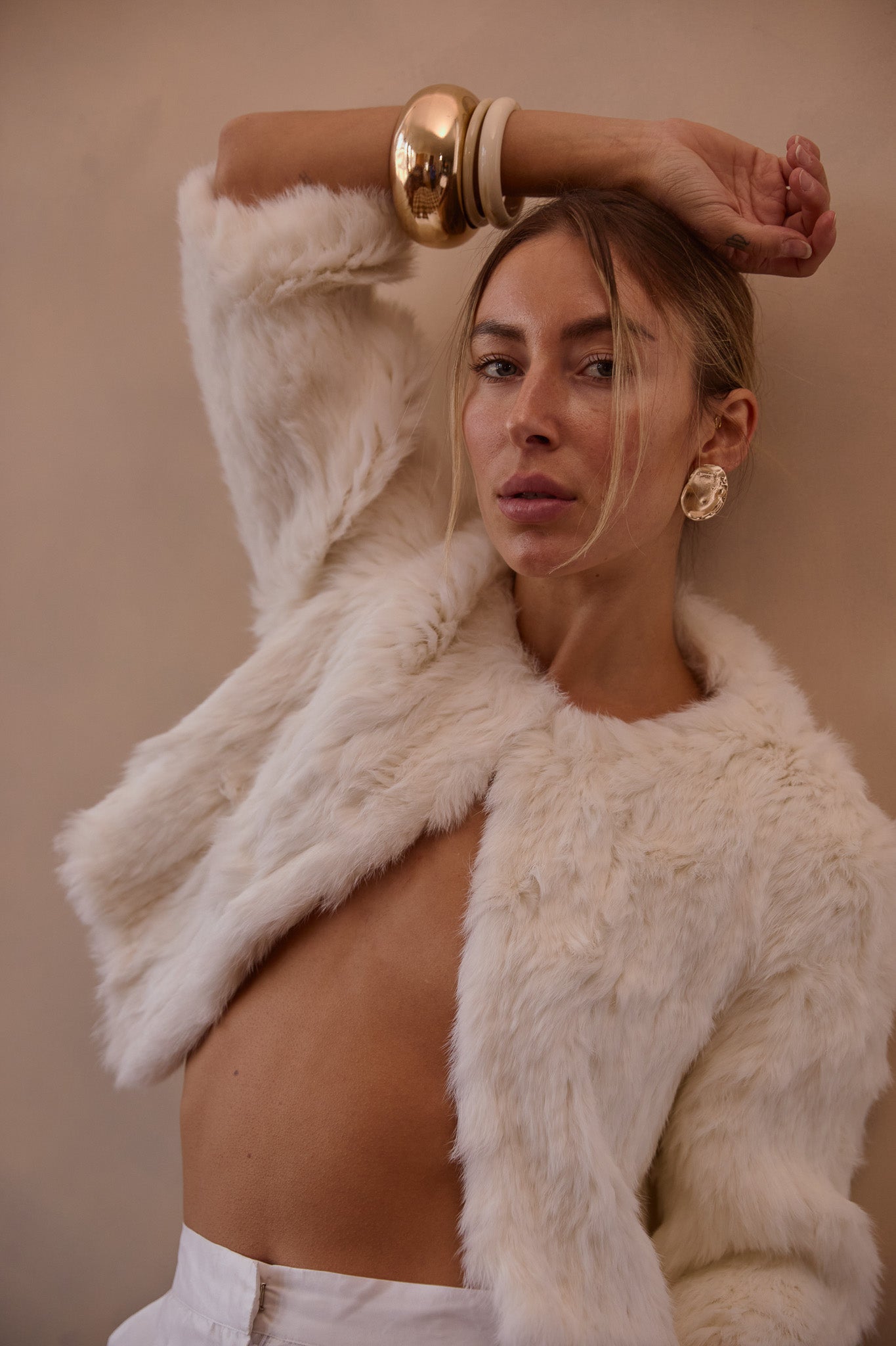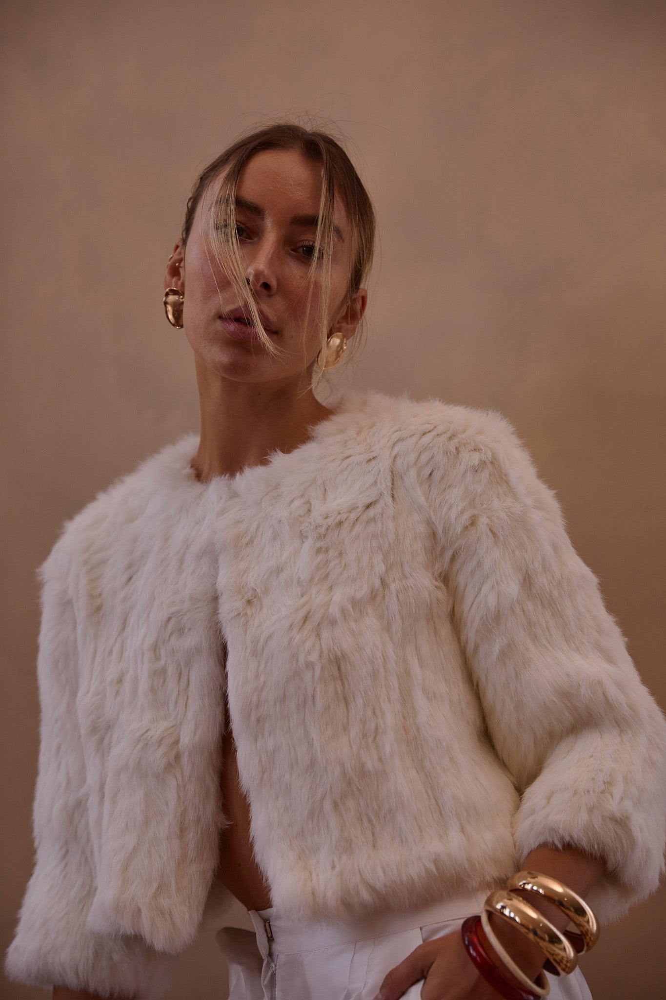 The Laci Bride Jacket in Snow is ideal for brides who are seeking additional coverage on their wedding day. The cropped bride jacket style is available in either ¾ length of full length sleeves and the body of the jacket is shorter in length so it is designed to complement bridal gown, without compromising any shape or detail. This bride jacket is made from knitted rabbit fur and is lined with fur on the inside making it incredibly warm and luxurious.