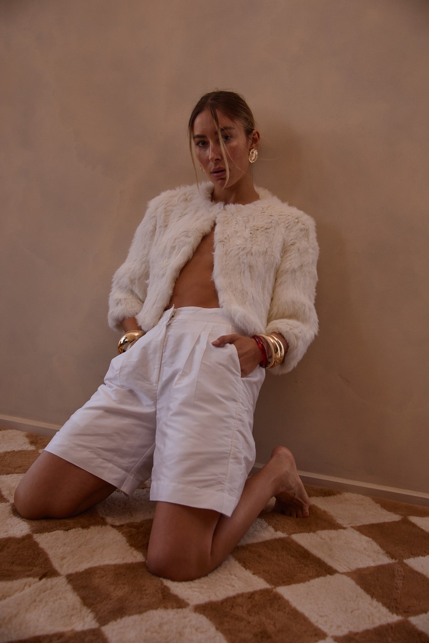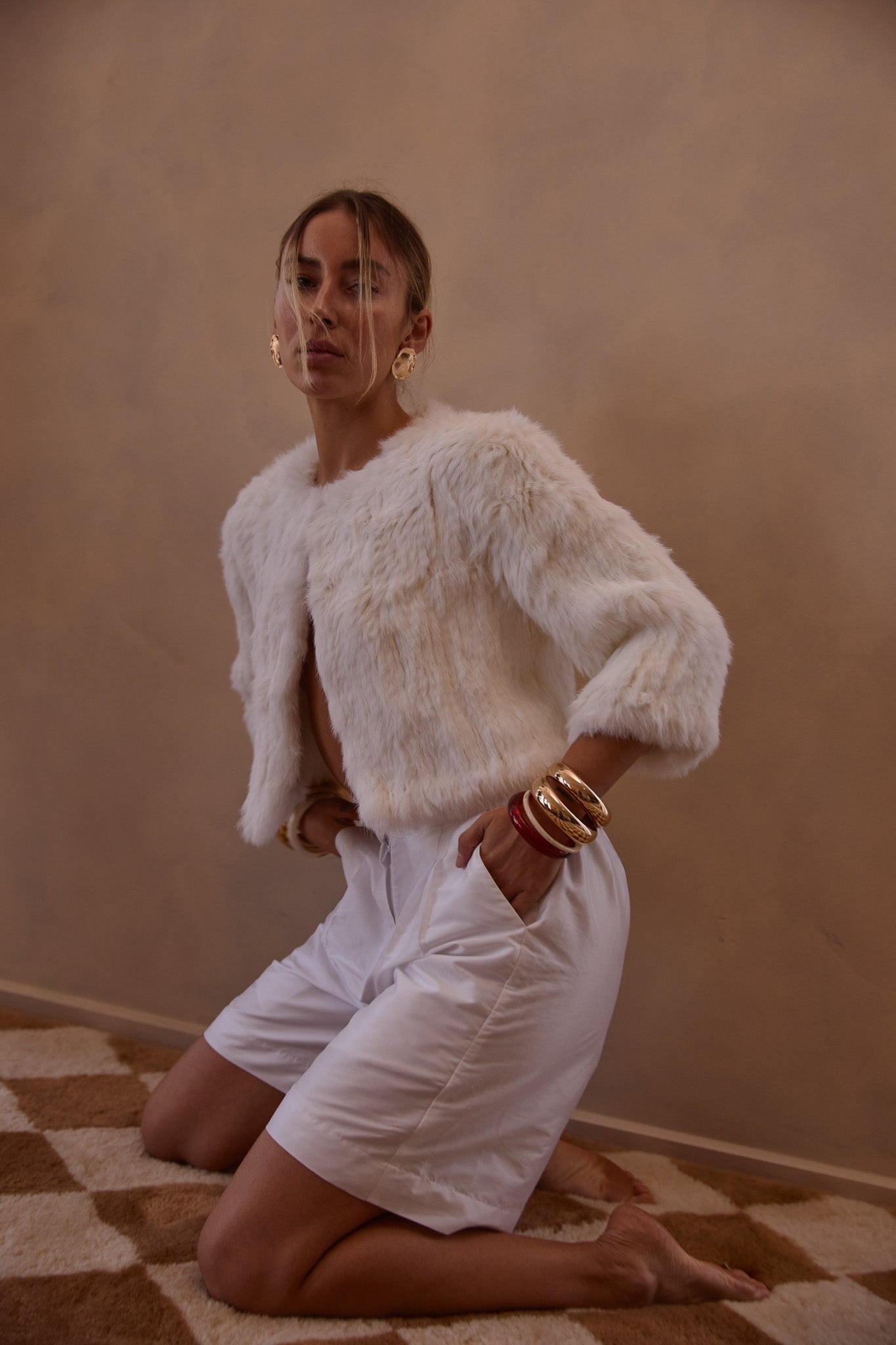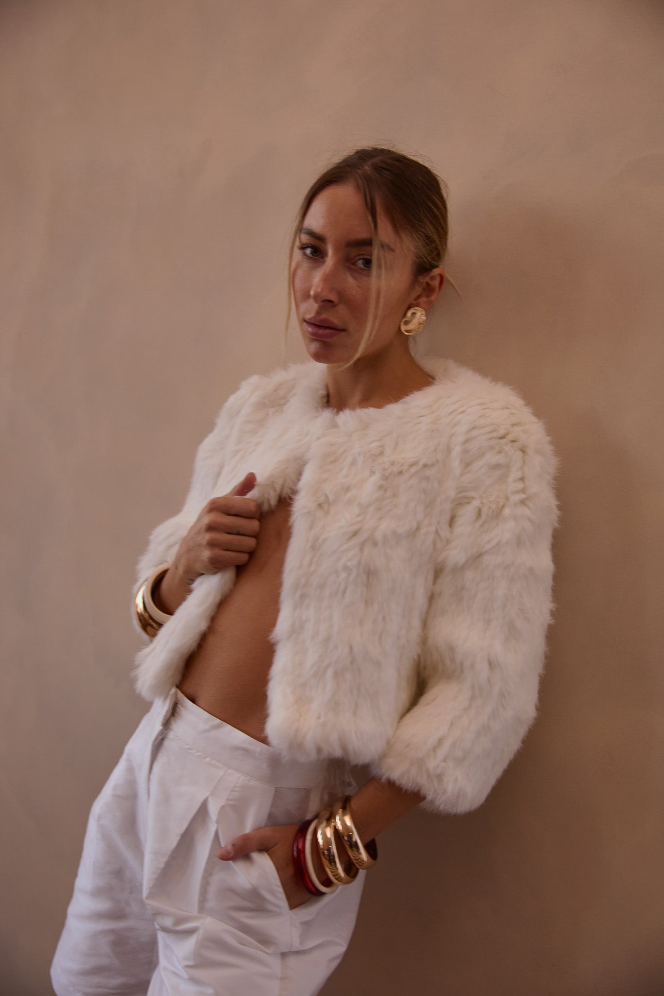 The Laci Bride Jacket in Snow is ideal for brides who are seeking additional coverage on their wedding day. The cropped bride jacket style is available in either ¾ length of full length sleeves and the body of the jacket is shorter in length so it is designed to complement bridal gown, without compromising any shape or detail. This bride jacket is made from knitted rabbit fur and is lined with fur on the inside making it incredibly warm and luxurious.
