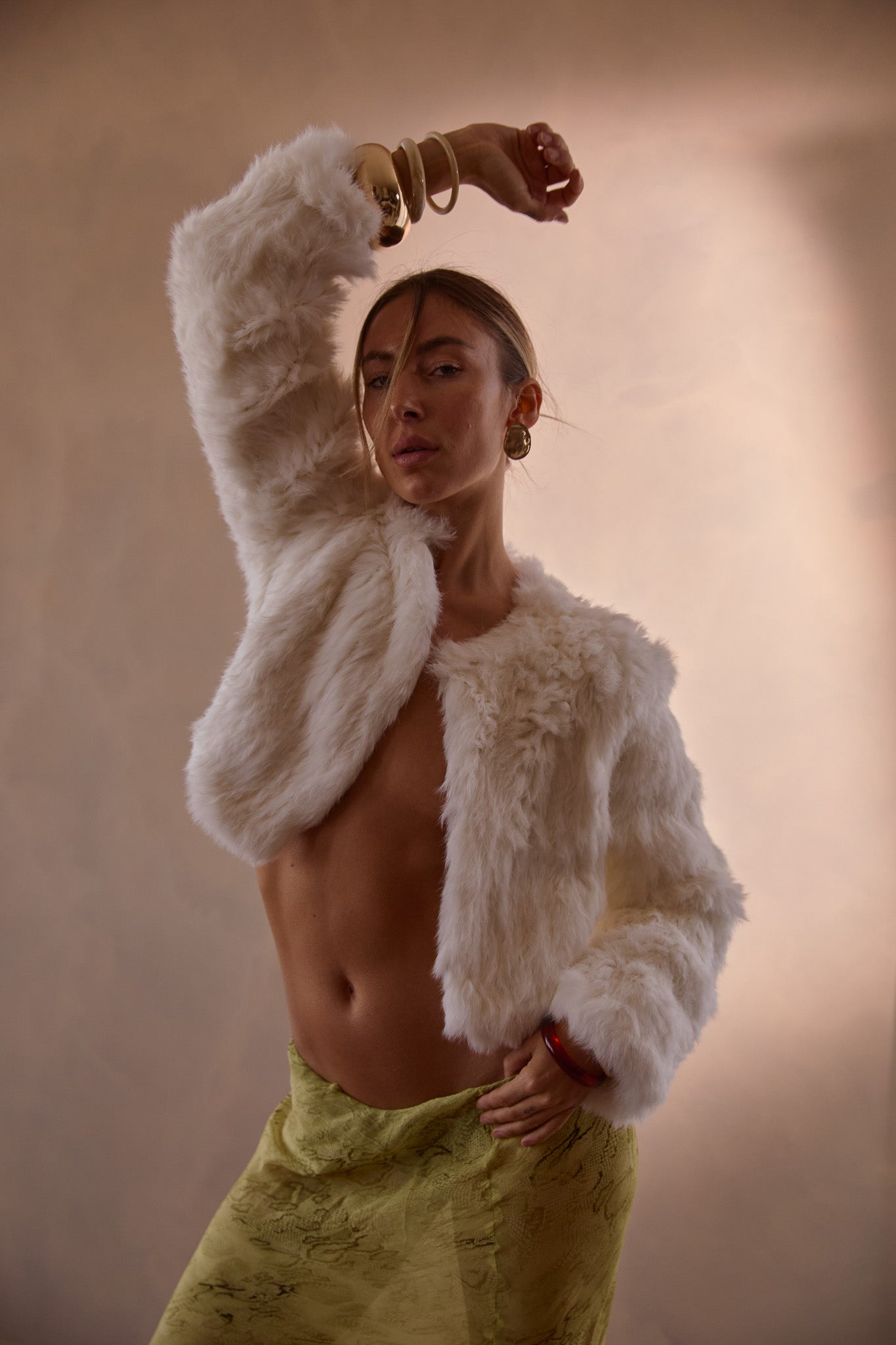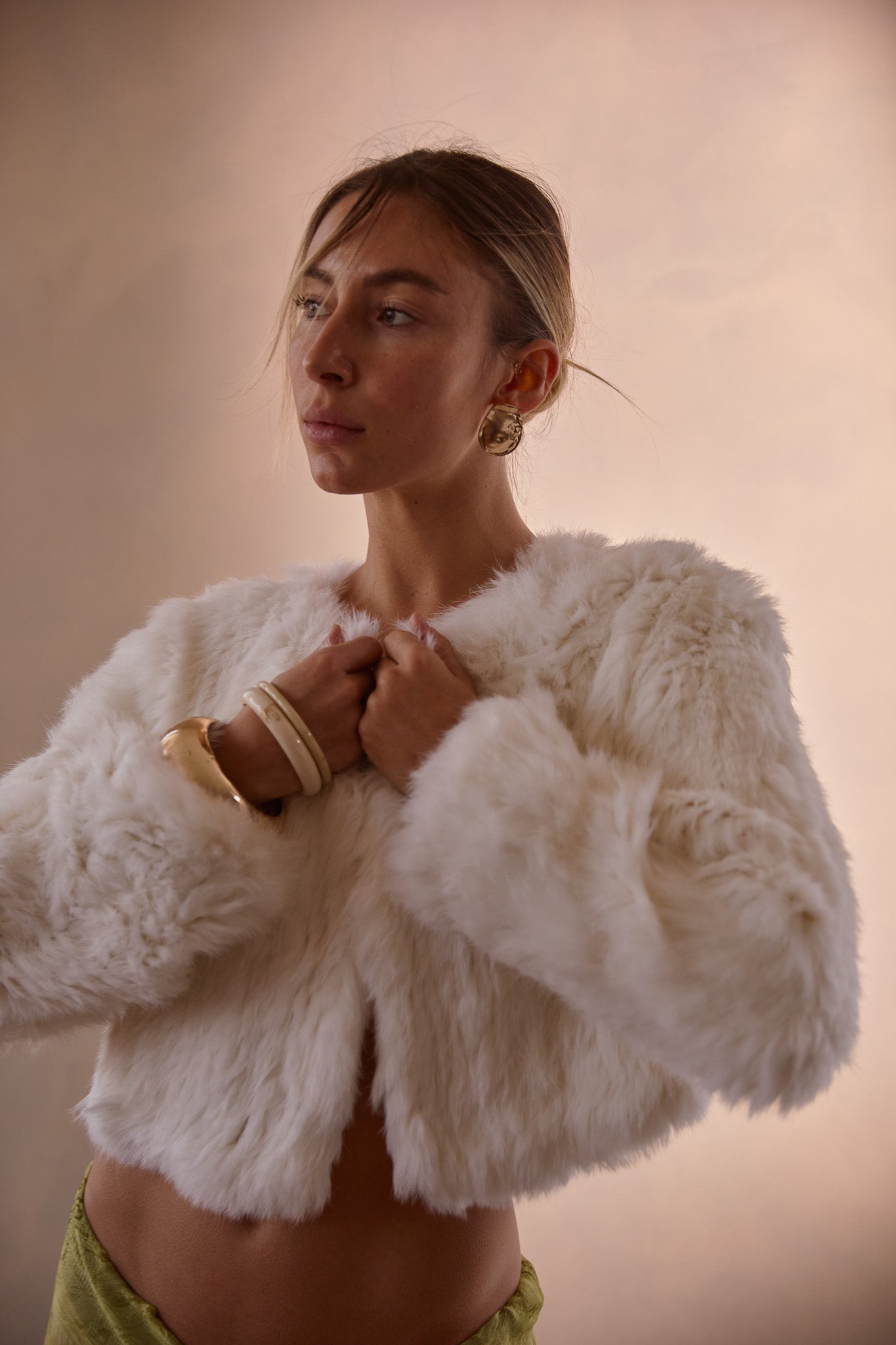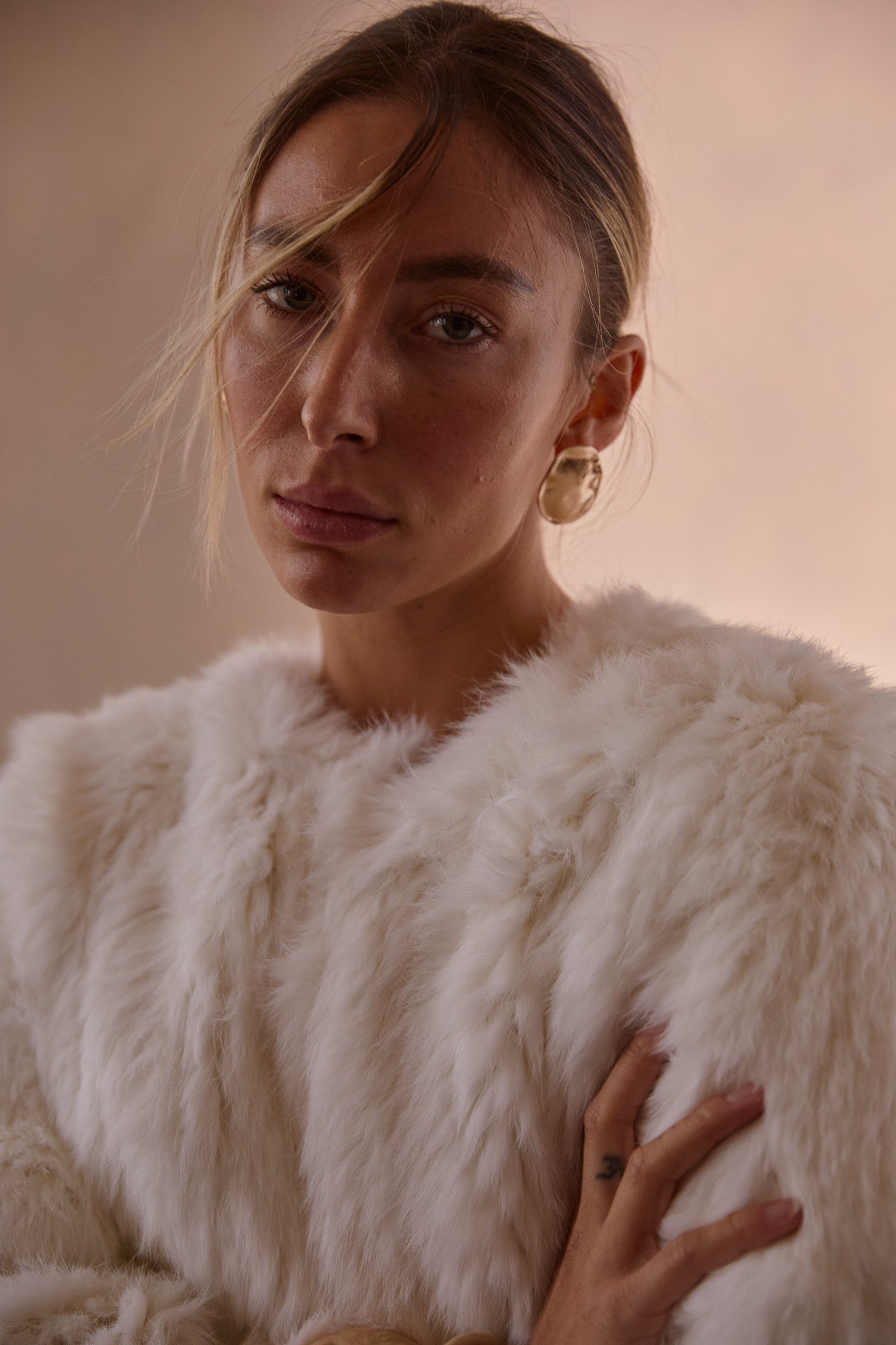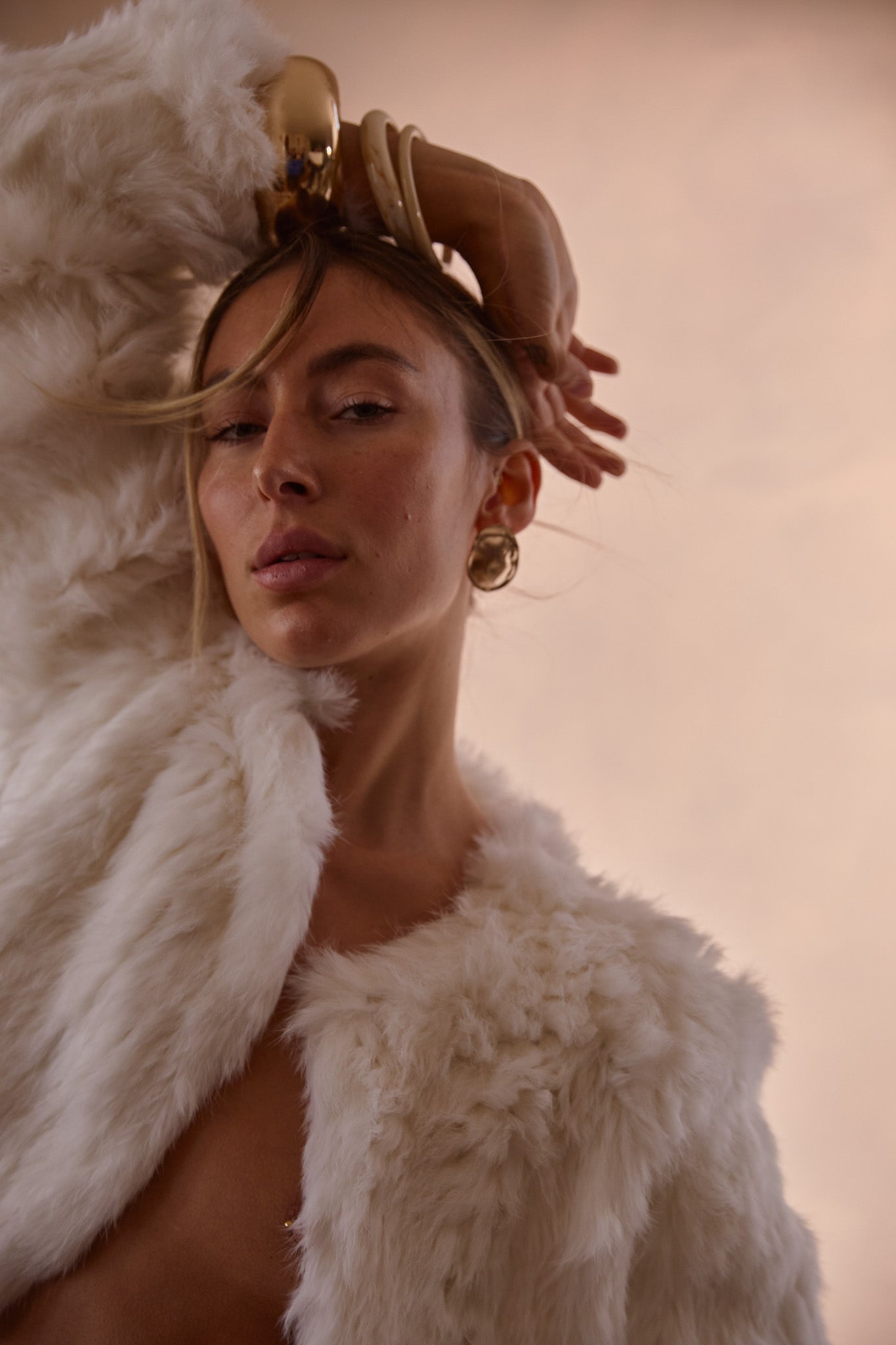 The Laci White Fur Jacket in Snow is a full length knitted rabbit fur jacket that is a perfect coat for a wedding.