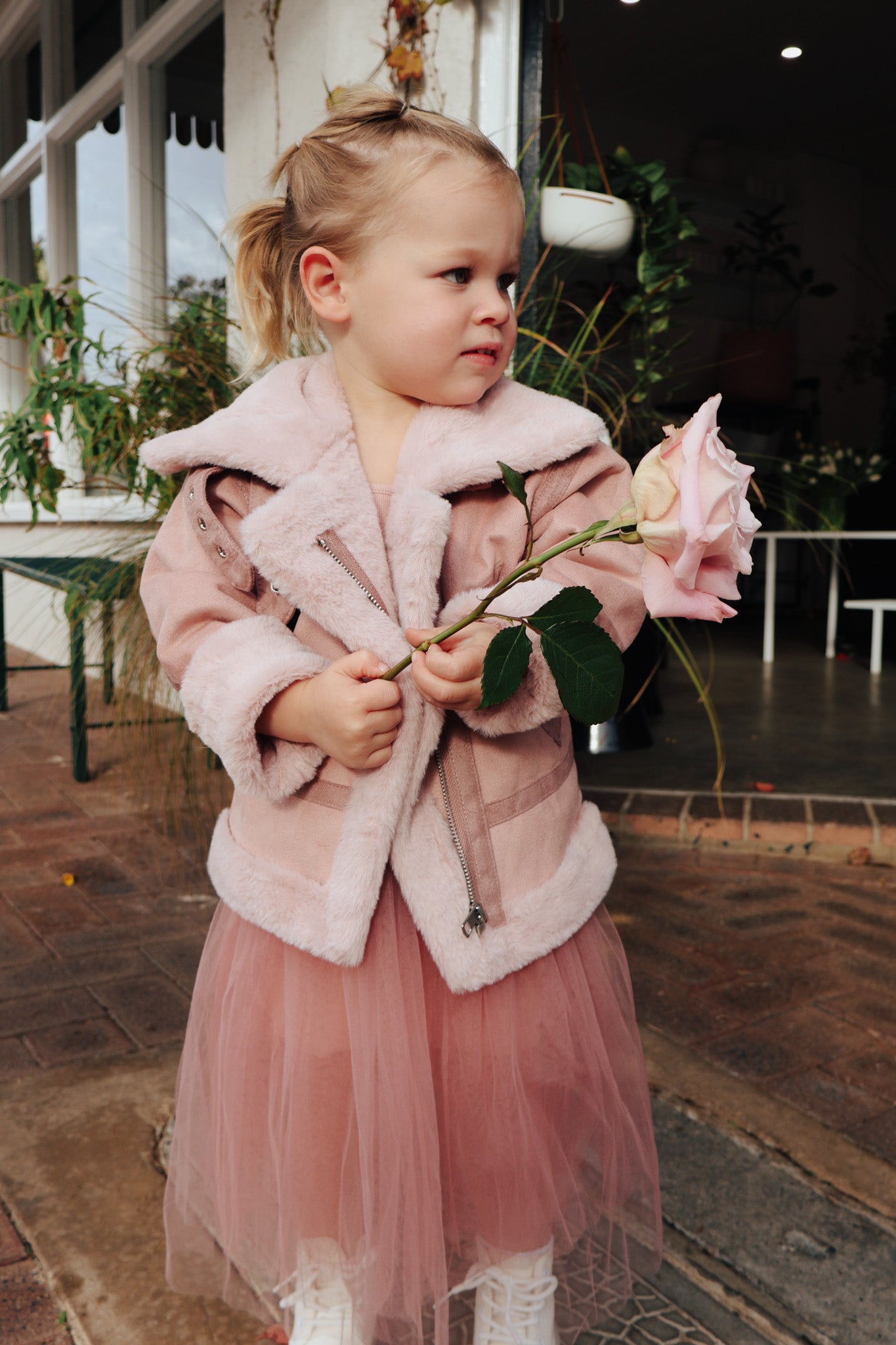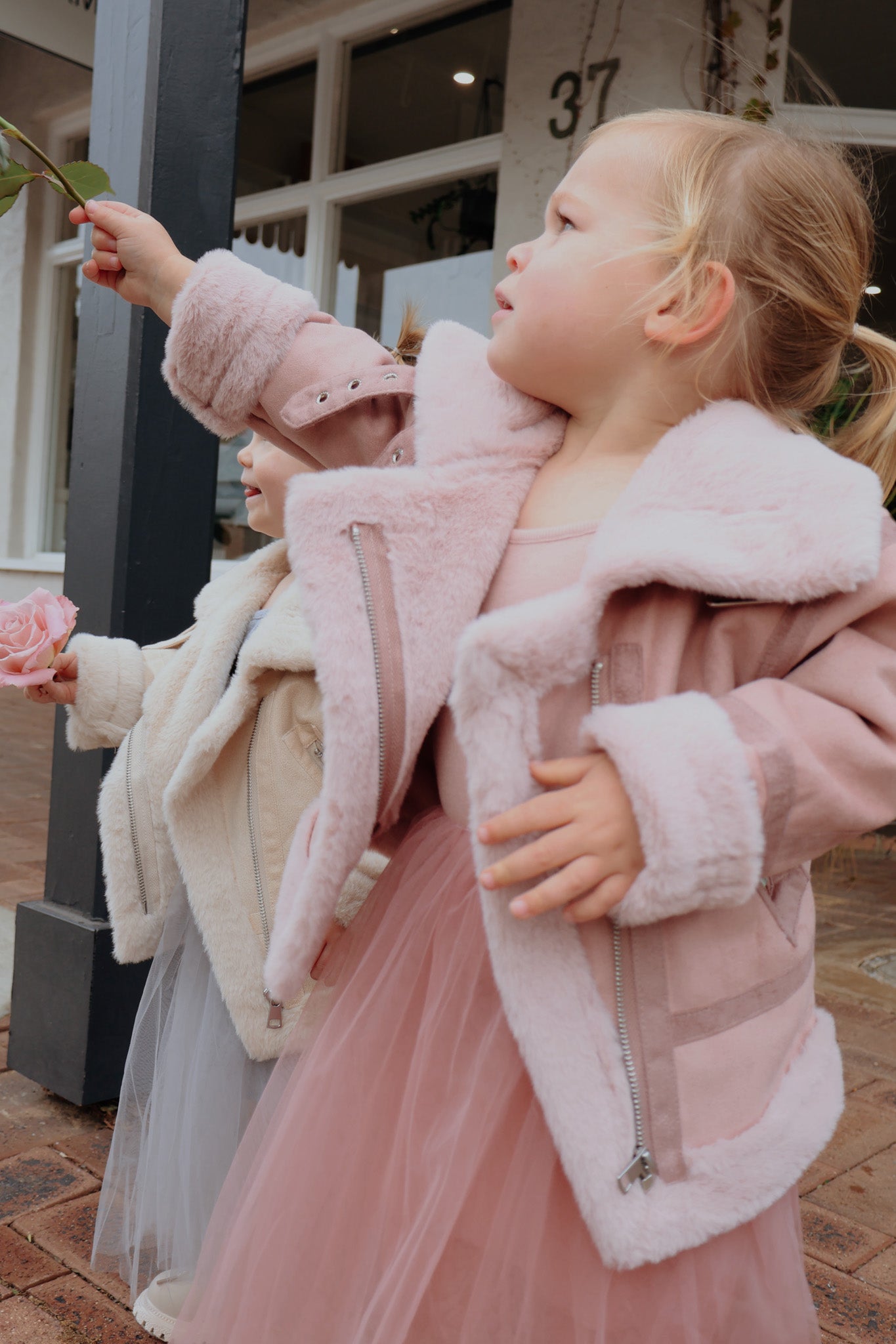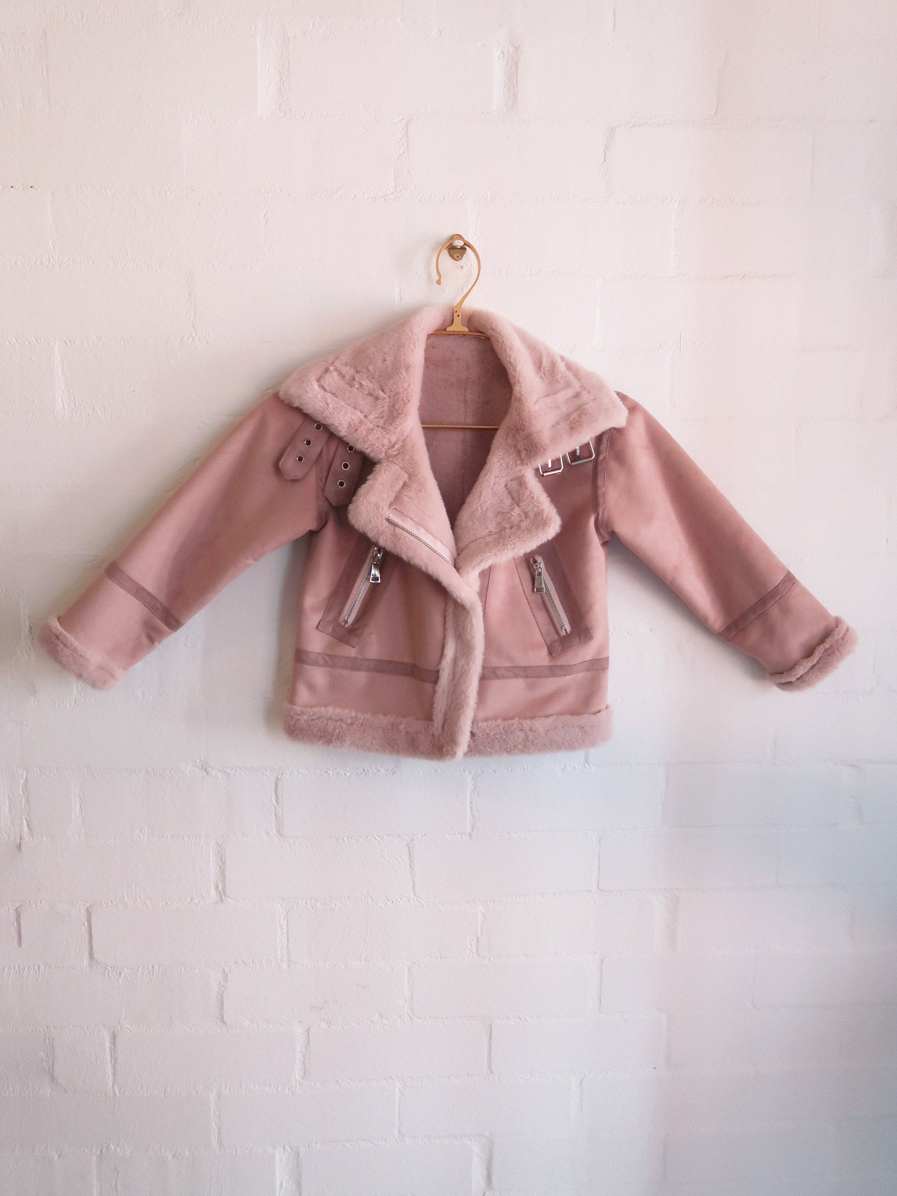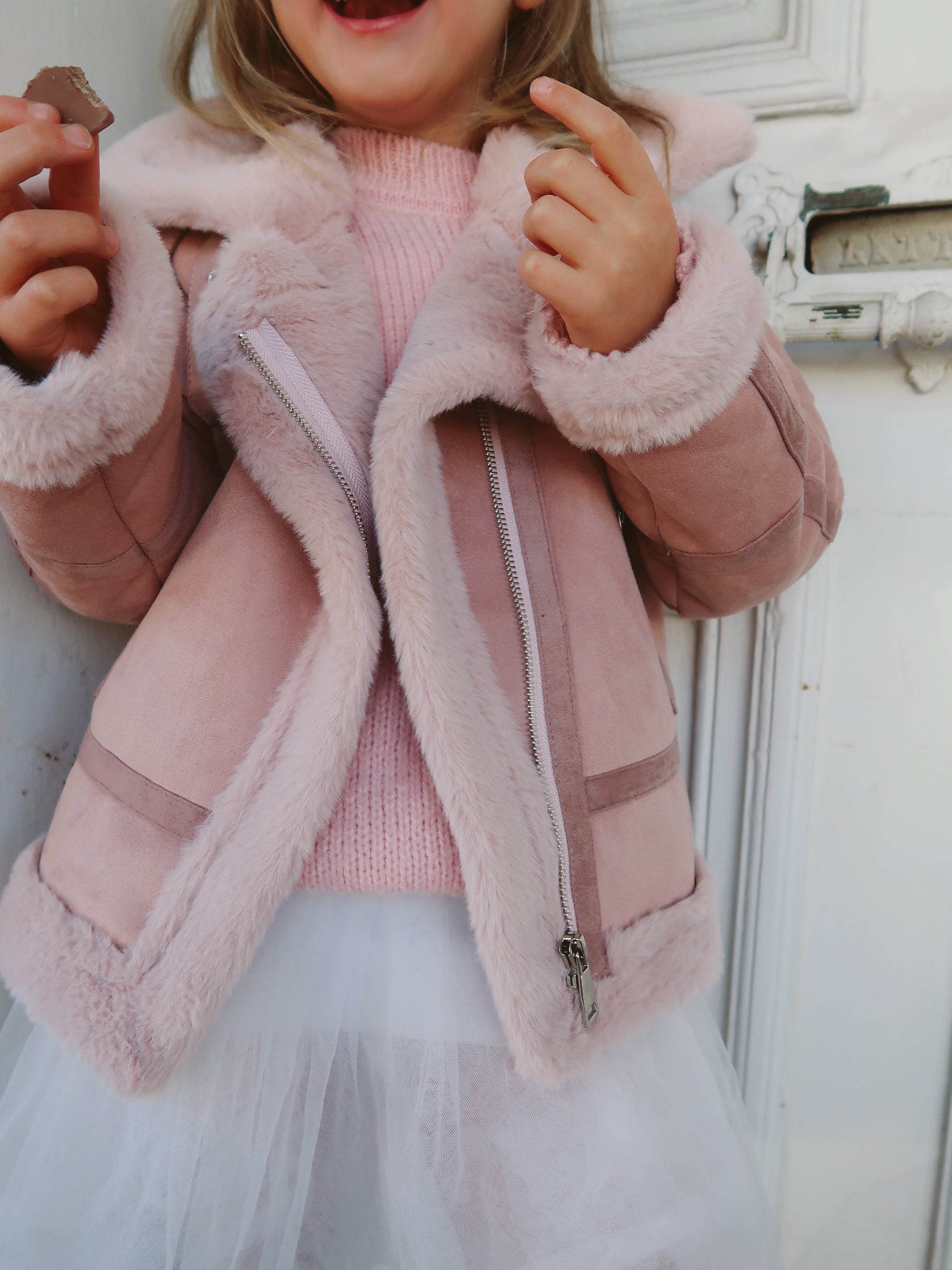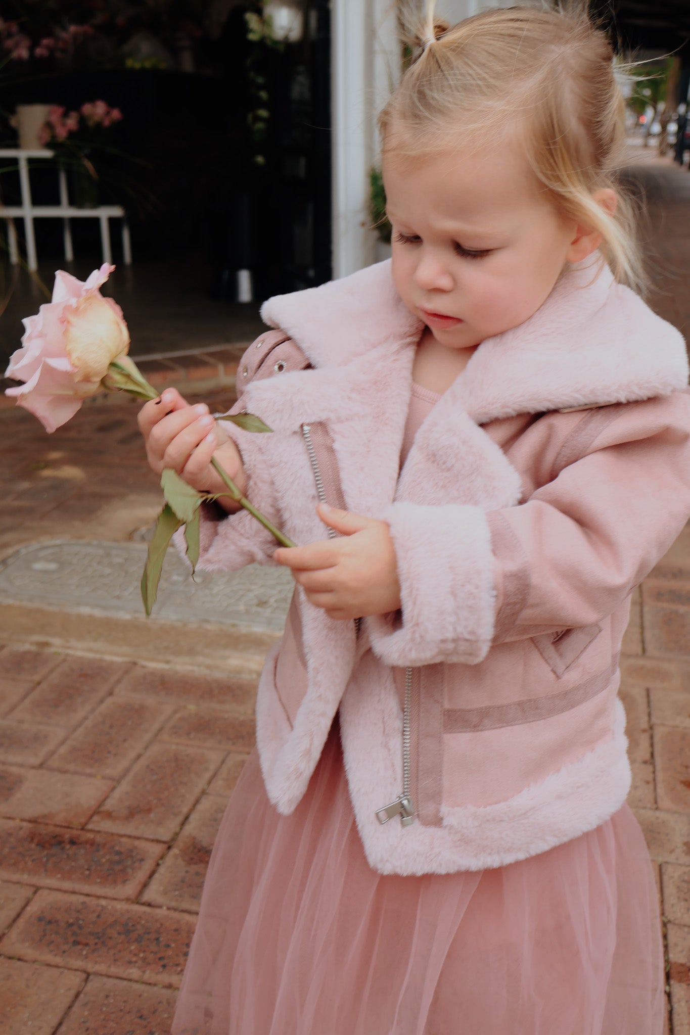 Meet the latest in our Mini Mode winter collection. The Lulu Biker Jacket in Dusty Pink. With its stunning soft faux fur interior lining, to faux suede panel detailing and zippers - this coat is designed to turn heads when your little one is on her way for a babycino.