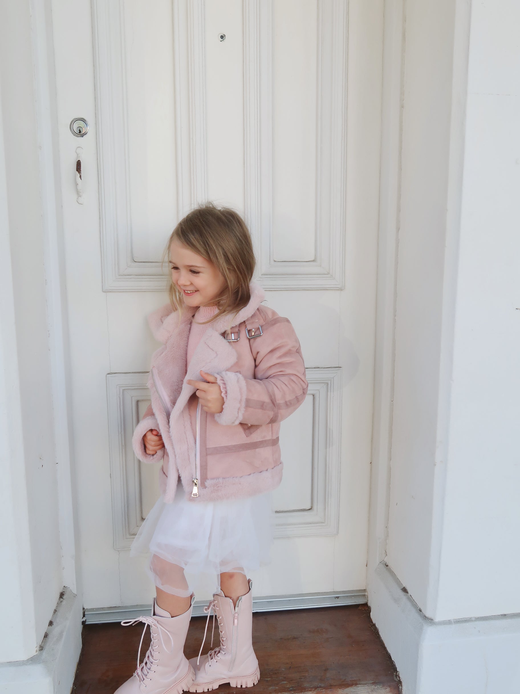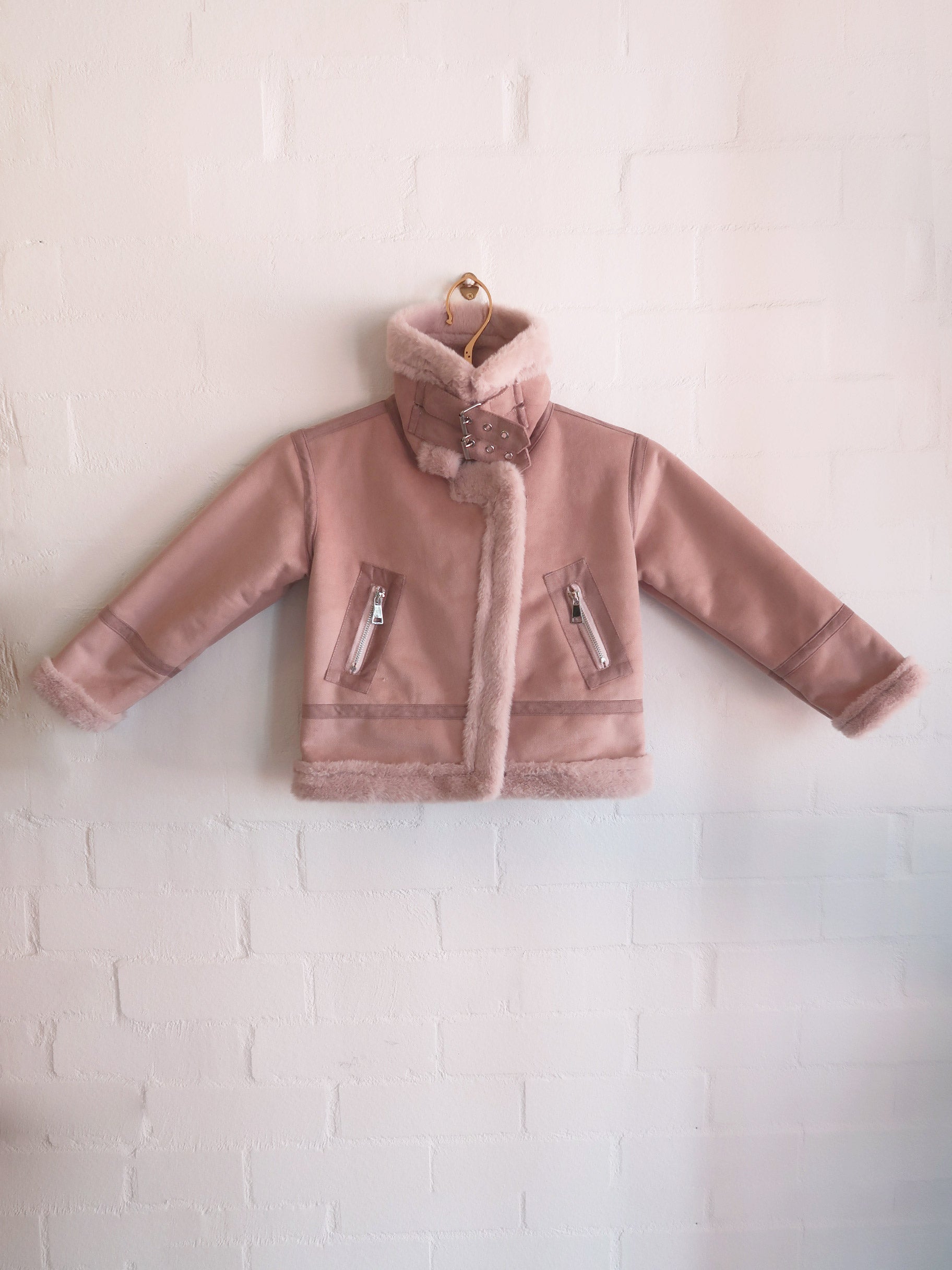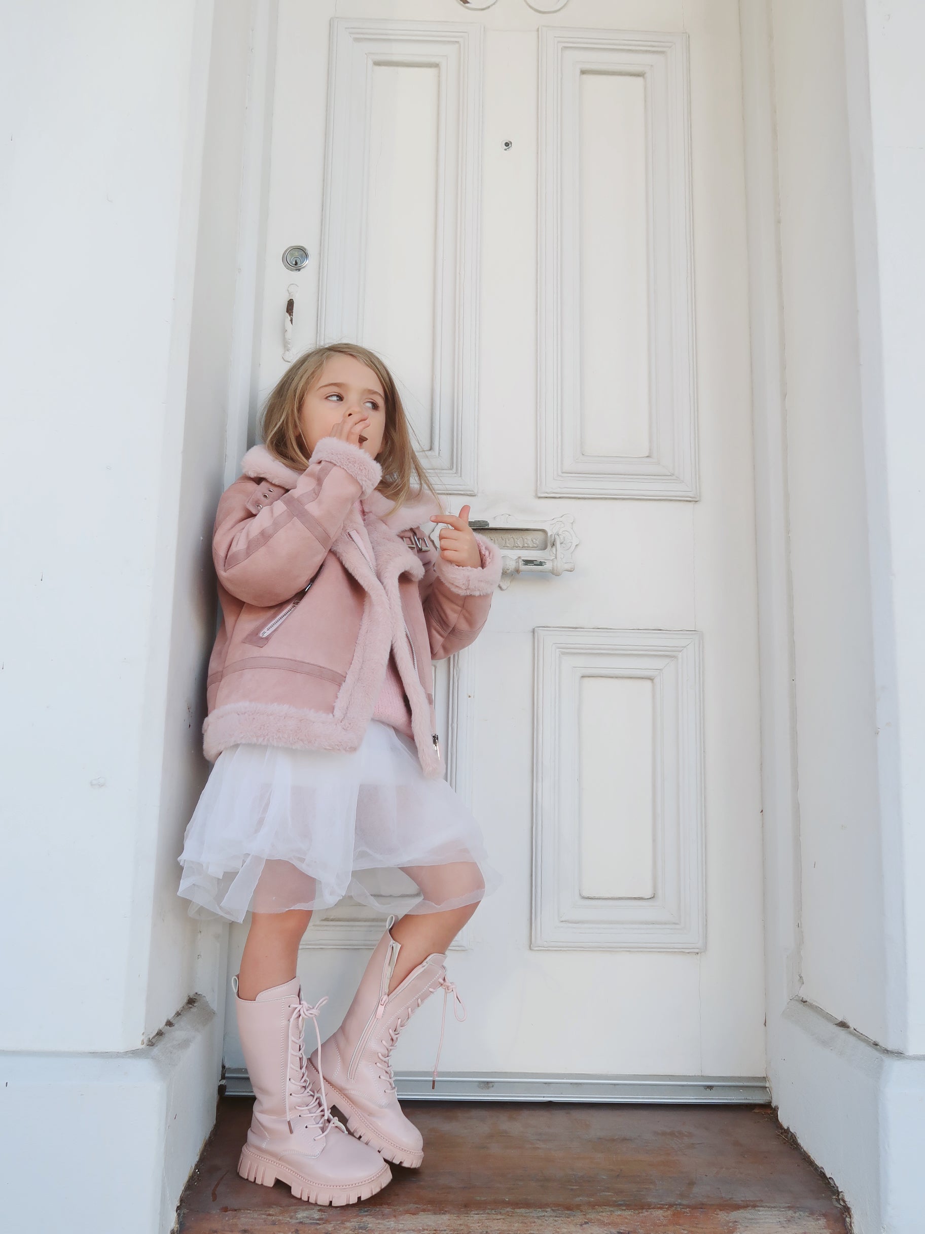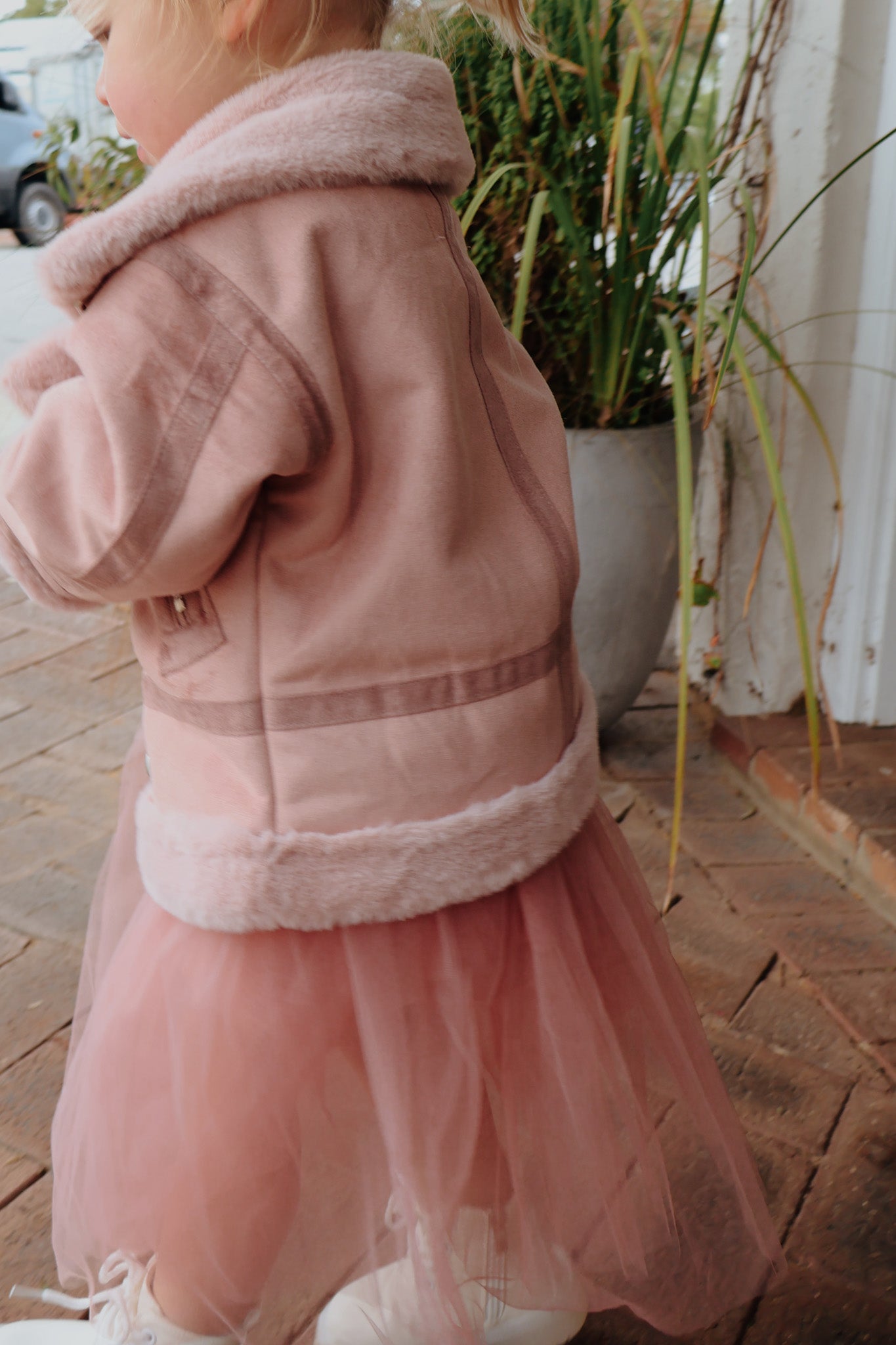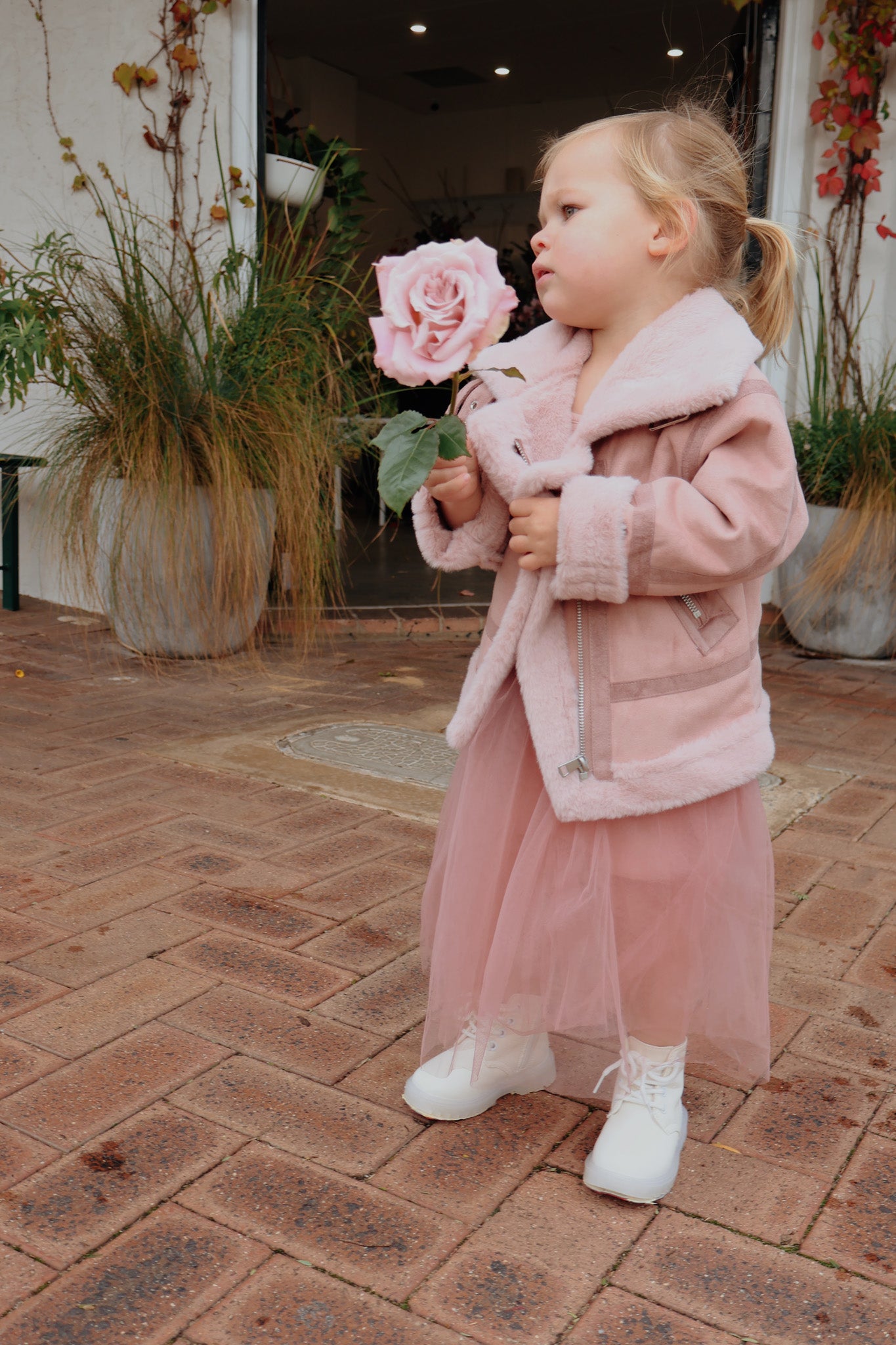 Meet the latest in our Mini Mode winter collection. The Lulu Biker Jacket in Dusty Pink. With its stunning soft faux fur interior lining, to faux suede panel detailing and zippers - this coat is designed to turn heads when your little one is on her way for a babycino.