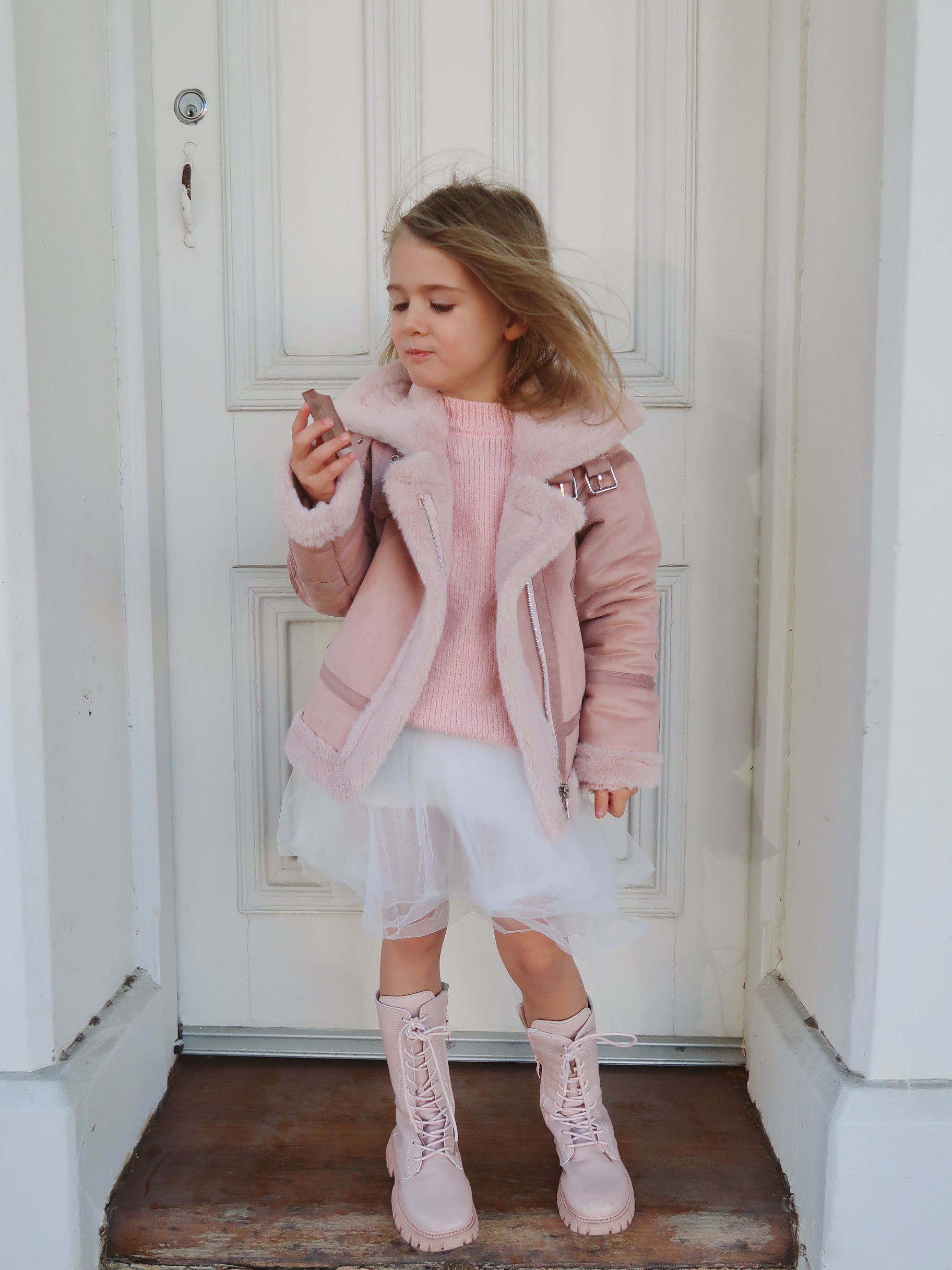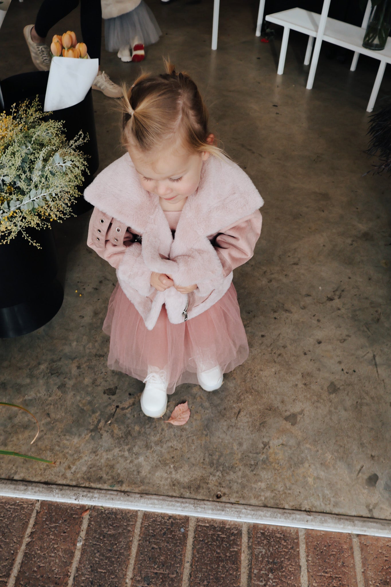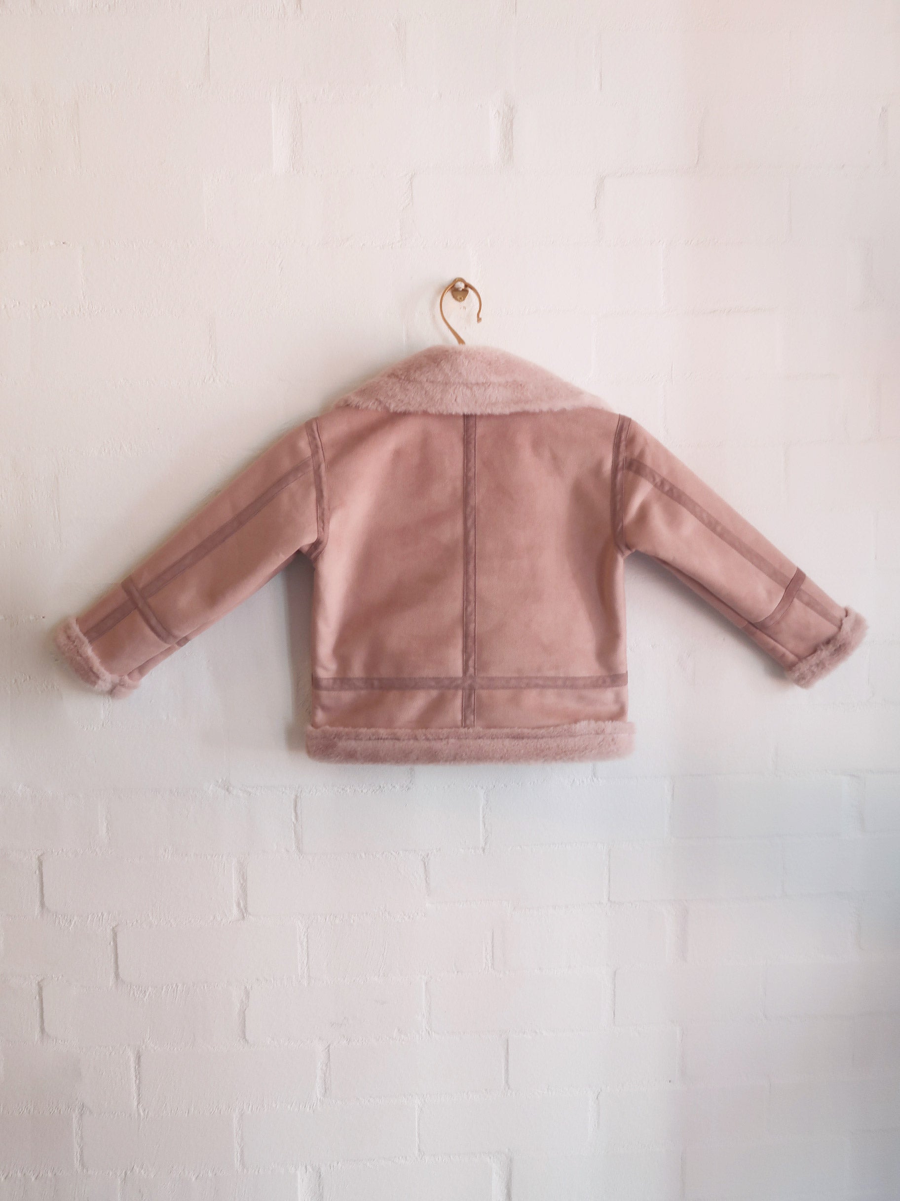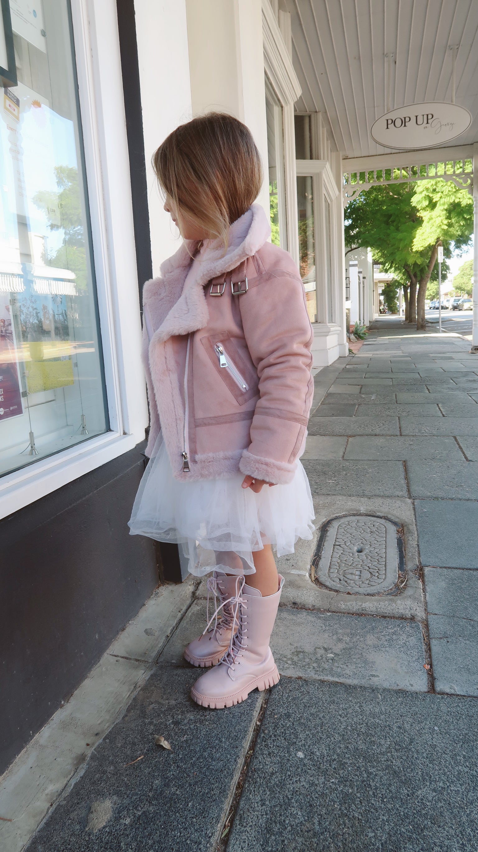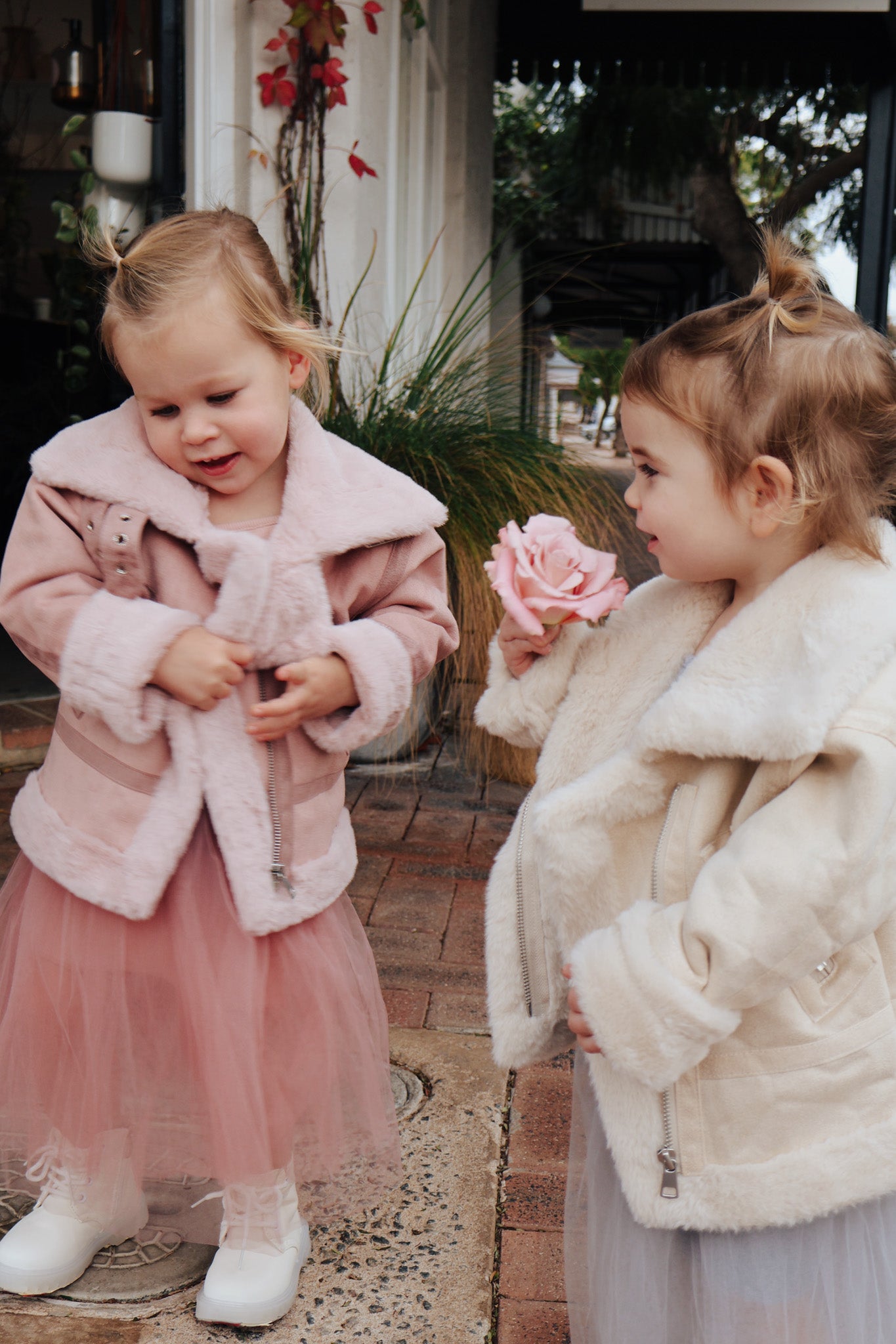 Meet the latest in our Mini Mode winter collection. The Lulu Biker Jacket in Dusty Pink. With its stunning soft faux fur interior lining, to faux suede panel detailing and zippers - this coat is designed to turn heads when your little one is on her way for a babycino.
