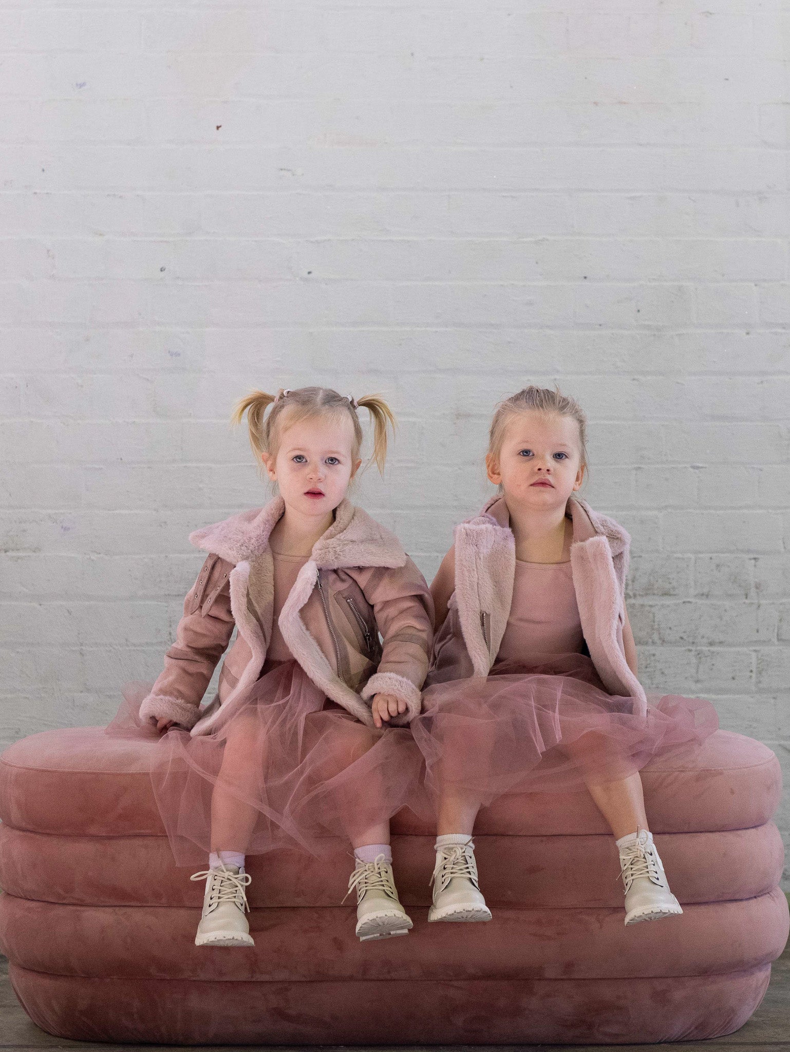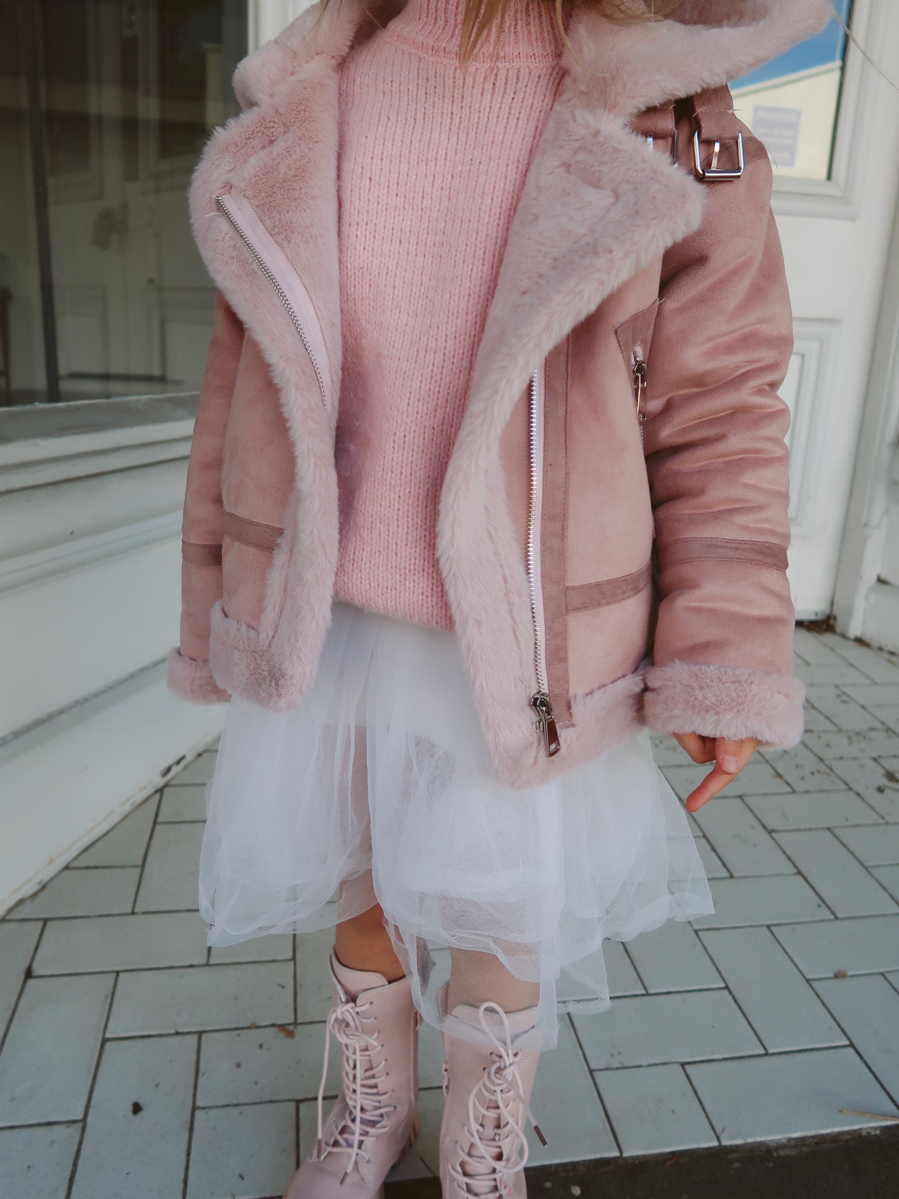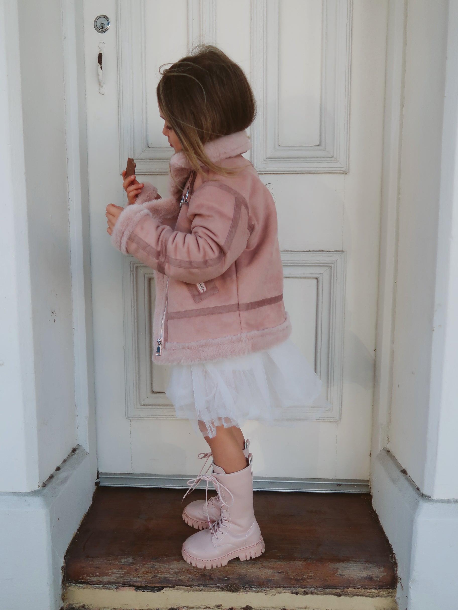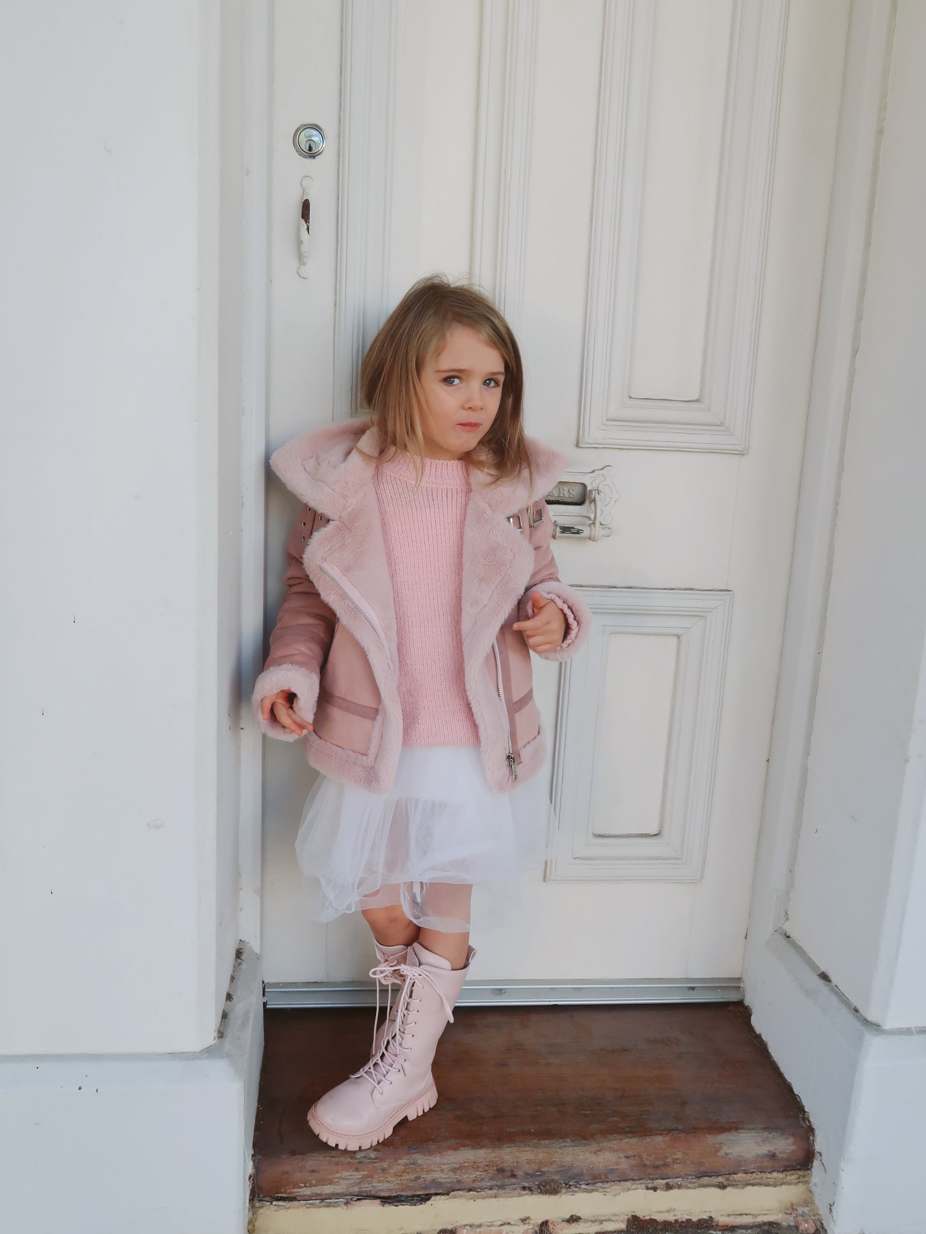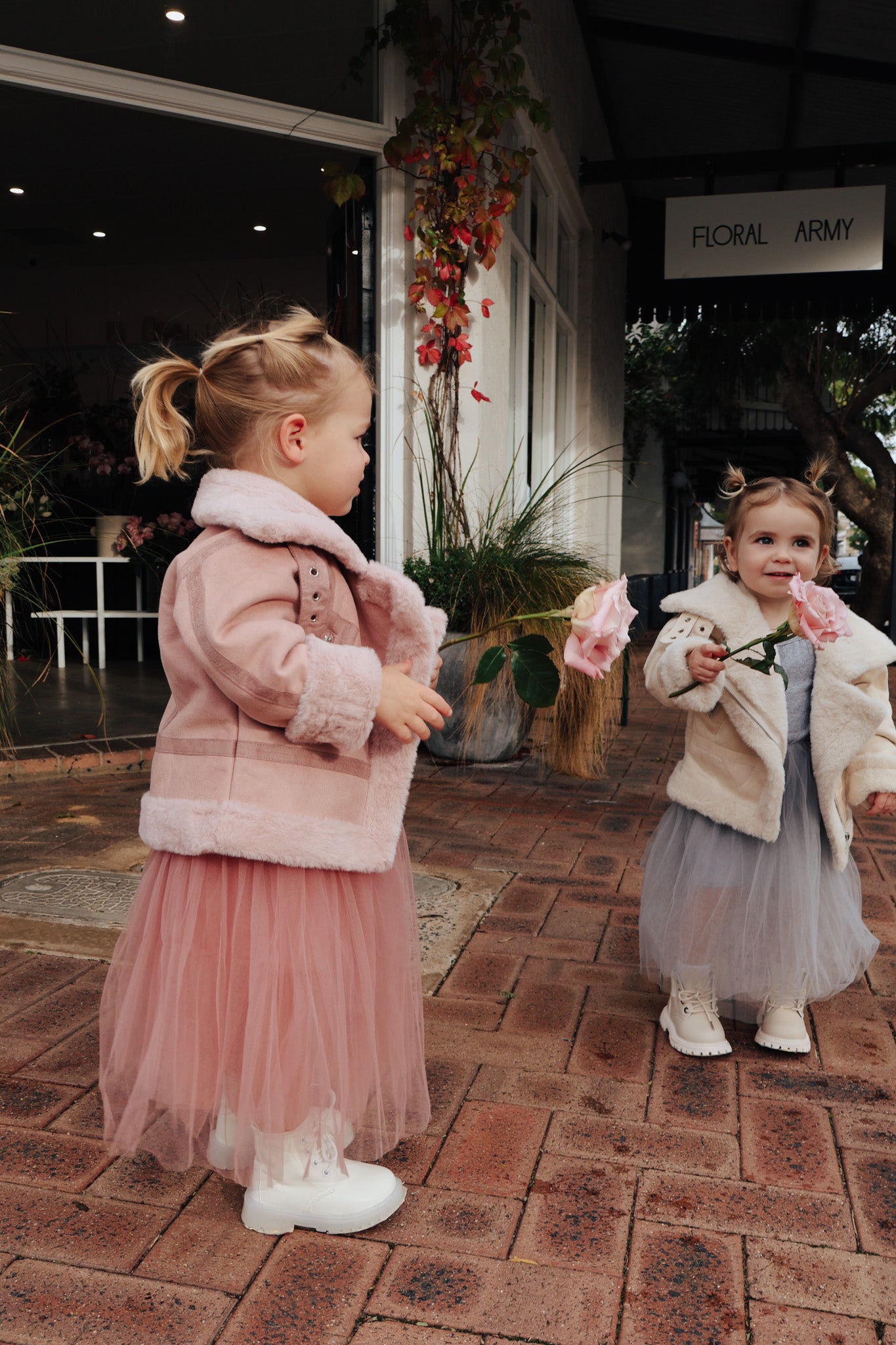 Meet the latest in our Mini Mode winter collection. The Lulu Biker Jacket in Dusty Pink. With its stunning soft faux fur interior lining, to faux suede panel detailing and zippers - this coat is designed to turn heads when your little one is on her way for a babycino.