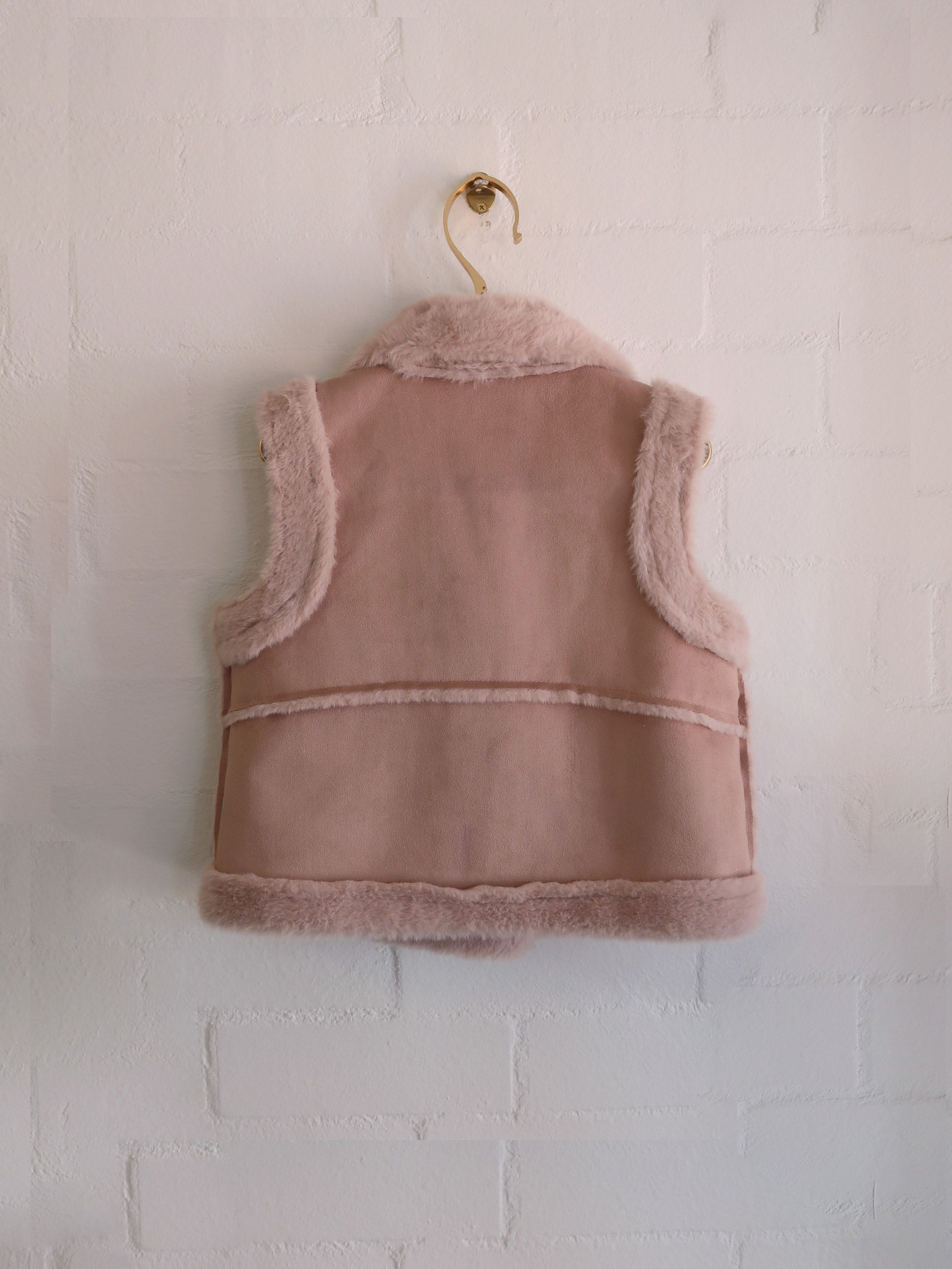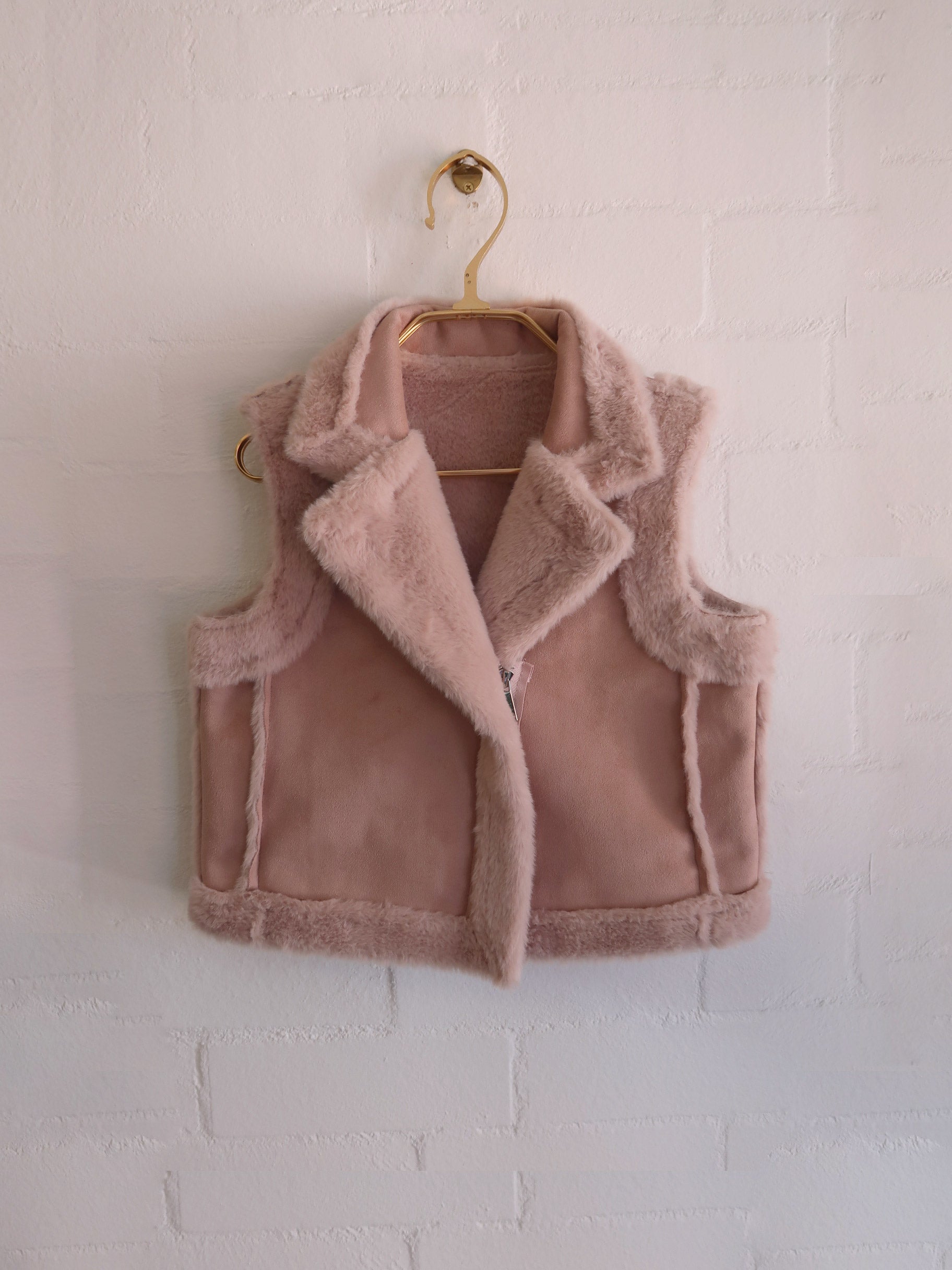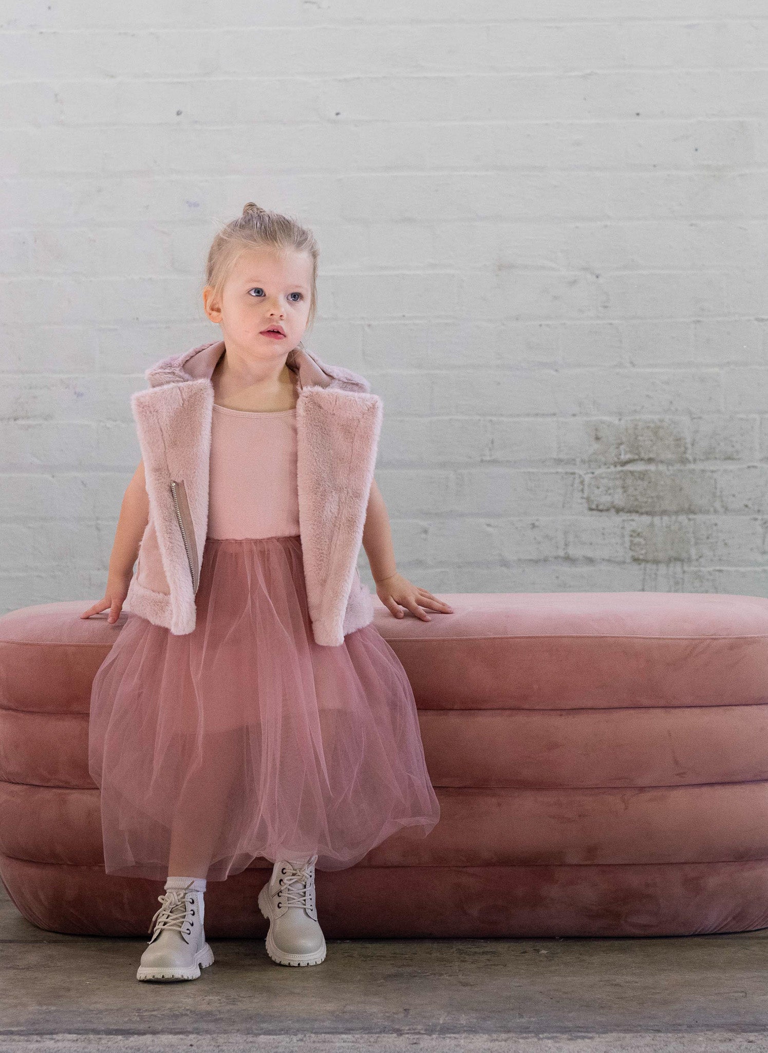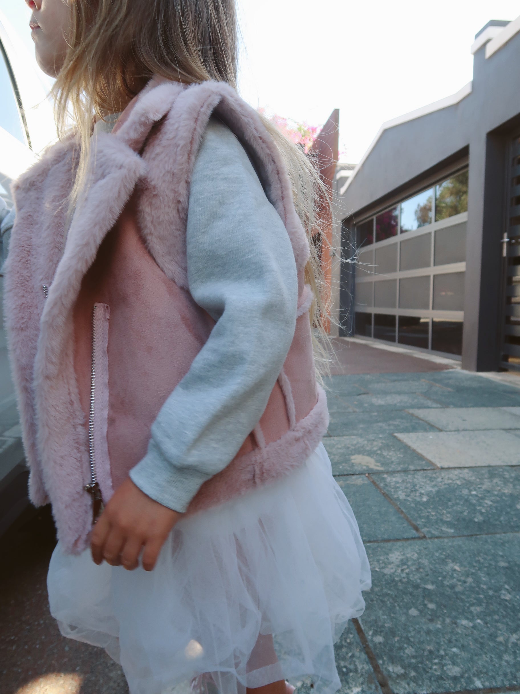 Meet the latest in our Mini Mode winter collection. The Lulu Biker Vest in Dusty Pink. With its stunning soft faux fur interior lining, to faux suede panel detailing and zippers - this coat is designed to turn heads when your little one is on her way for a babycino.