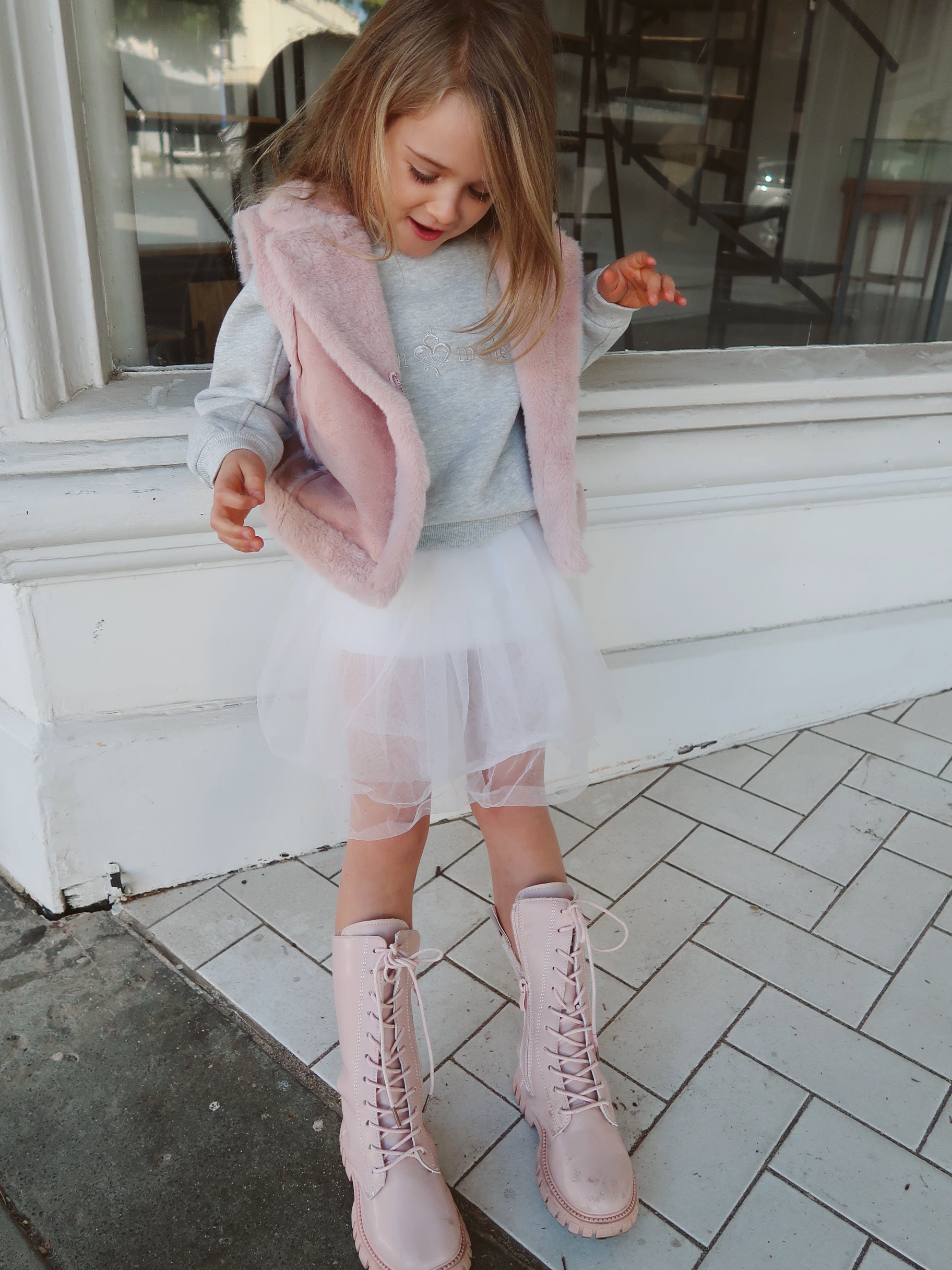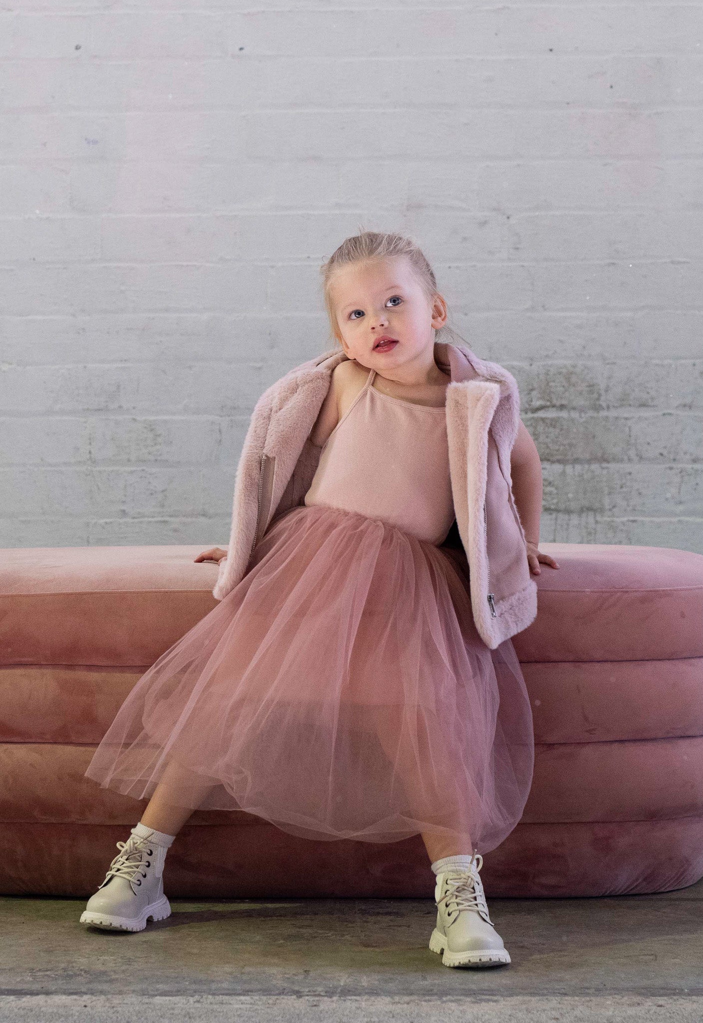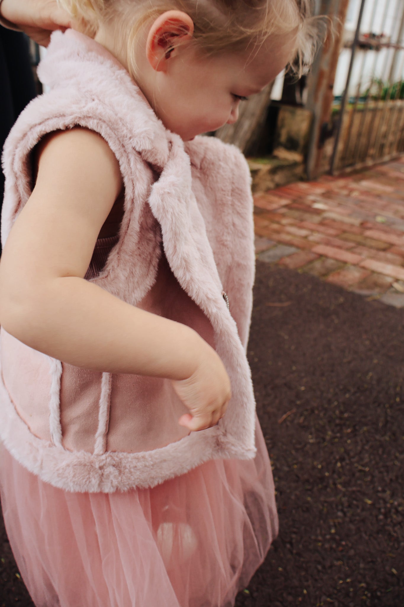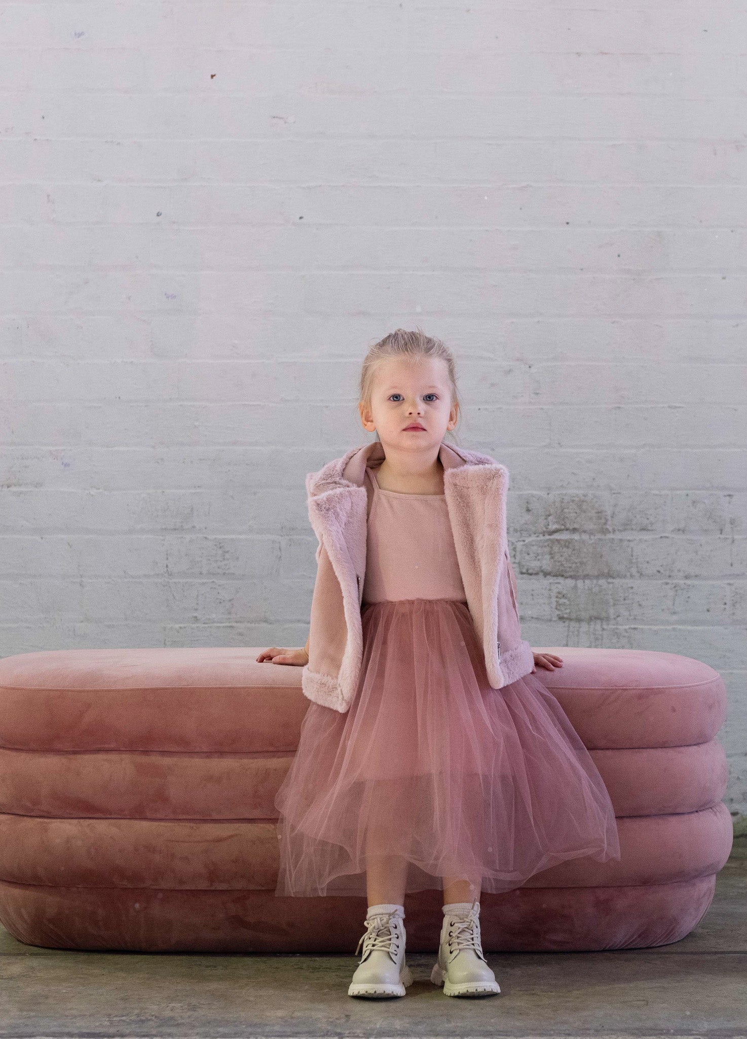 Meet the latest in our Mini Mode winter collection. The Lulu Biker Vest in Dusty Pink. With its stunning soft faux fur interior lining, to faux suede panel detailing and zippers - this coat is designed to turn heads when your little one is on her way for a babycino.
