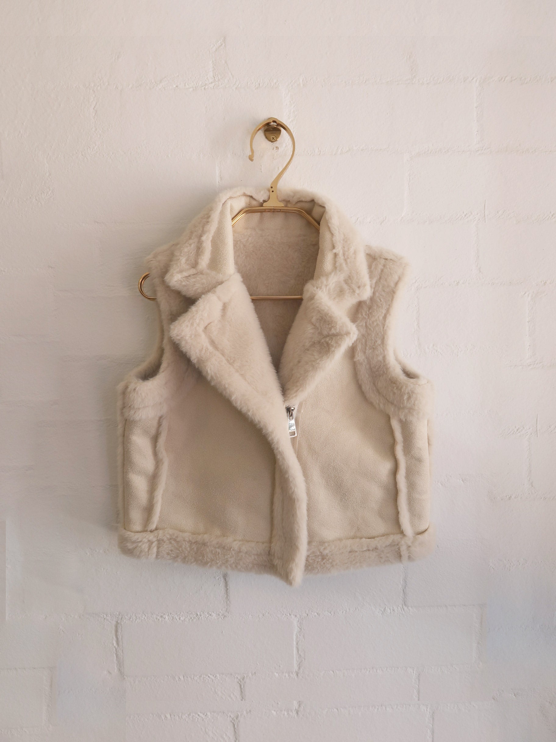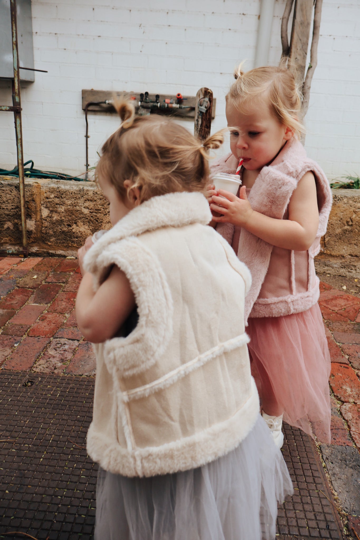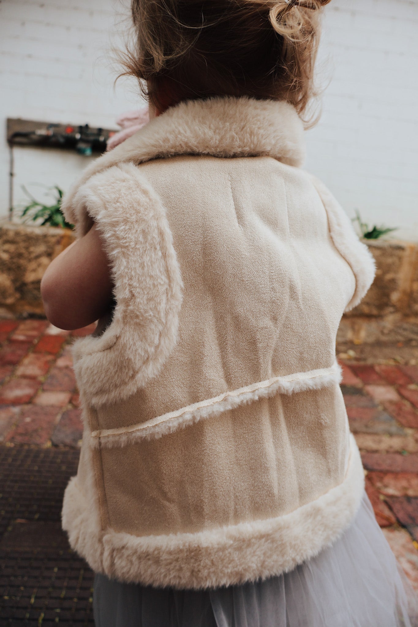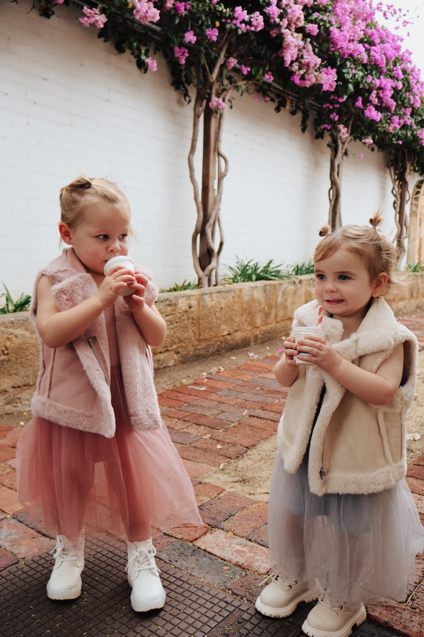 Meet the latest in our Mini Mode winter collection. The Lulu Biker Vest. With its stunning soft faux fur interior lining, to faux suede panel detailing and zippers - this coat is designed to turn heads when your little one is on her way for a babycino.