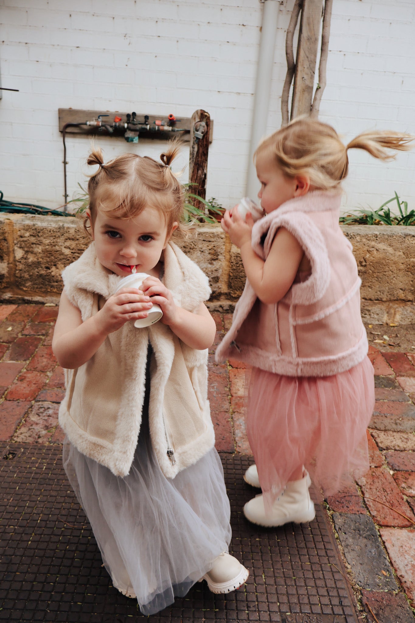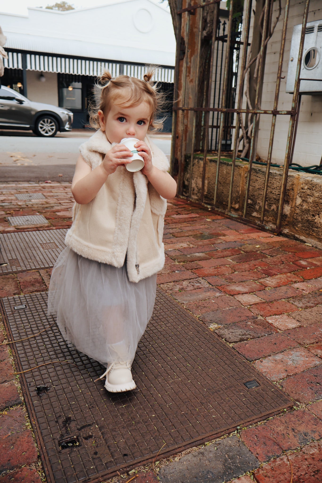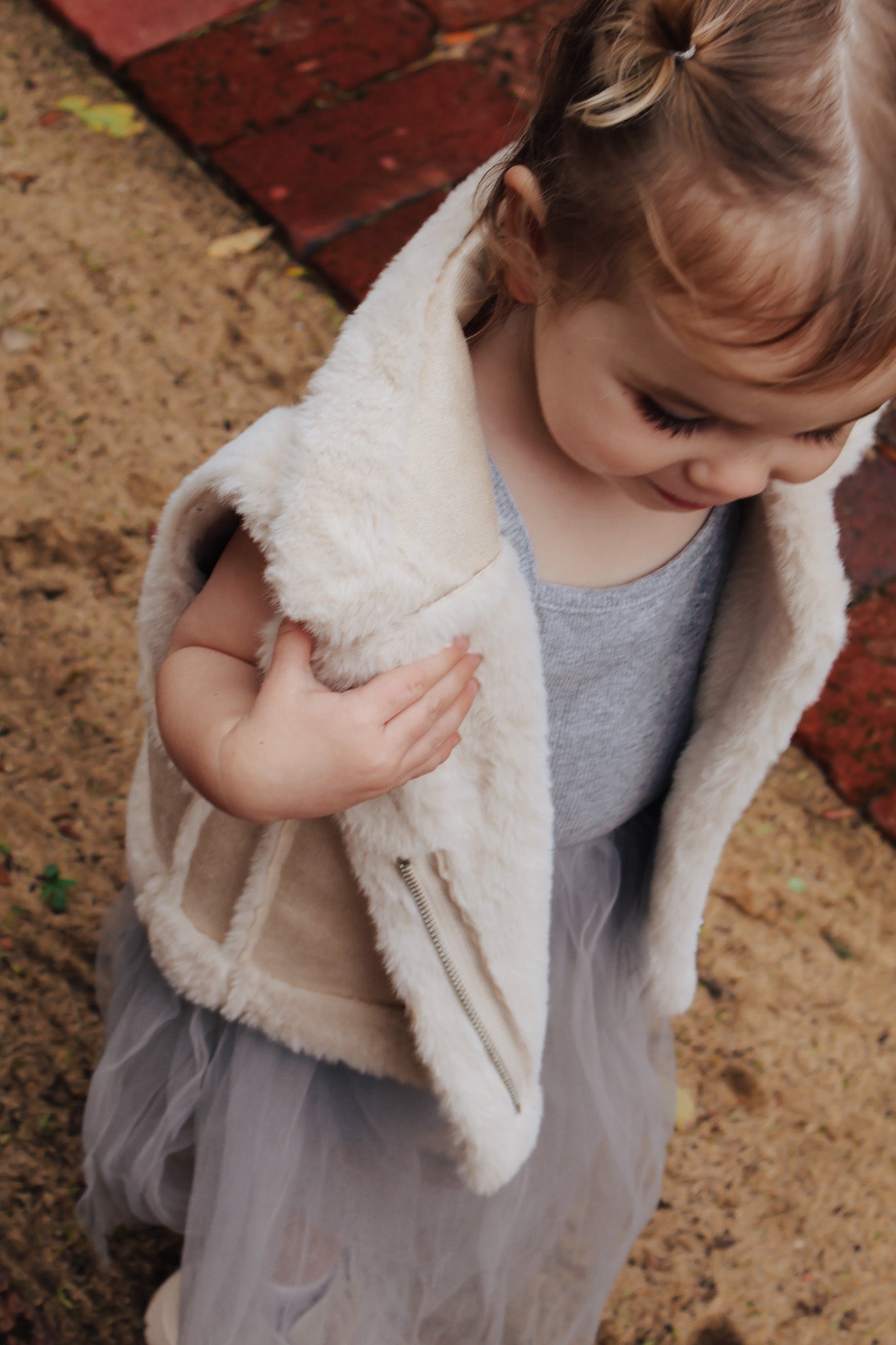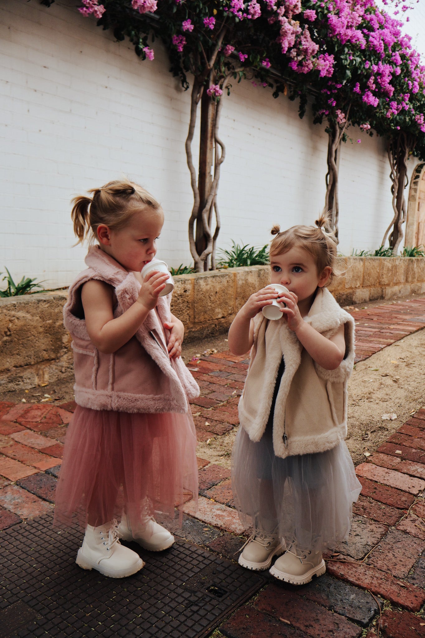 Meet the latest in our Mini Mode winter collection. The Lulu Biker Vest. With its stunning soft faux fur interior lining, to faux suede panel detailing and zippers - this coat is designed to turn heads when your little one is on her way for a babycino.