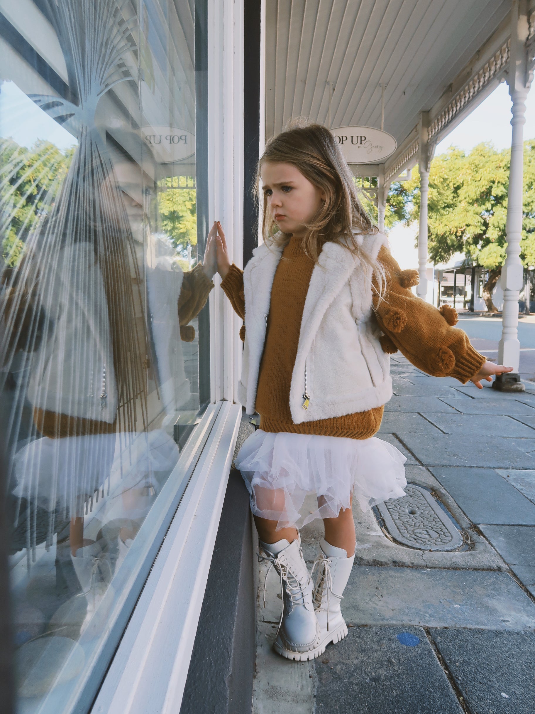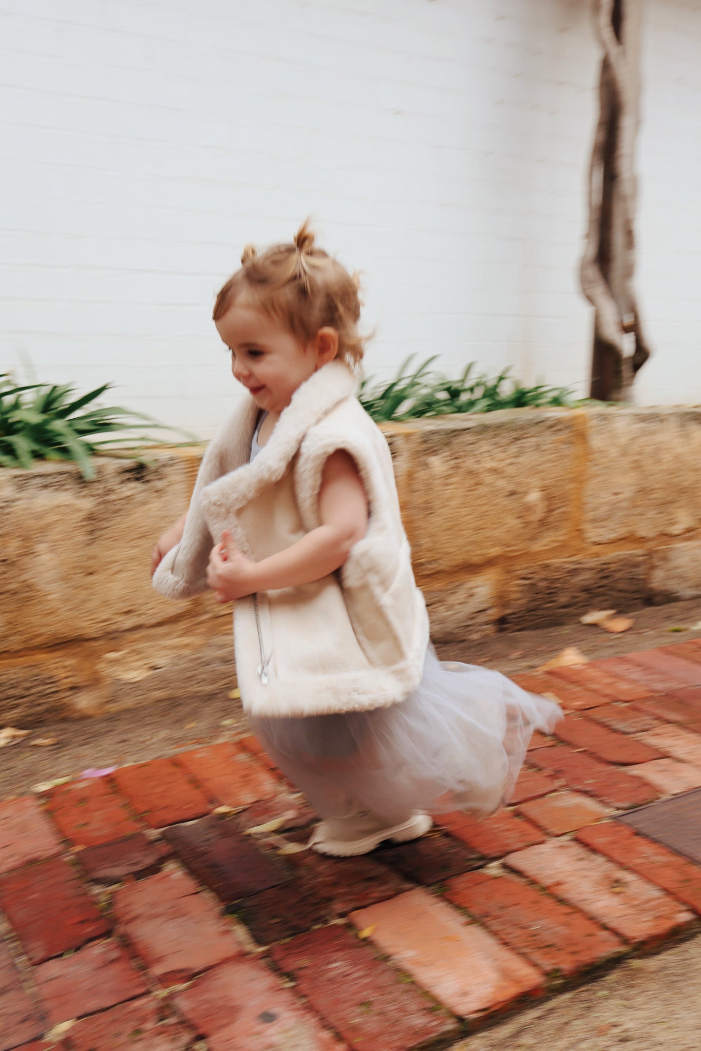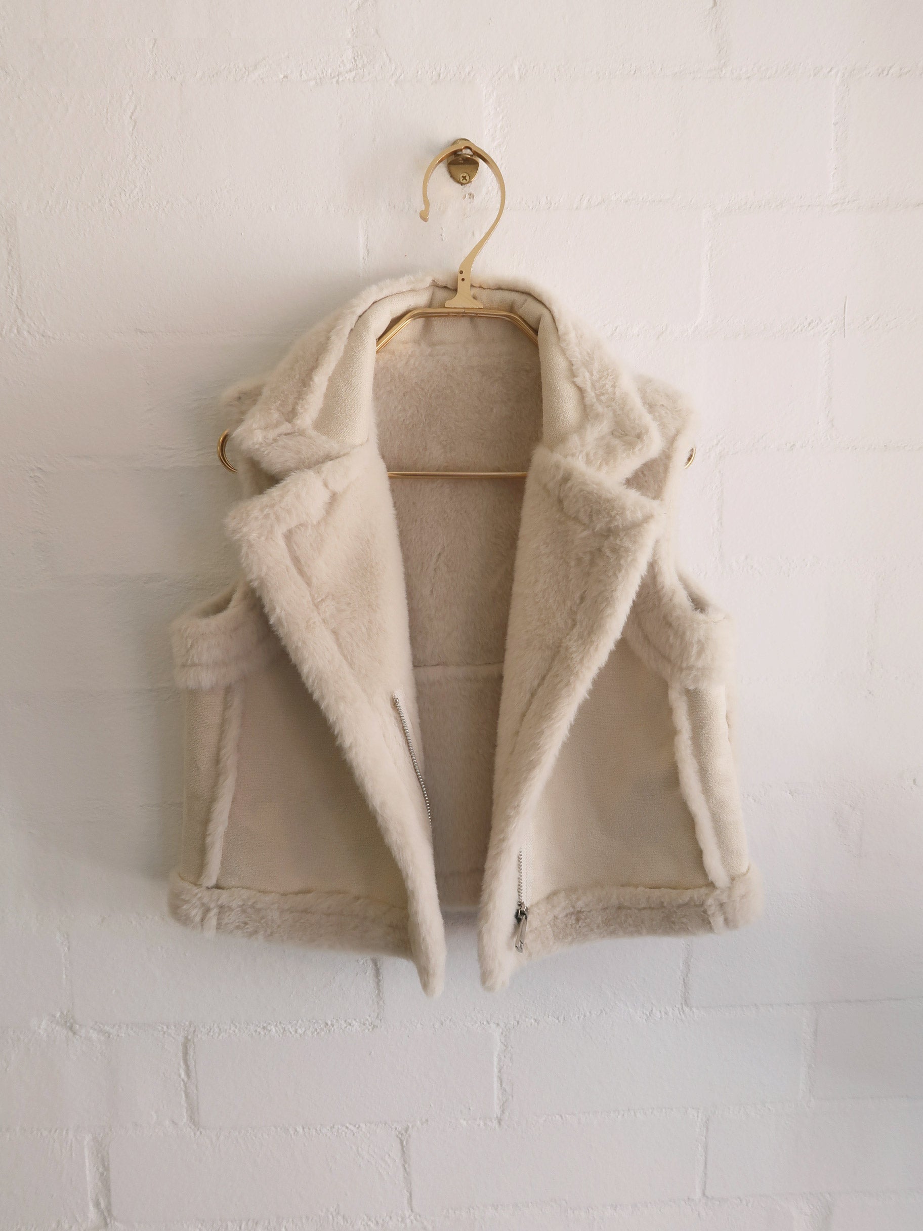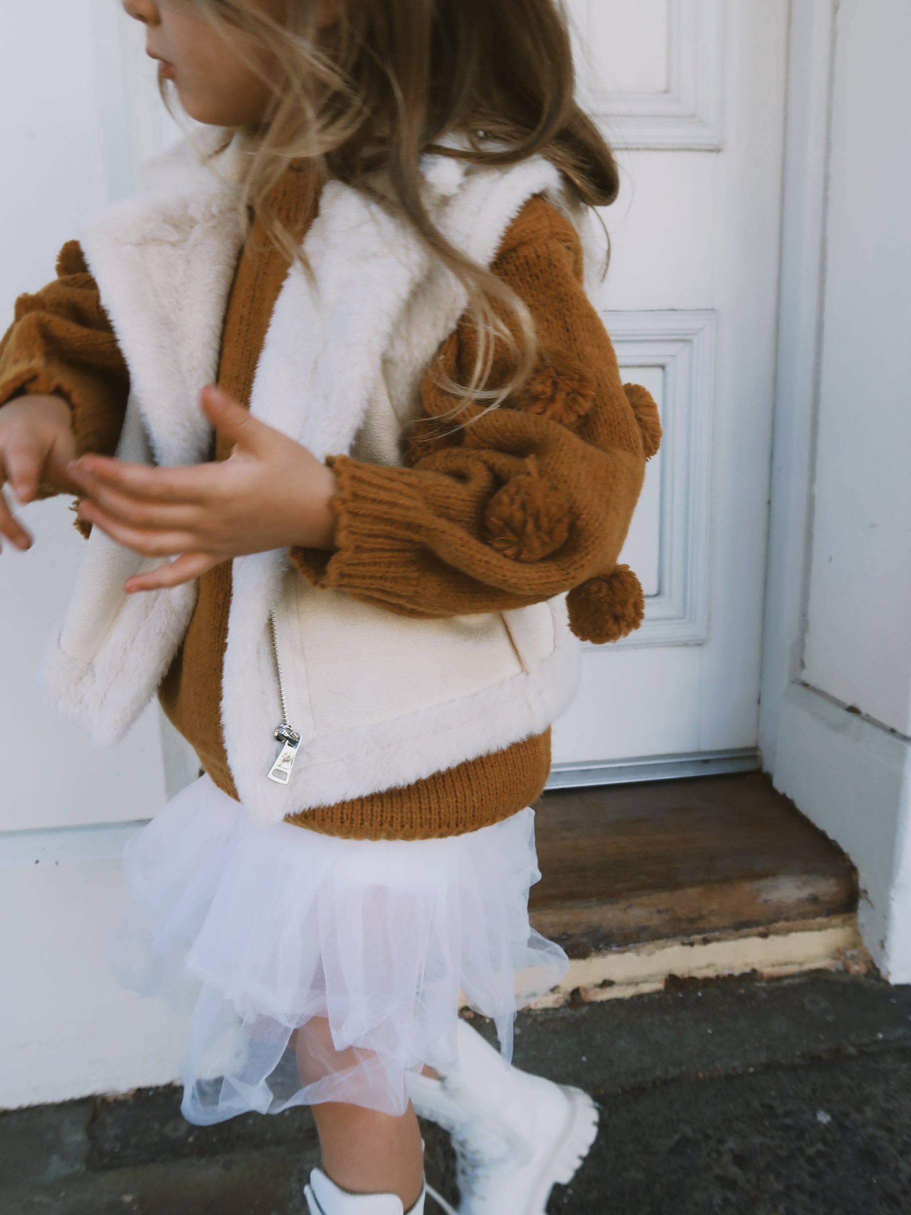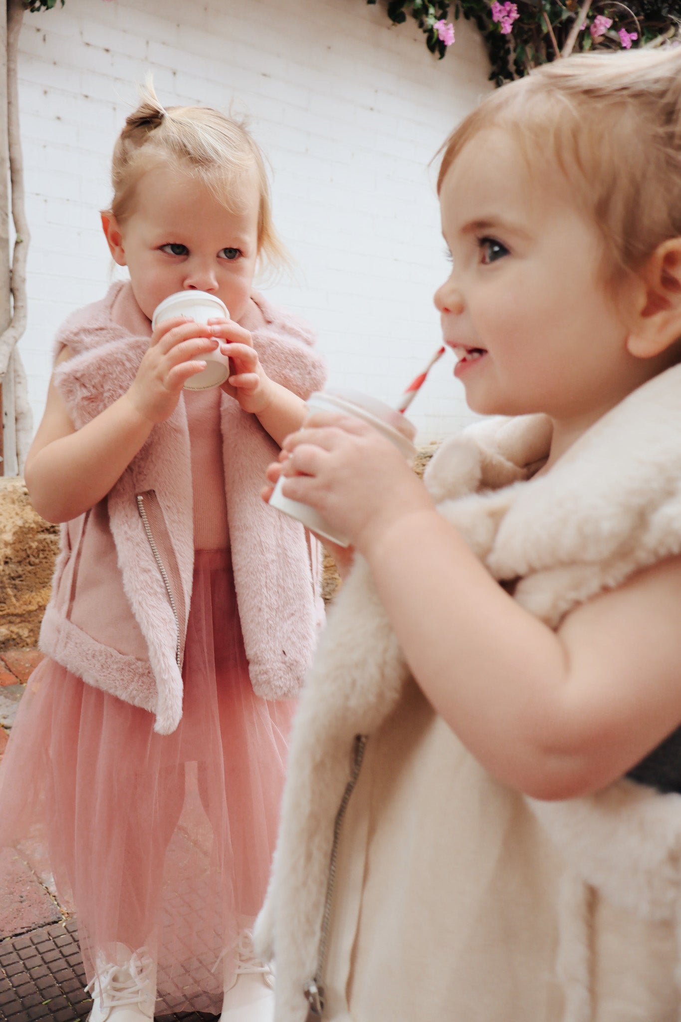Meet the latest in our Mini Mode winter collection. The Lulu Biker Vest. With its stunning soft faux fur interior lining, to faux suede panel detailing and zippers - this coat is designed to turn heads when your little one is on her way for a babycino.