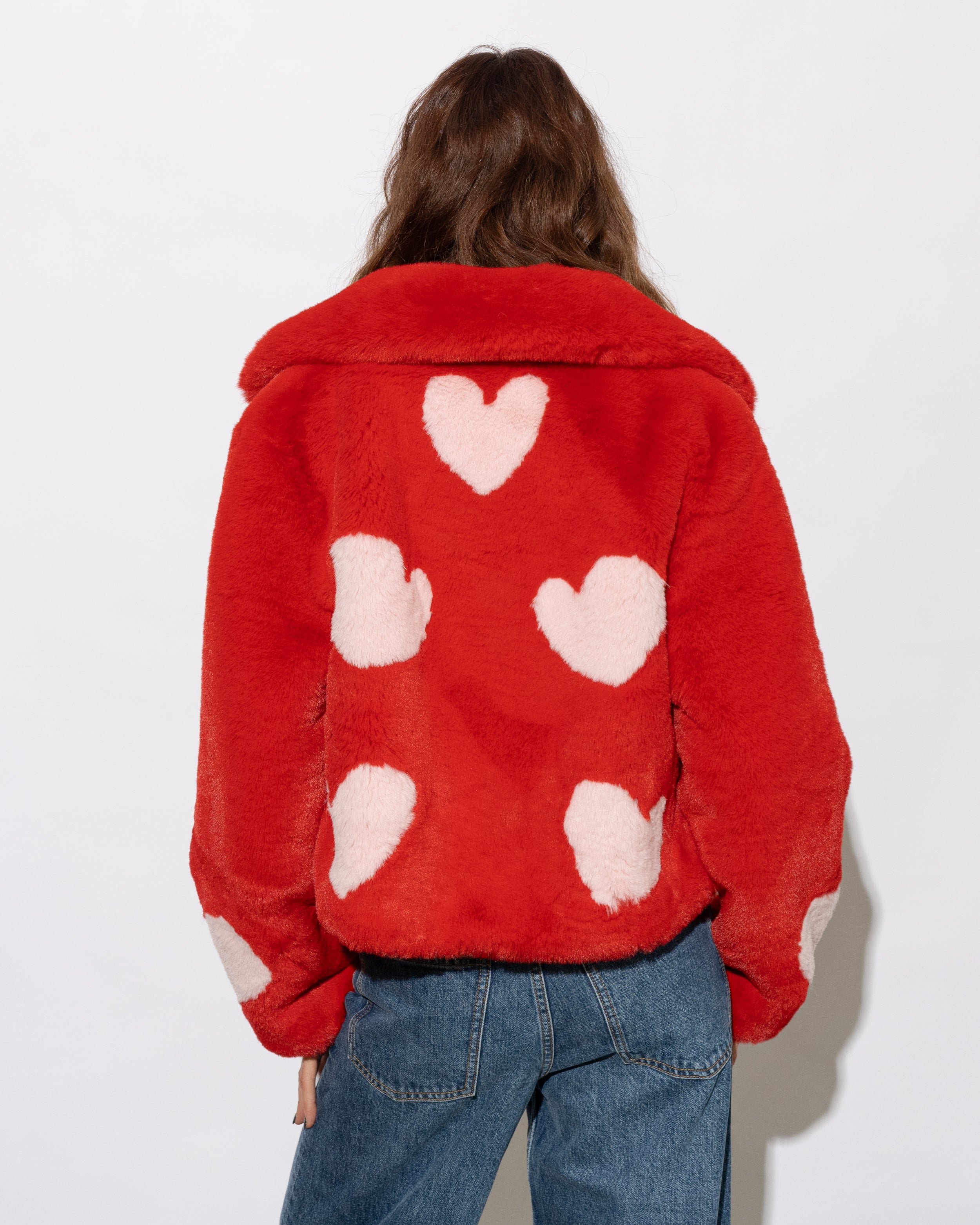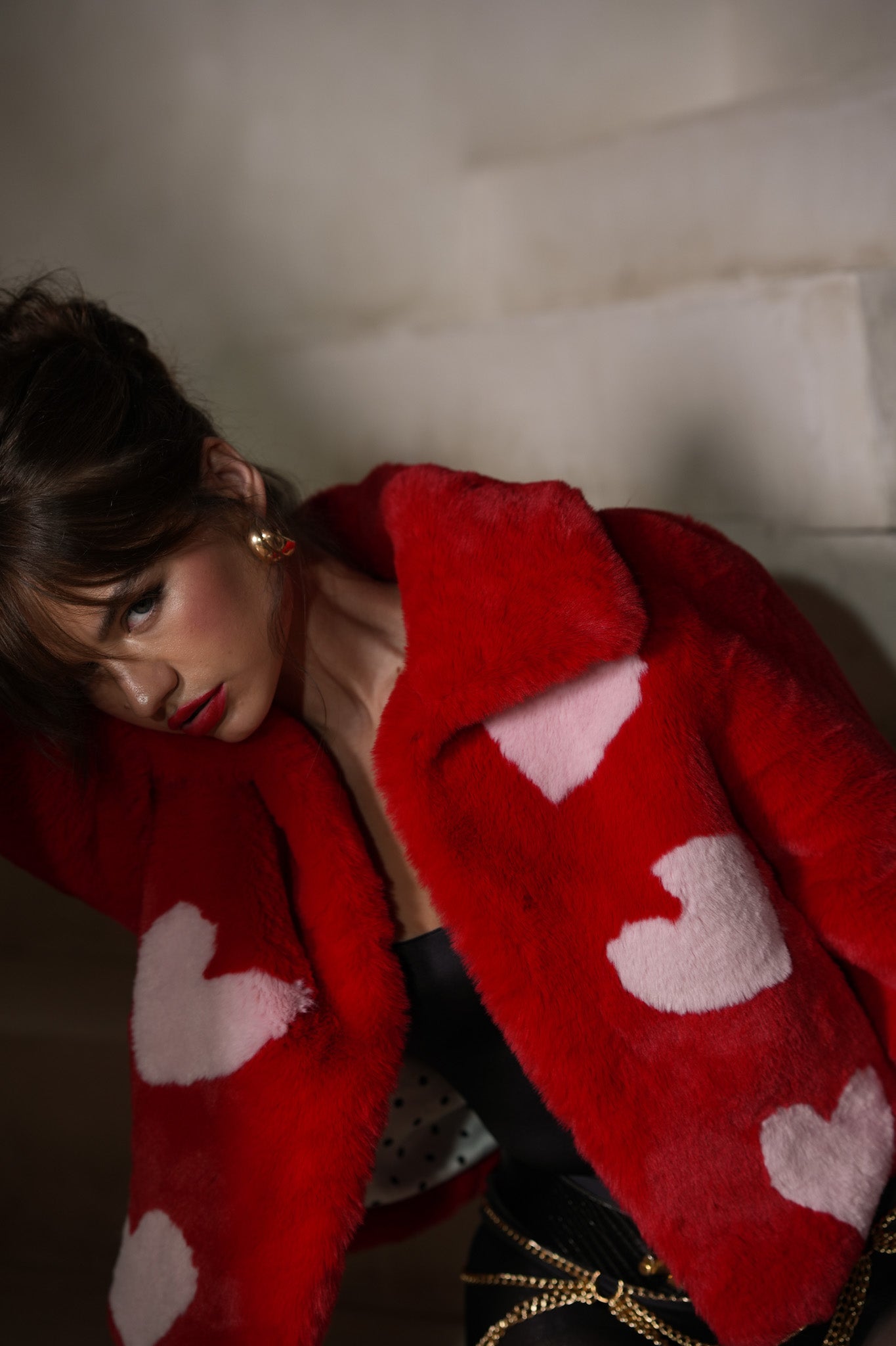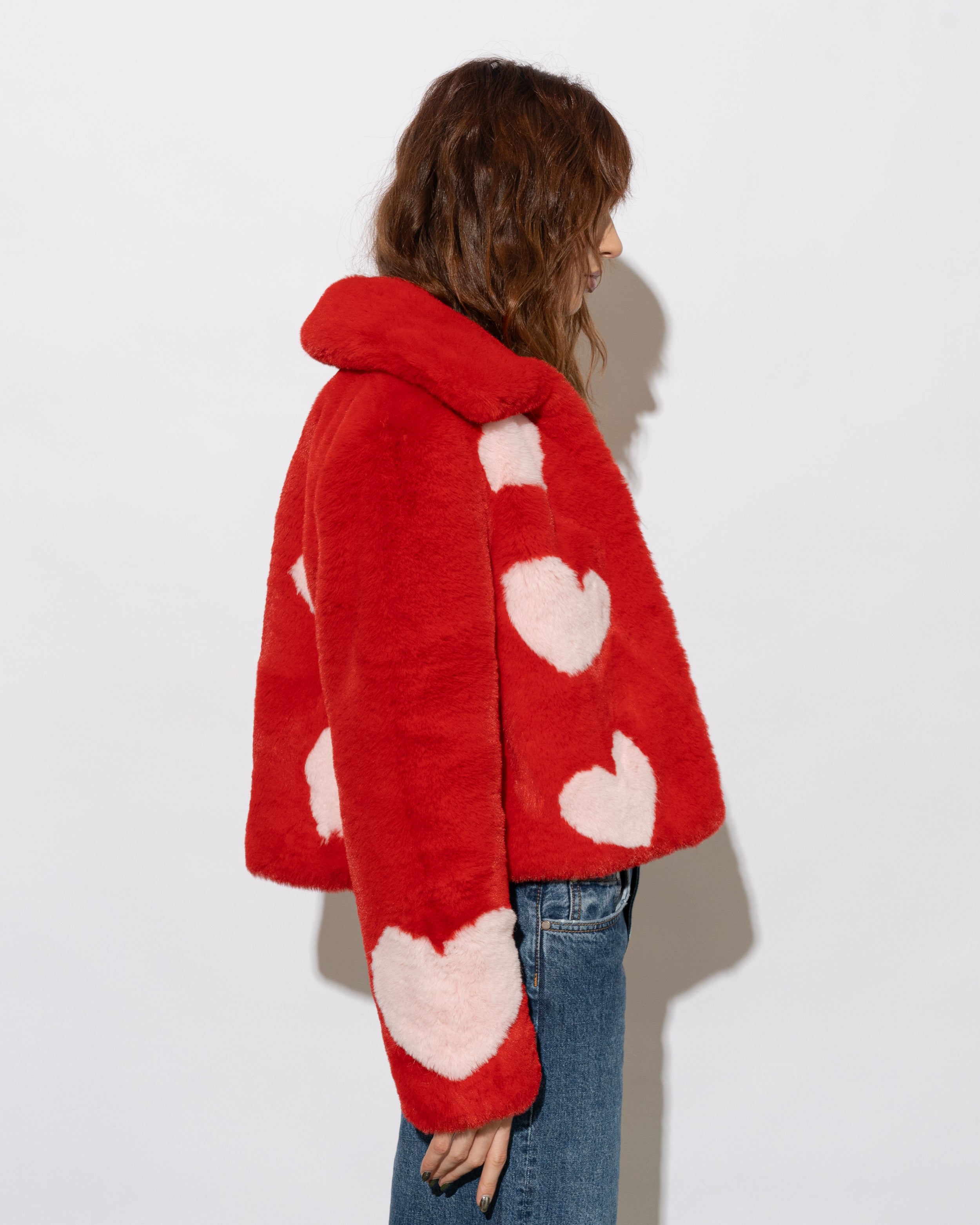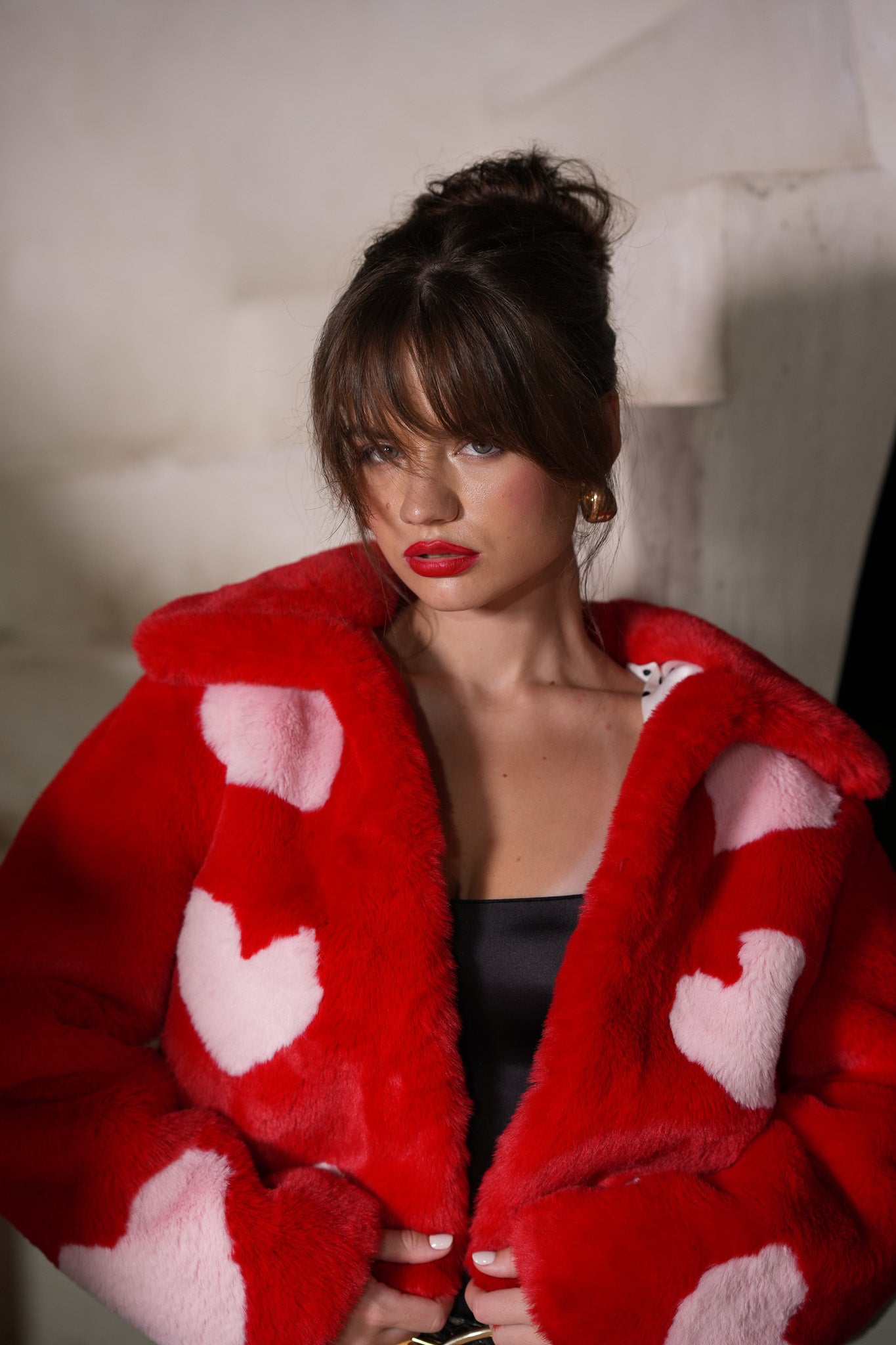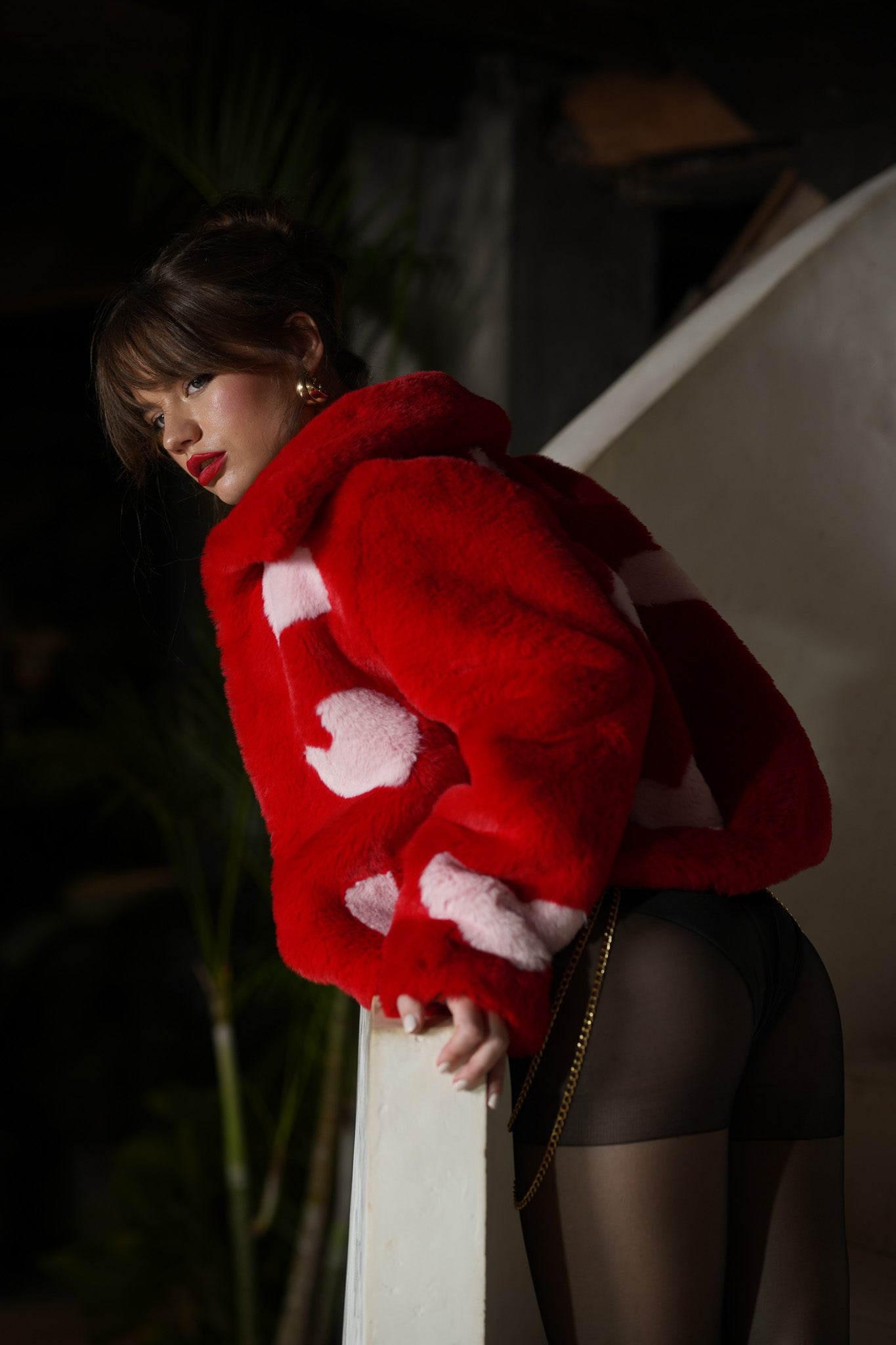 Wear your heart on your sleeve (literally!) in the Queen Of Hearts Faux Mid Coat. We've emulated our magnificent Queen of Hearts pink fur coat and created this enchanting faux mid coat version just for you. Equal part feminine and rockstar glam, this charismatic piece will turn heads this winter.