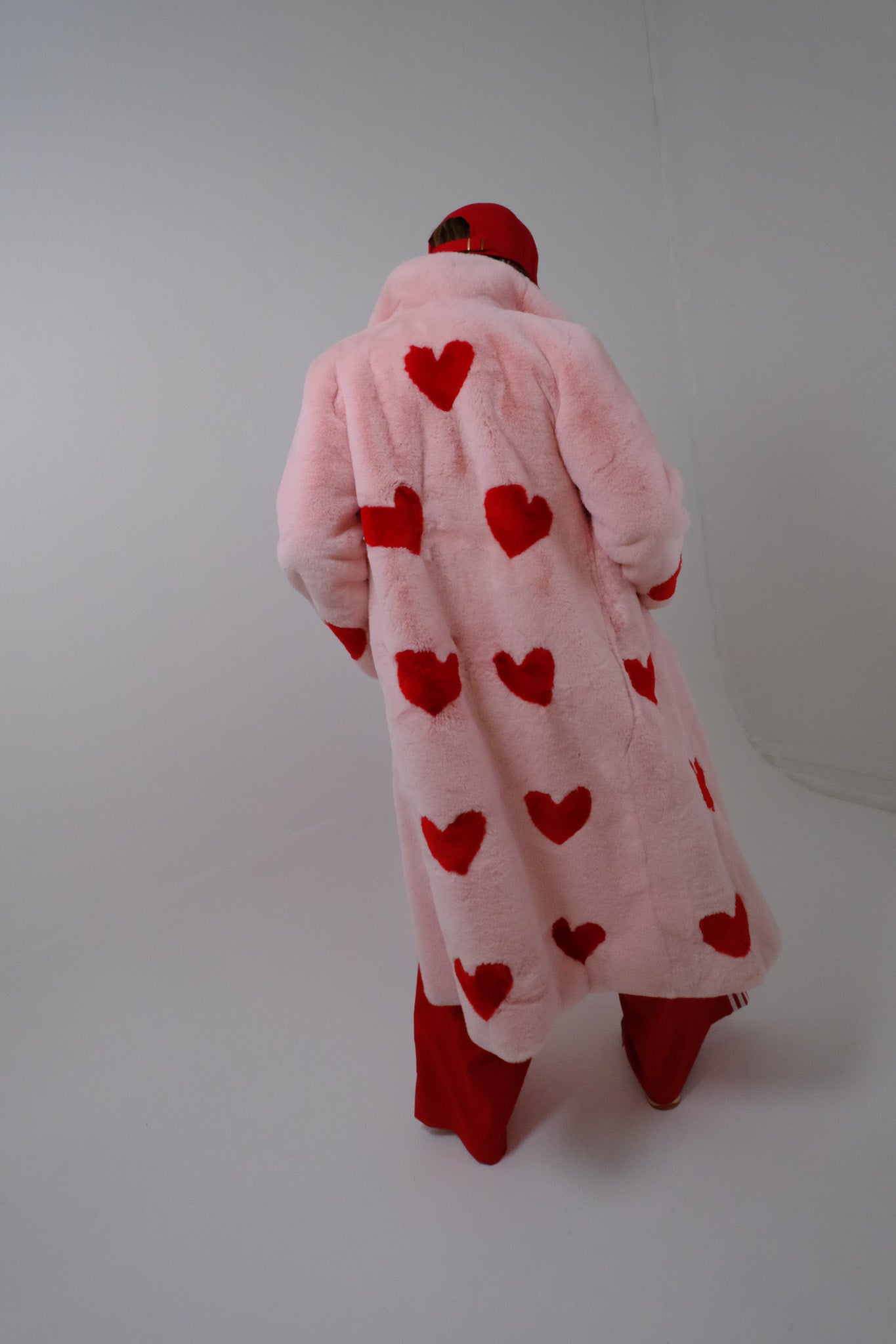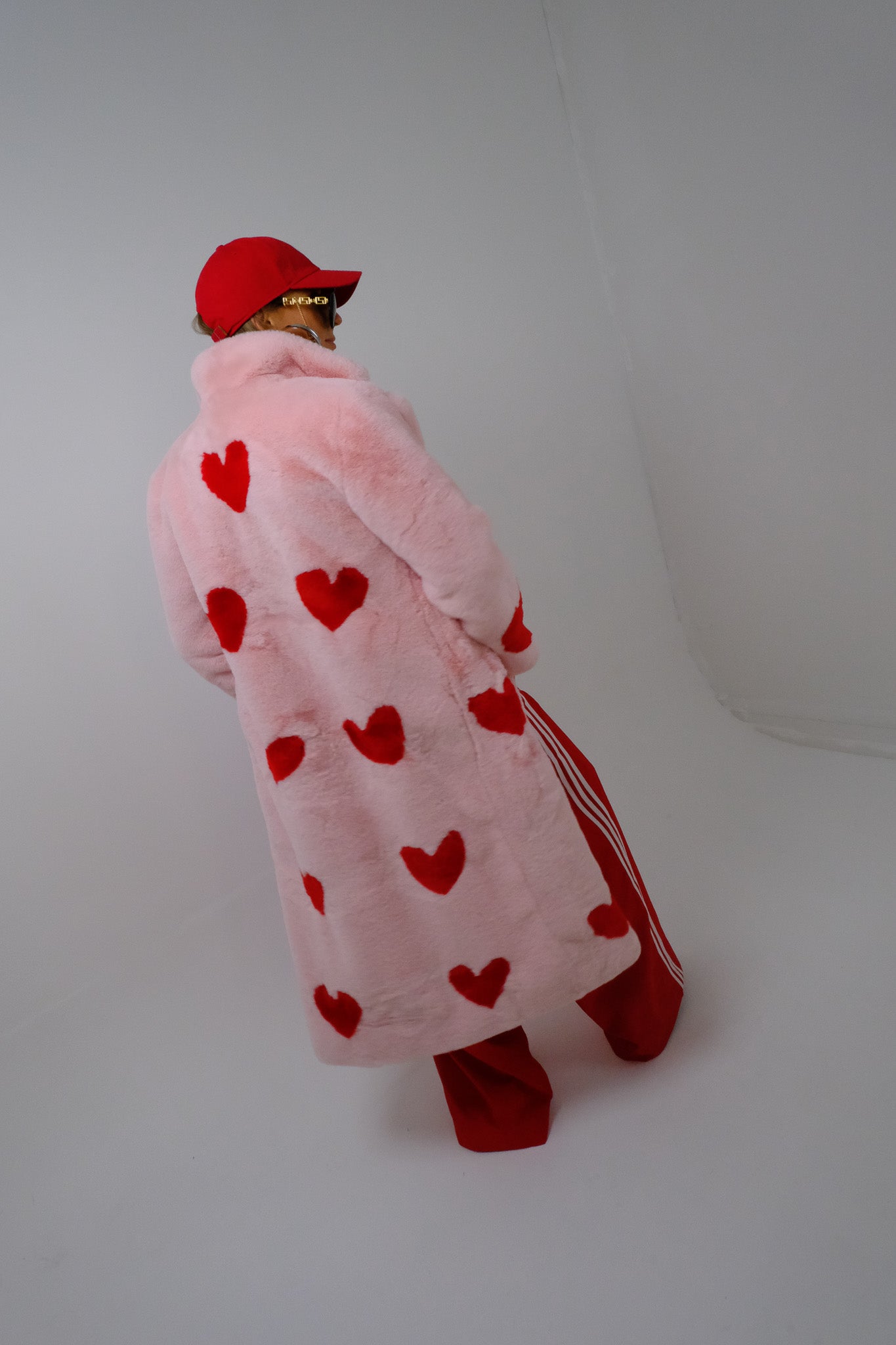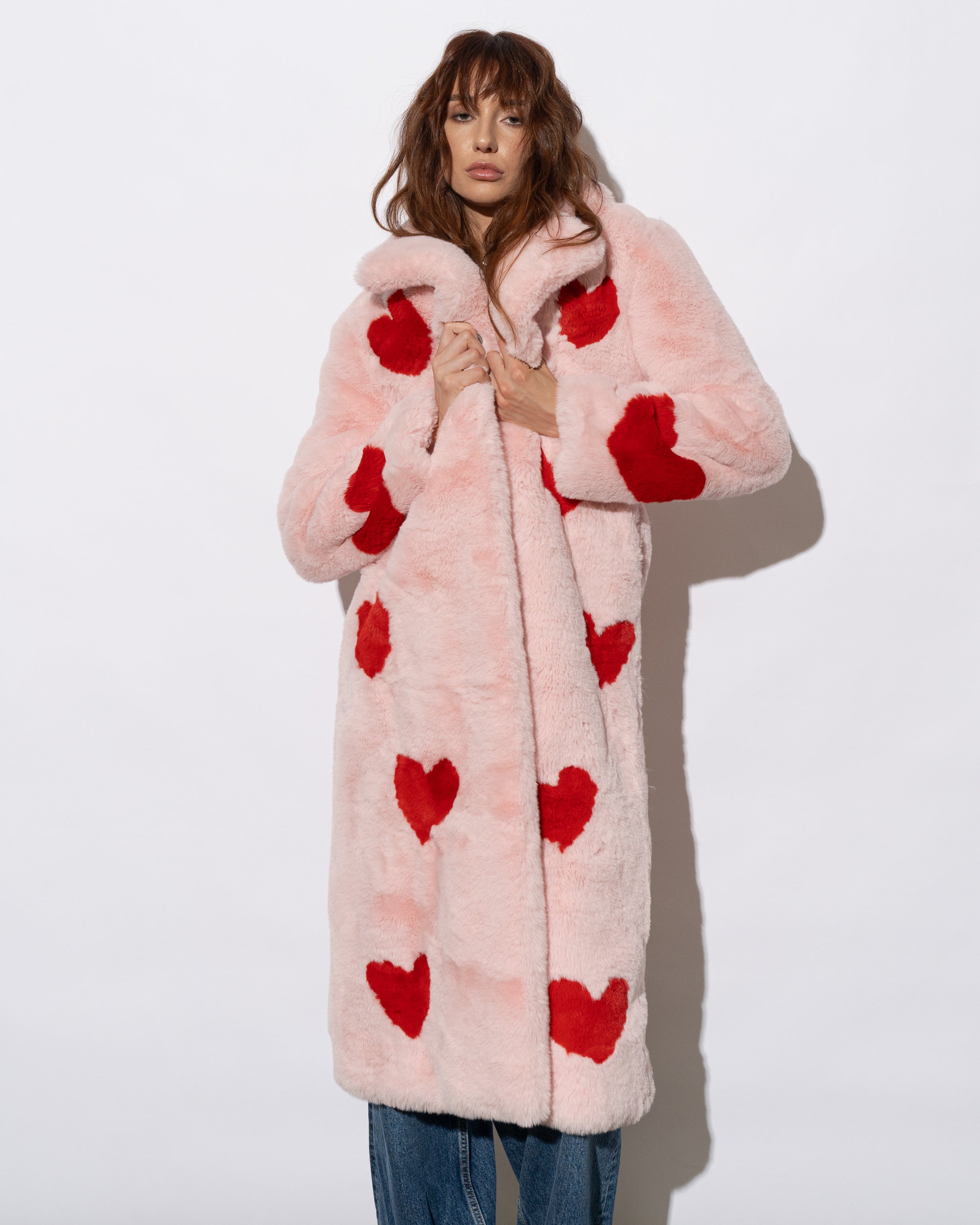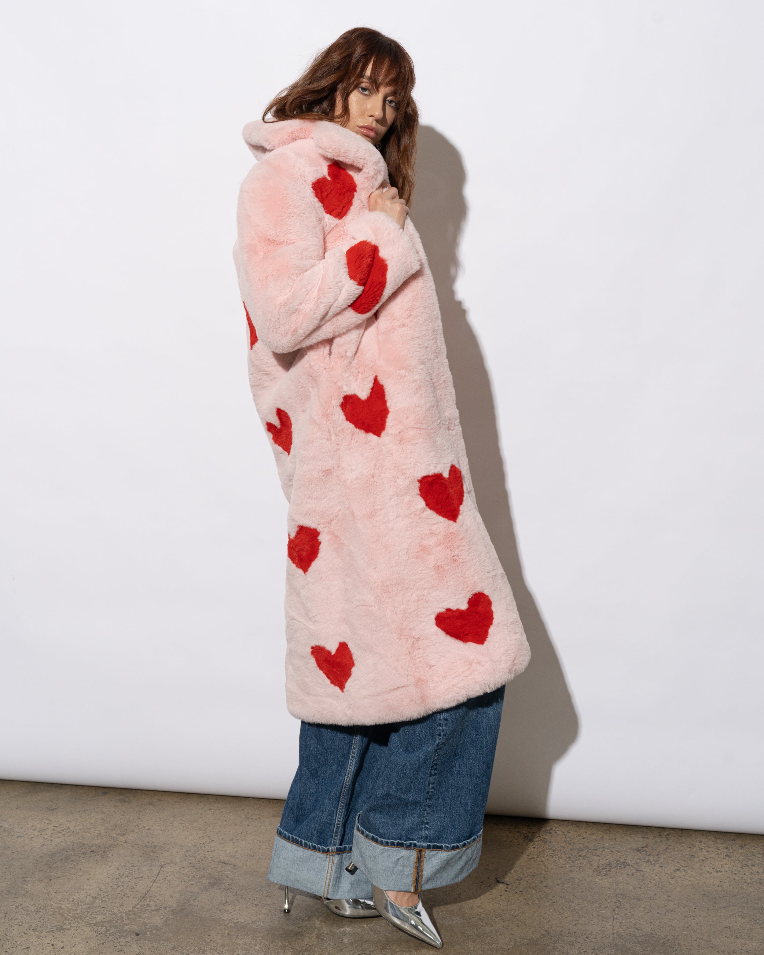Wear your heart on your sleeve (literally!) in the Queen Of Hearts Faux Coat. We've emulated our magnificent Queen of Hearts pink fur coat and created this enchanting faux-fur version just for you. Equal part feminine and rockstar glam, this charismatic piece will turn heads this winter.