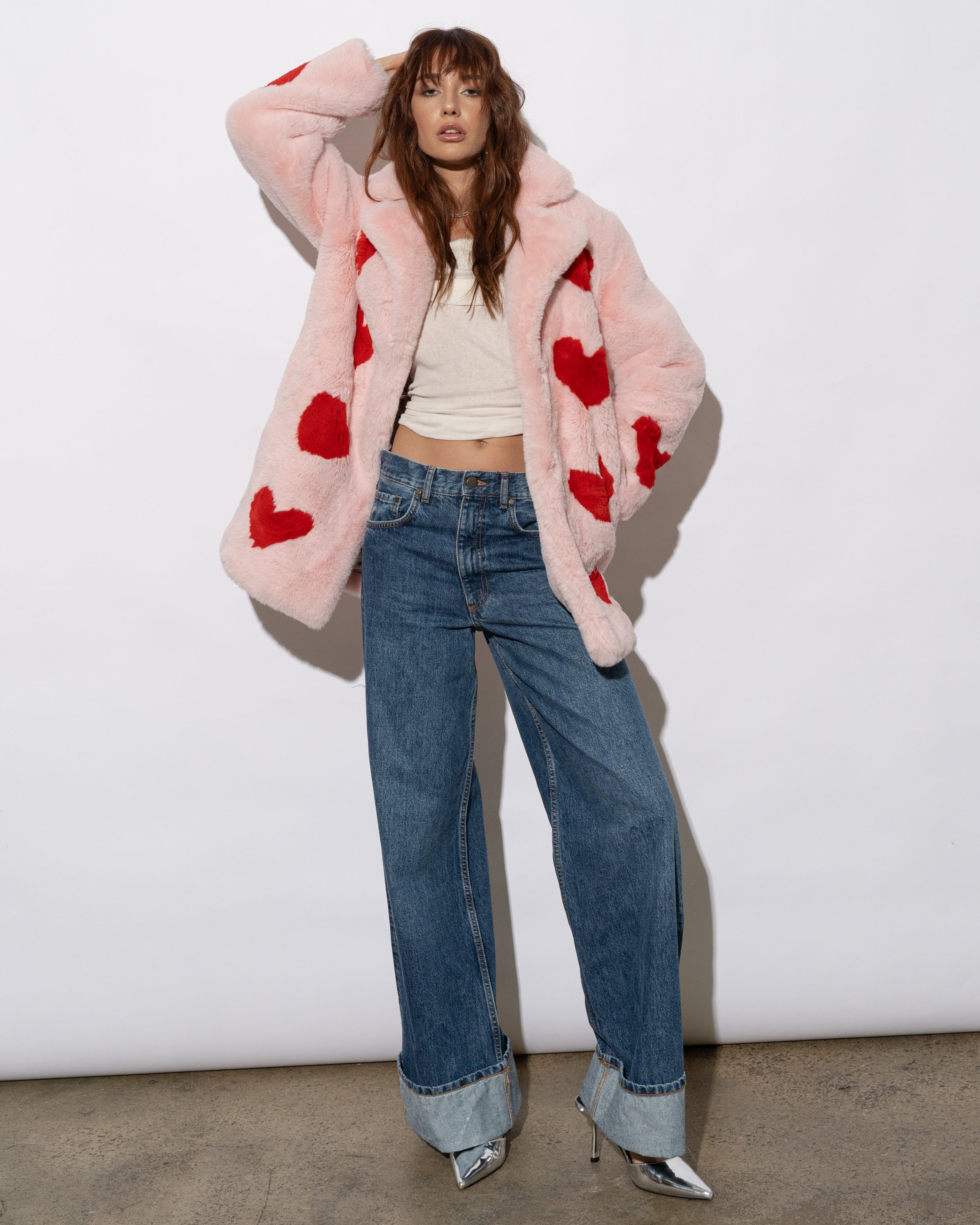 Wear your heart on your sleeve (literally!) in the Queen Of Hearts Faux Mid Coat. We've emulated our magnificent Queen of Hearts pink fur coat and created this enchanting faux mid coat version just for you. Equal part feminine and rockstar glam, this charismatic piece will turn heads this winter.