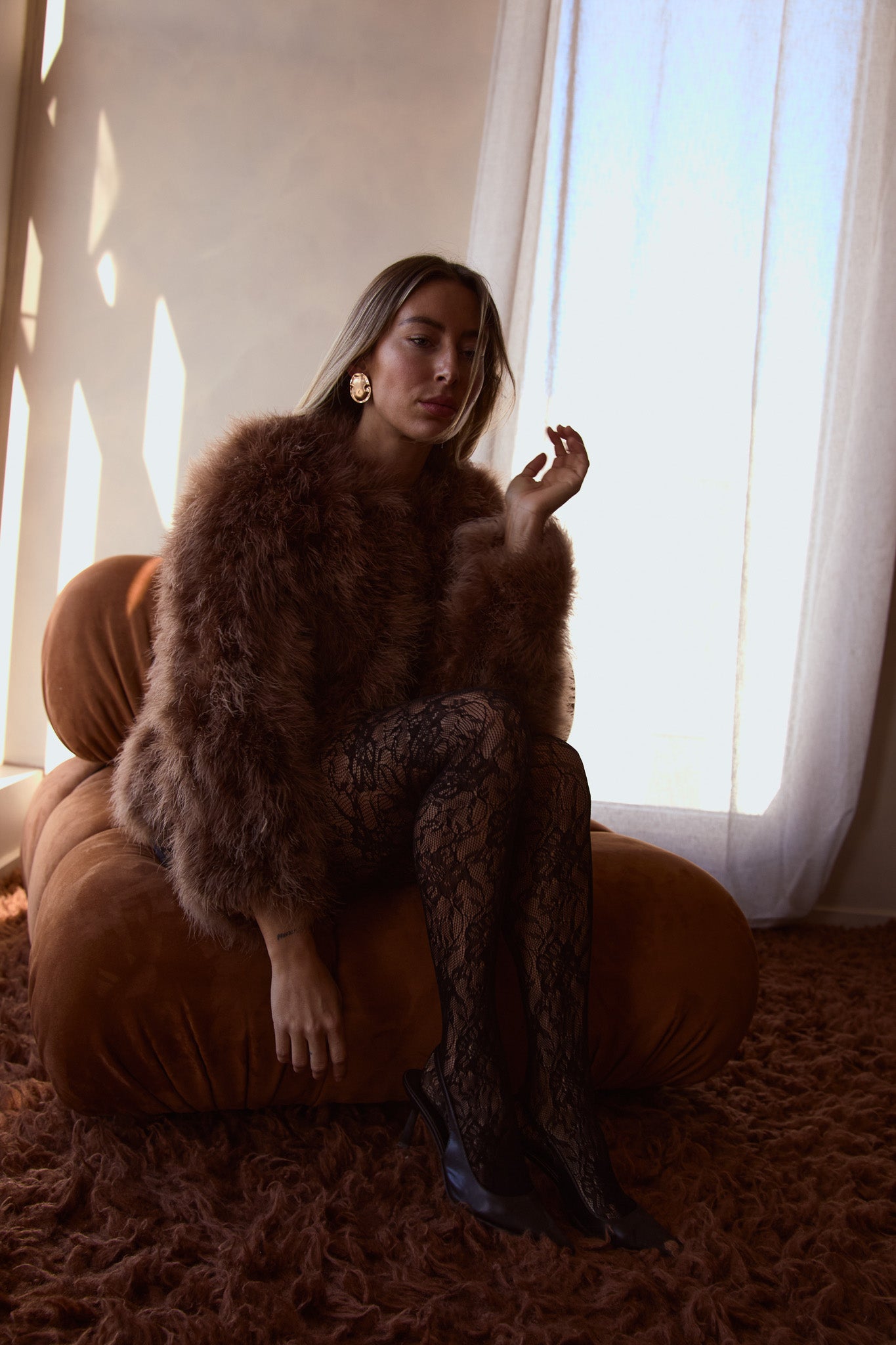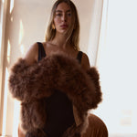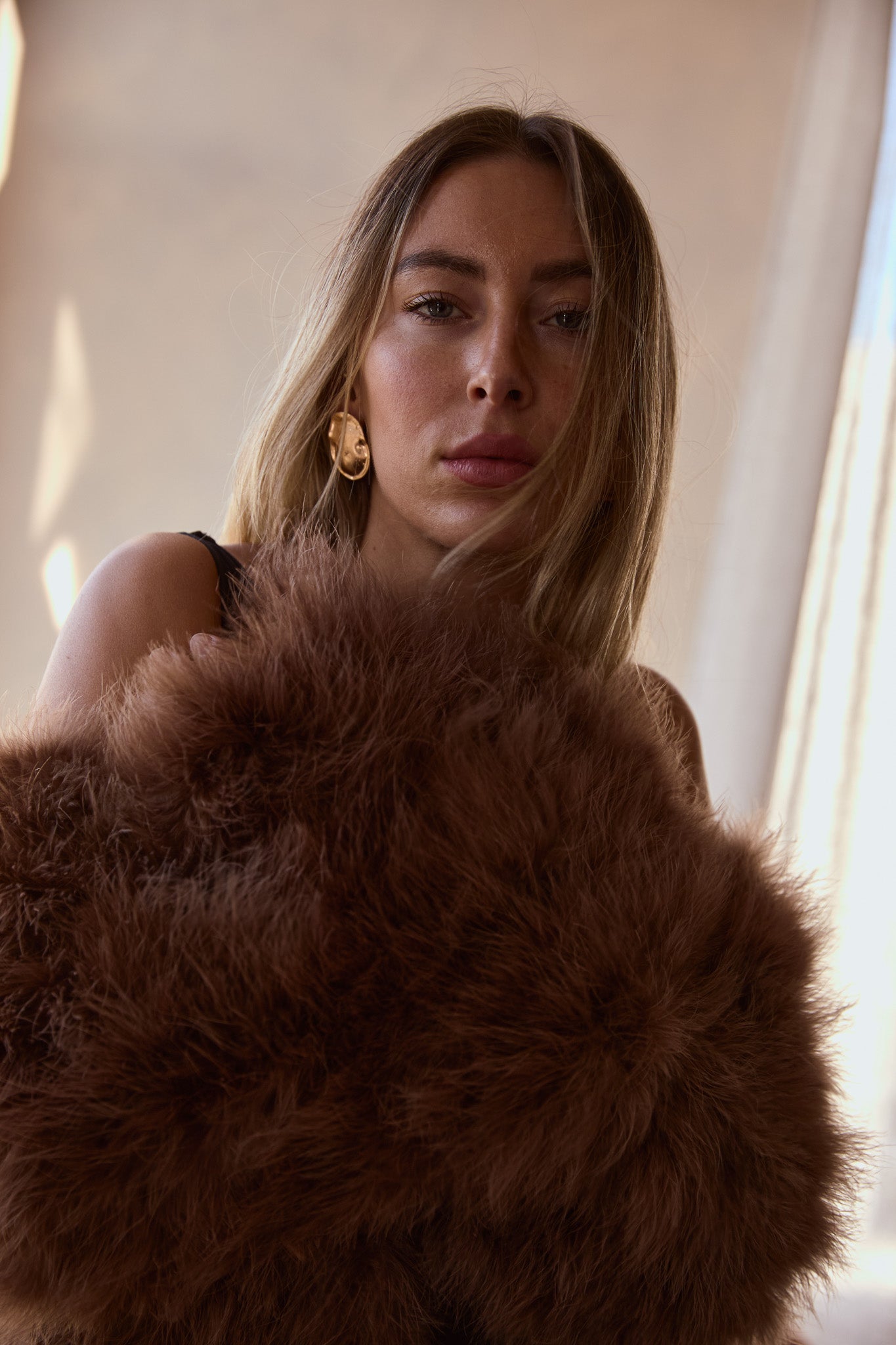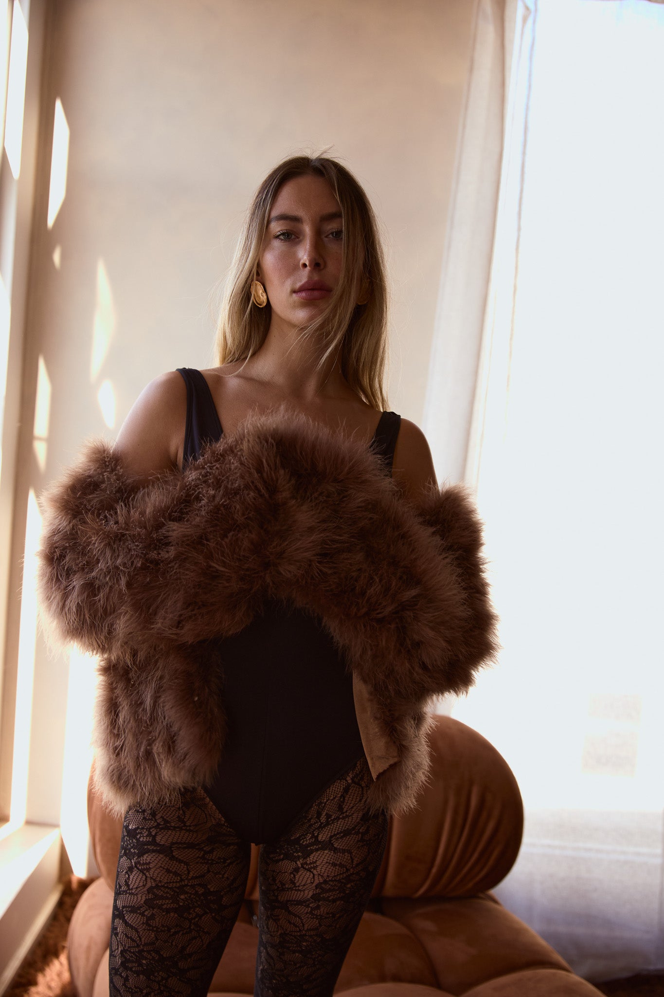 The Saville jacket is made from 100% marabou feather with satin lining.