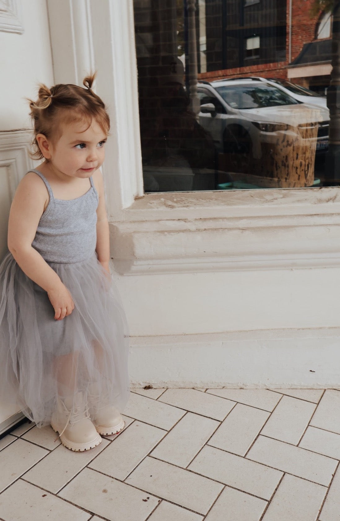 Say hello to your little one's new fave dress! This Tutu Singlet Dress in Dove Grey is made with the softest cotton and features a twirl-worthy tutu skirt. Truly a sight to behold, your mini-me's sure to be the star of the show. Feel the tutu-tsunami with this must-have look.