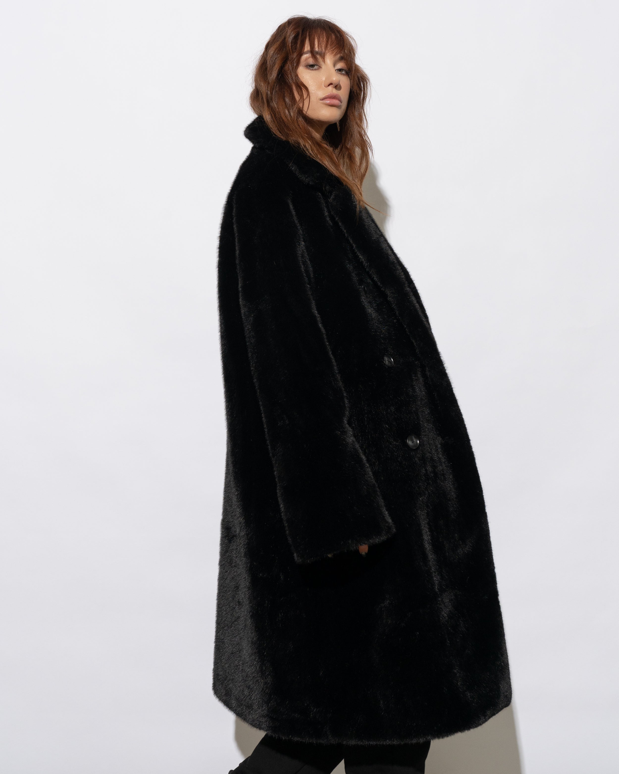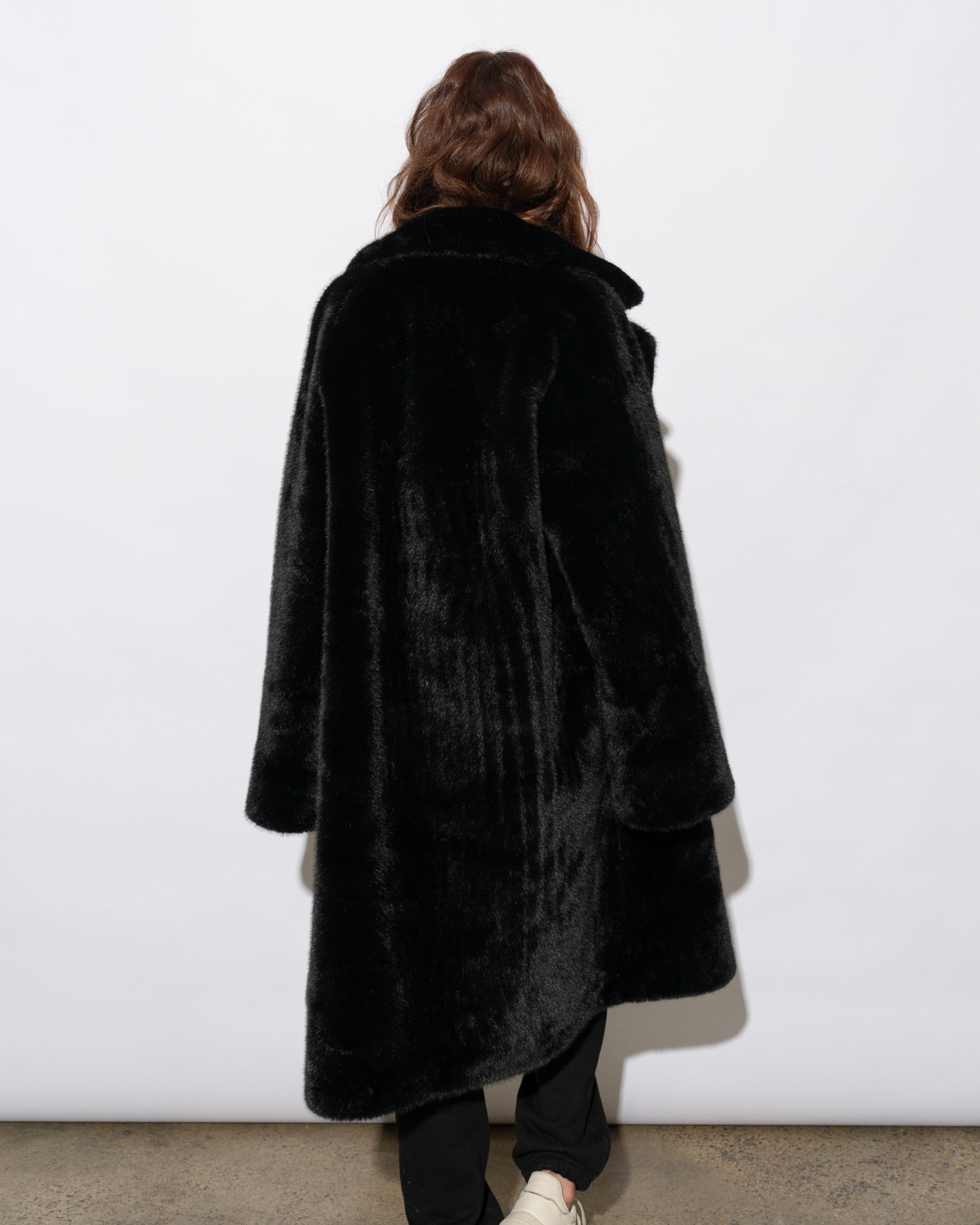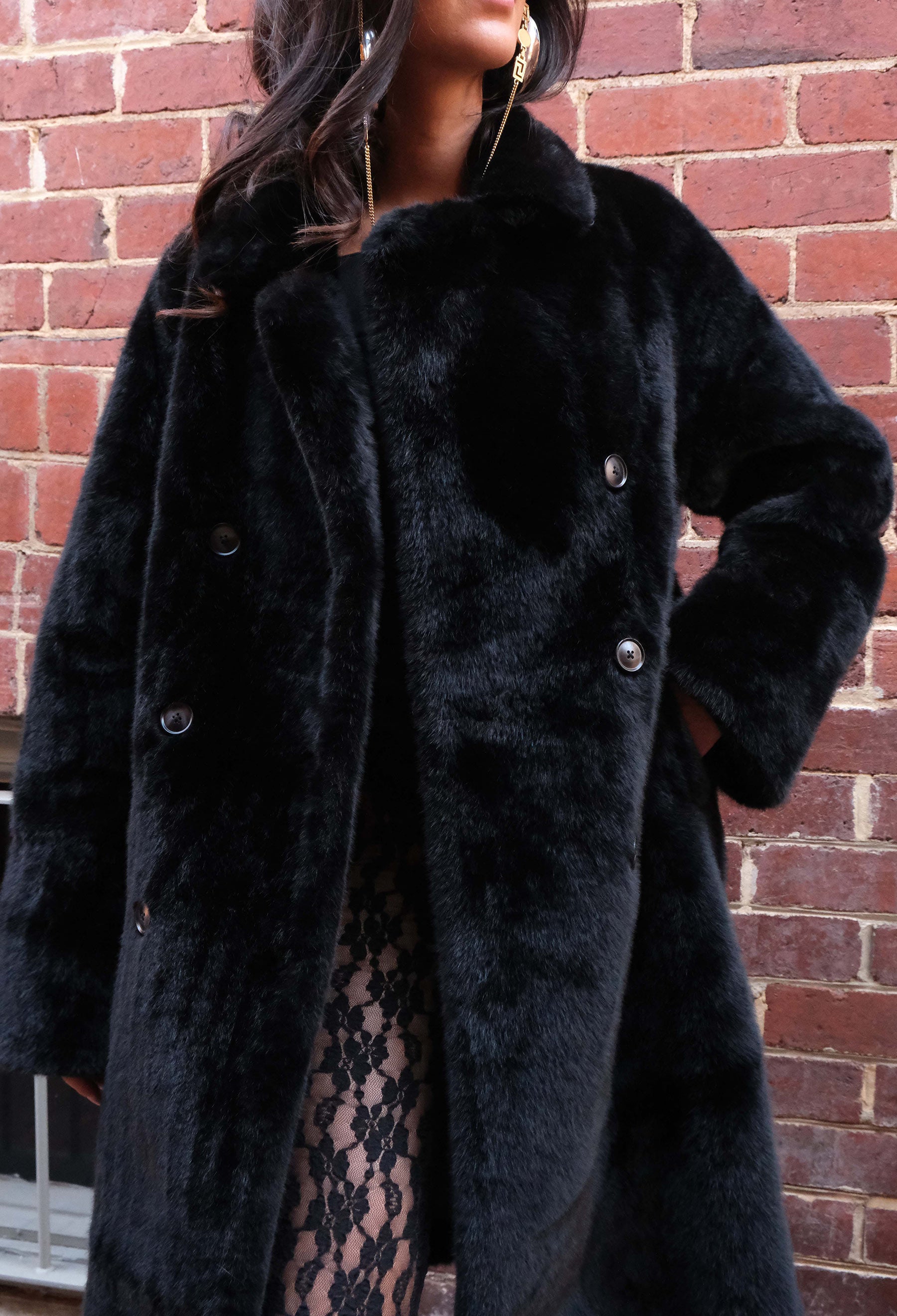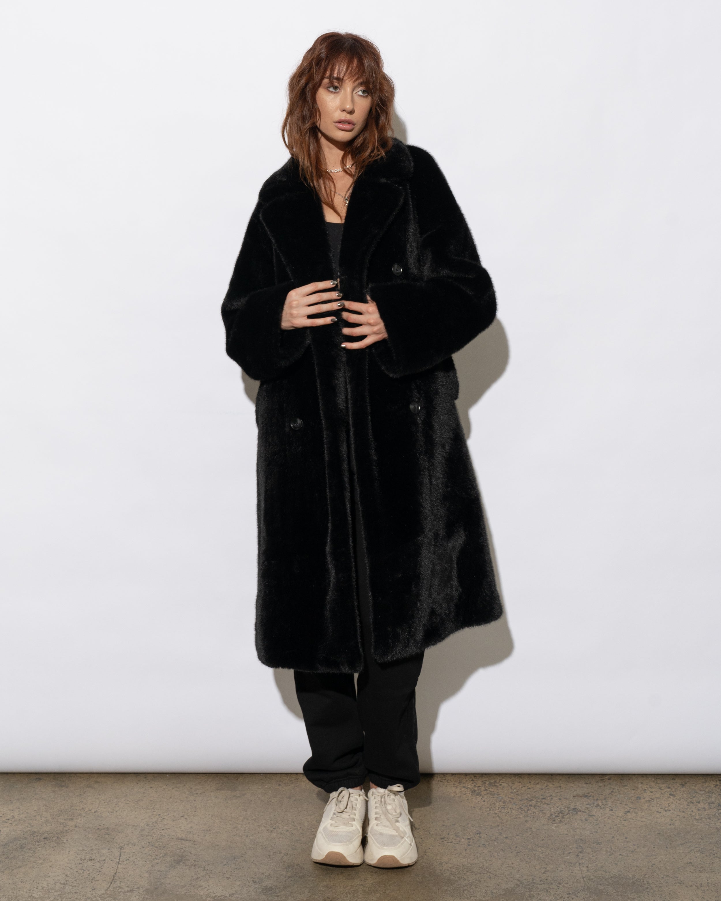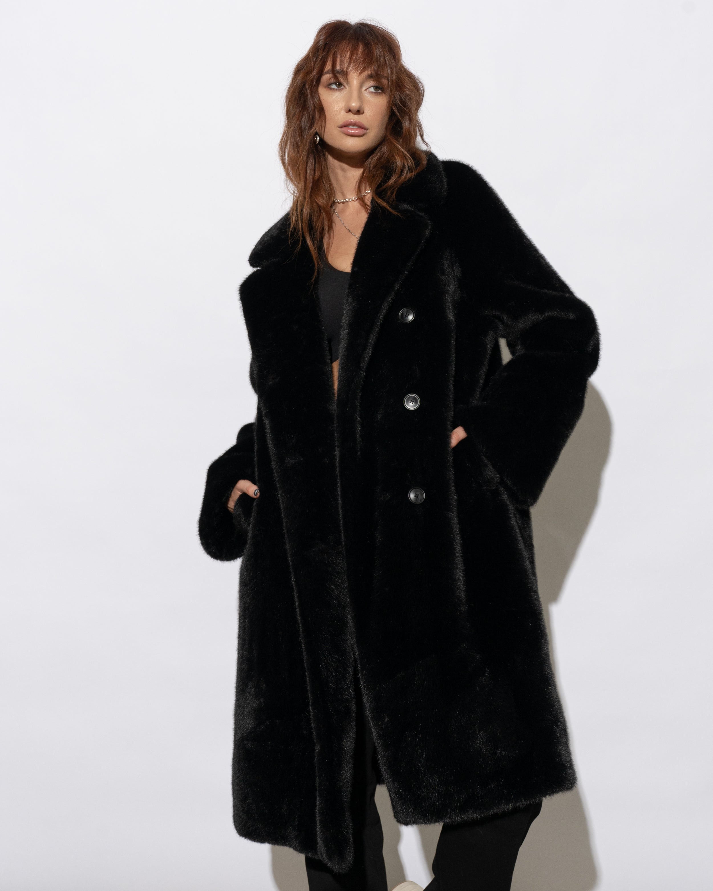 Conquer the chill in the ultra chic Willow Faux Fur Coat in Noir. This sumptuously soft winter essential combines neutral tones with a bold, sexy longline silhouette, perfect for the daring woman-on-a-mission. Embrace the cold weather with its statement chunky buttoned double-breasted closure, adjustable rolled cuffs, and deep set hip pockets keeping you toasty. Upgrade your urban style with this winter must-have.