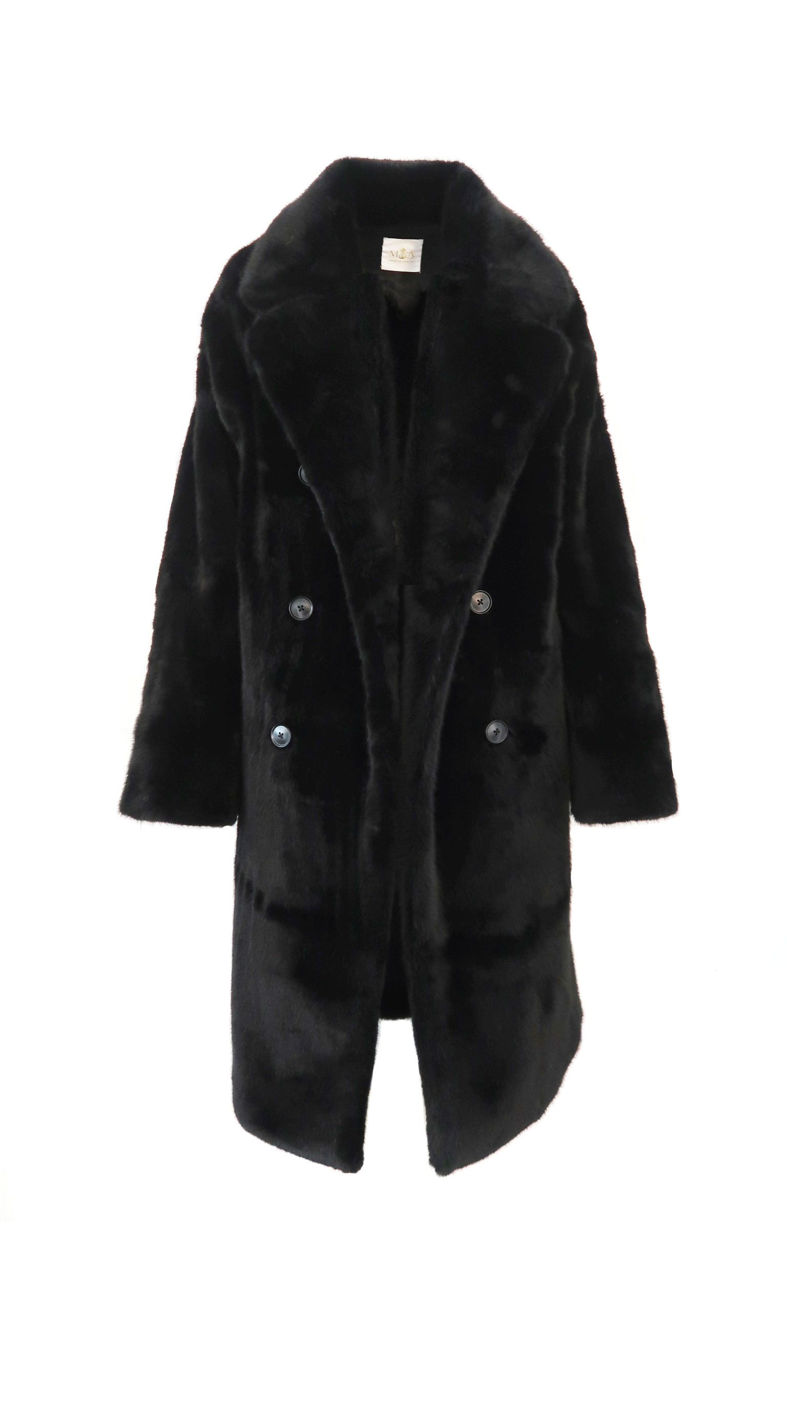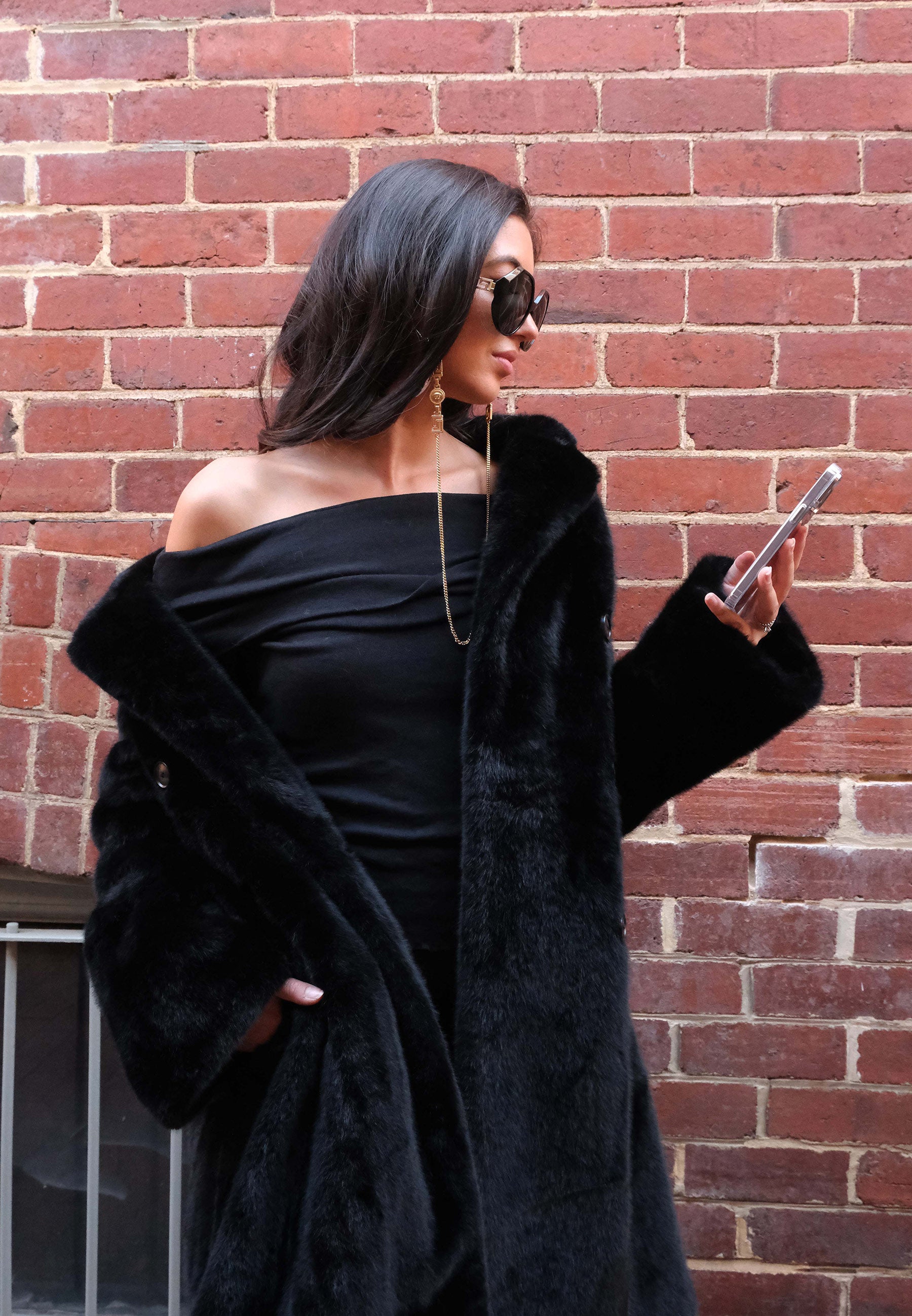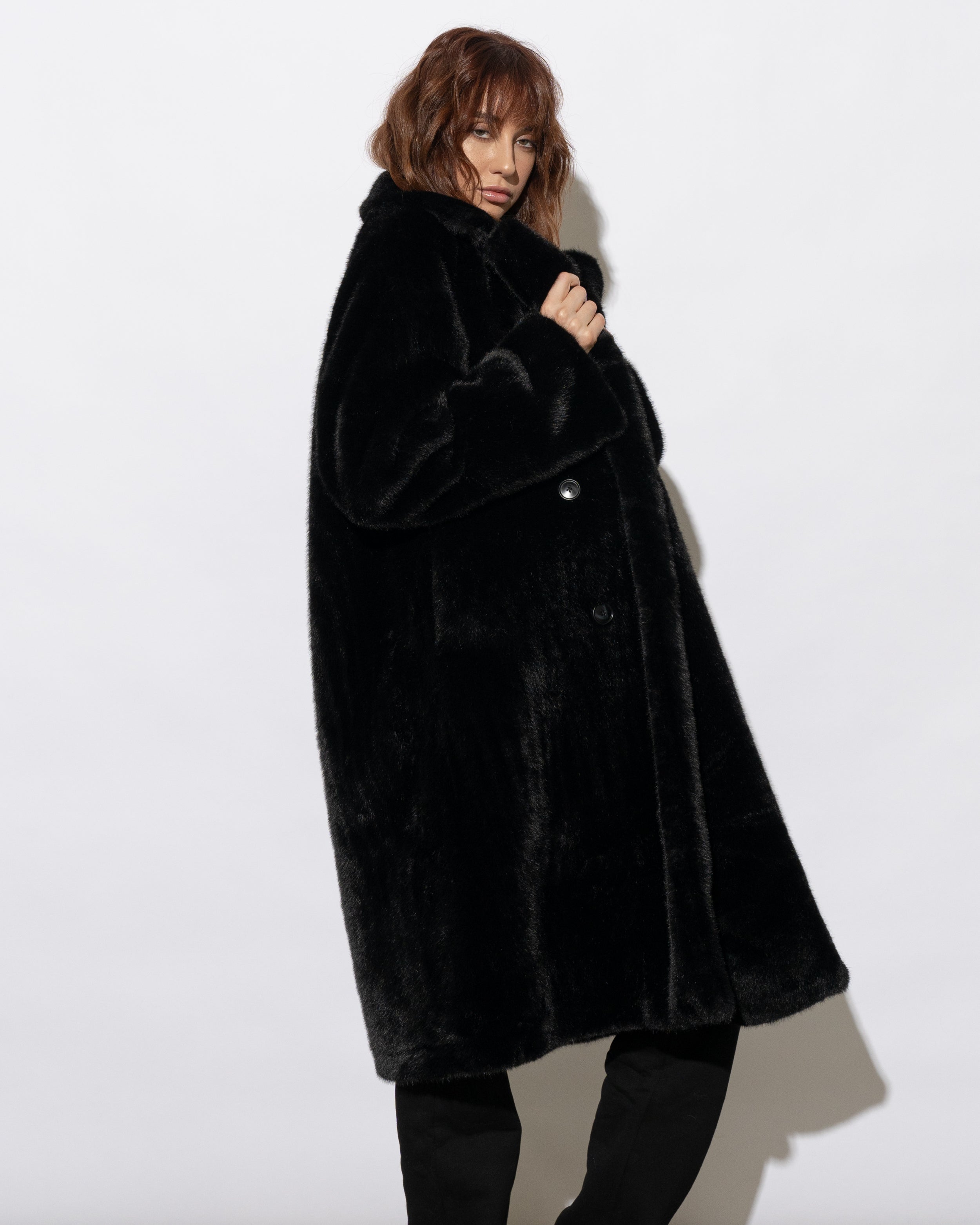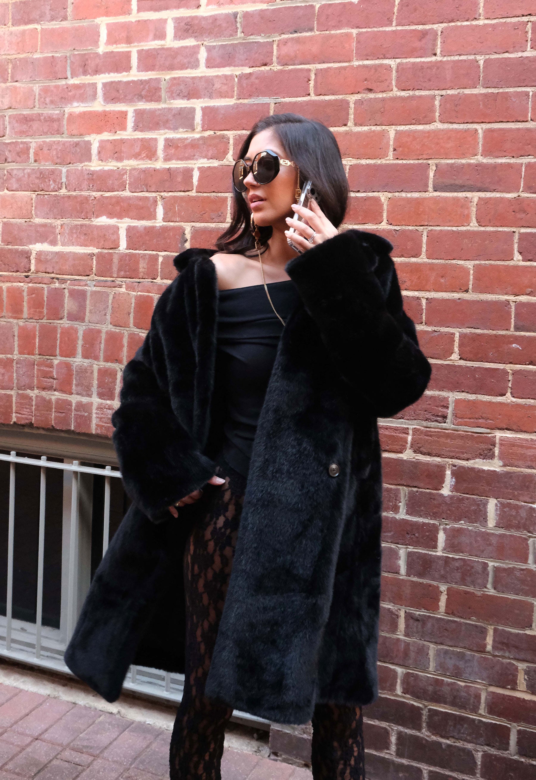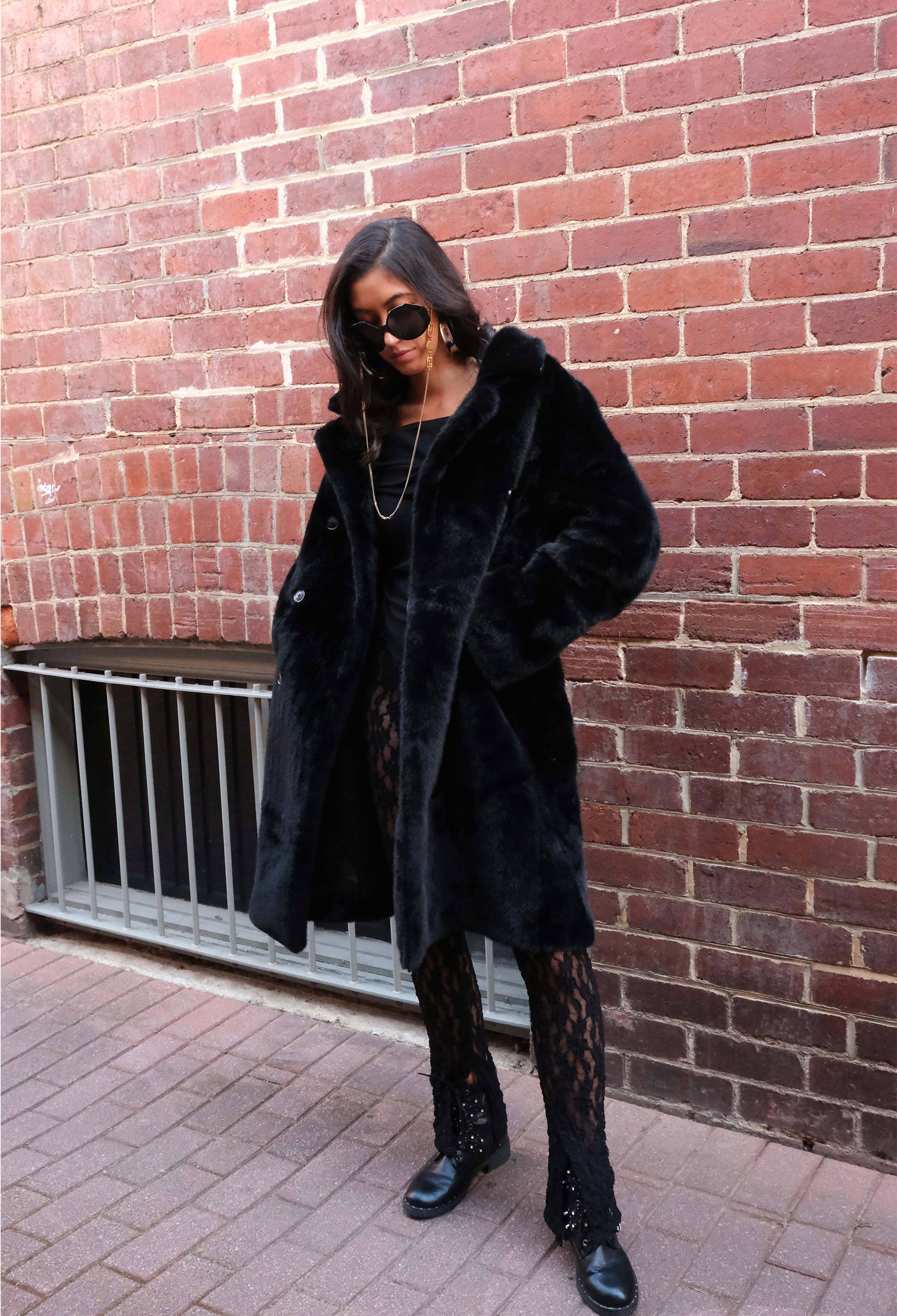 Conquer the chill in the ultra chic Willow Faux Fur Coat in Noir. This sumptuously soft winter essential combines neutral tones with a bold, sexy longline silhouette, perfect for the daring woman-on-a-mission. Embrace the cold weather with its statement chunky buttoned double-breasted closure, adjustable rolled cuffs, and deep set hip pockets keeping you toasty. Upgrade your urban style with this winter must-have.