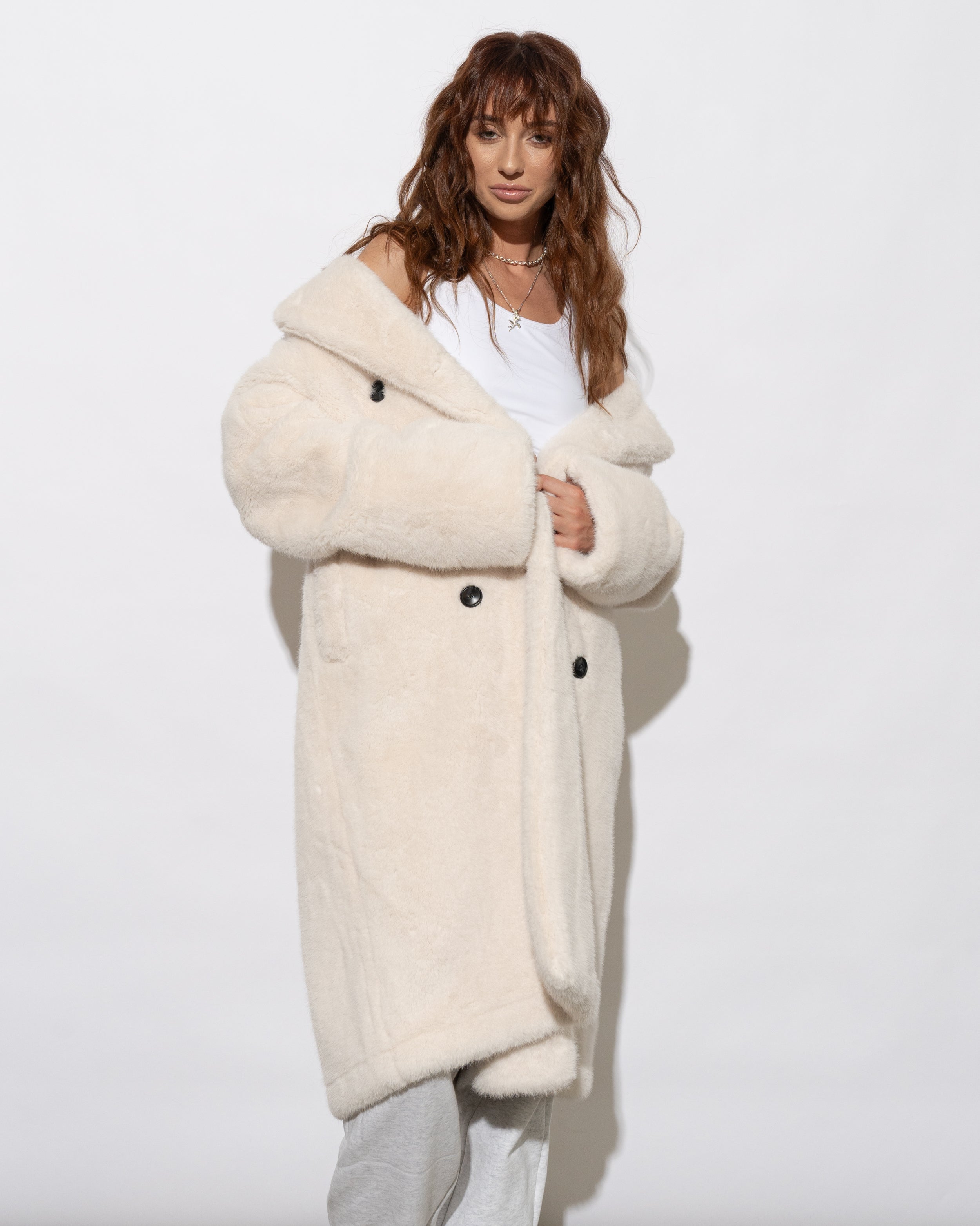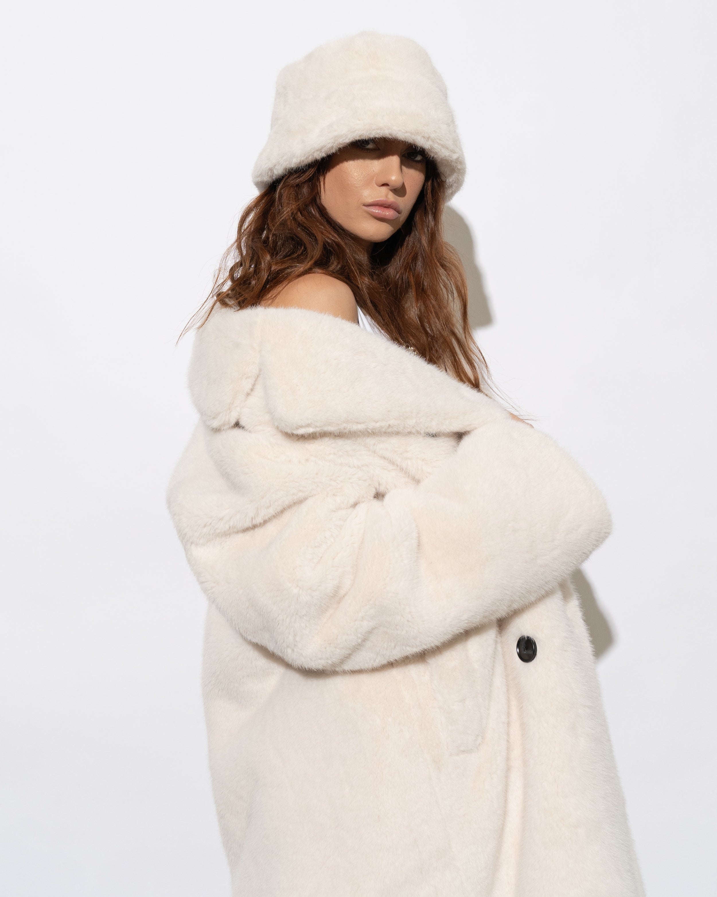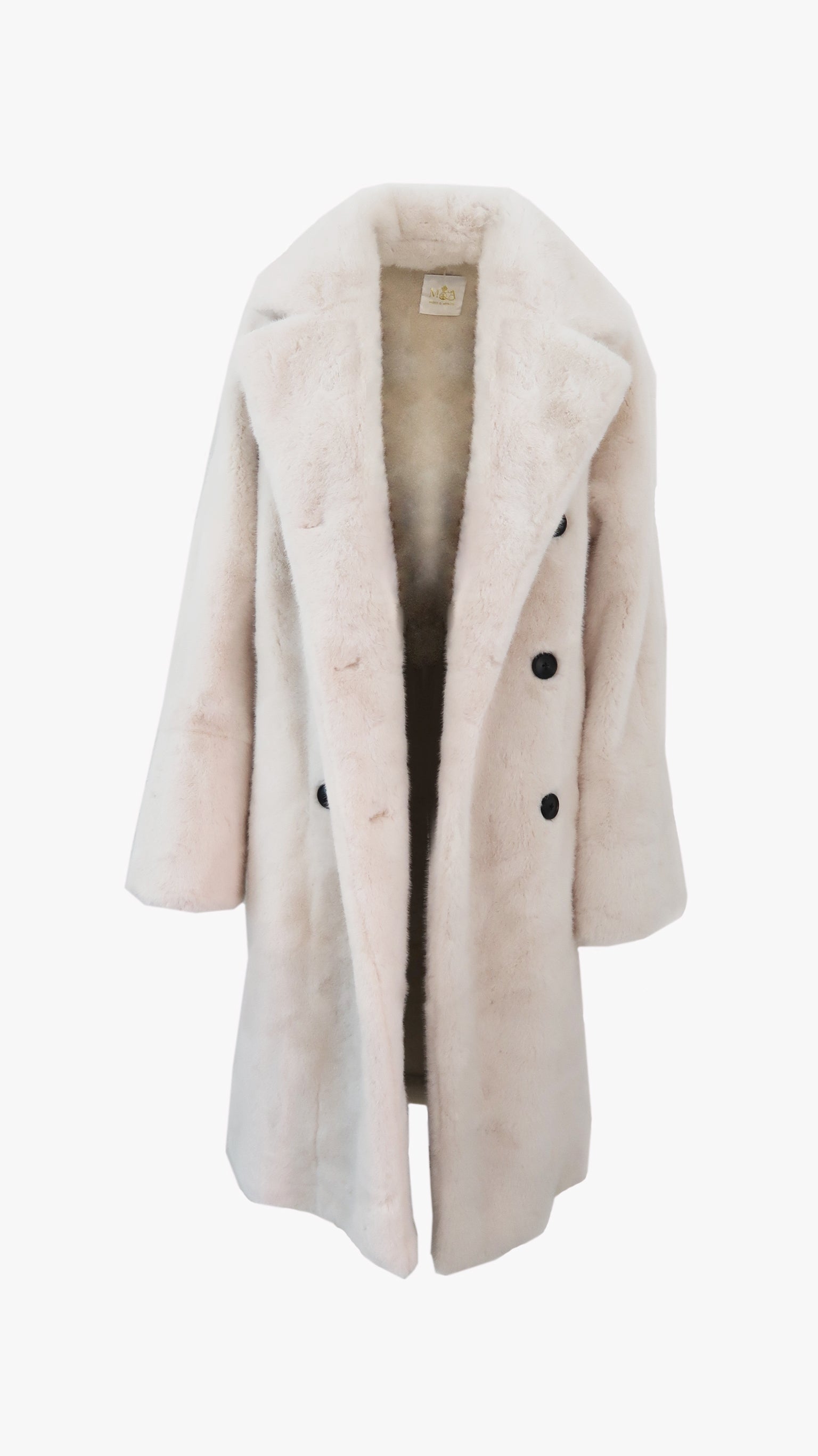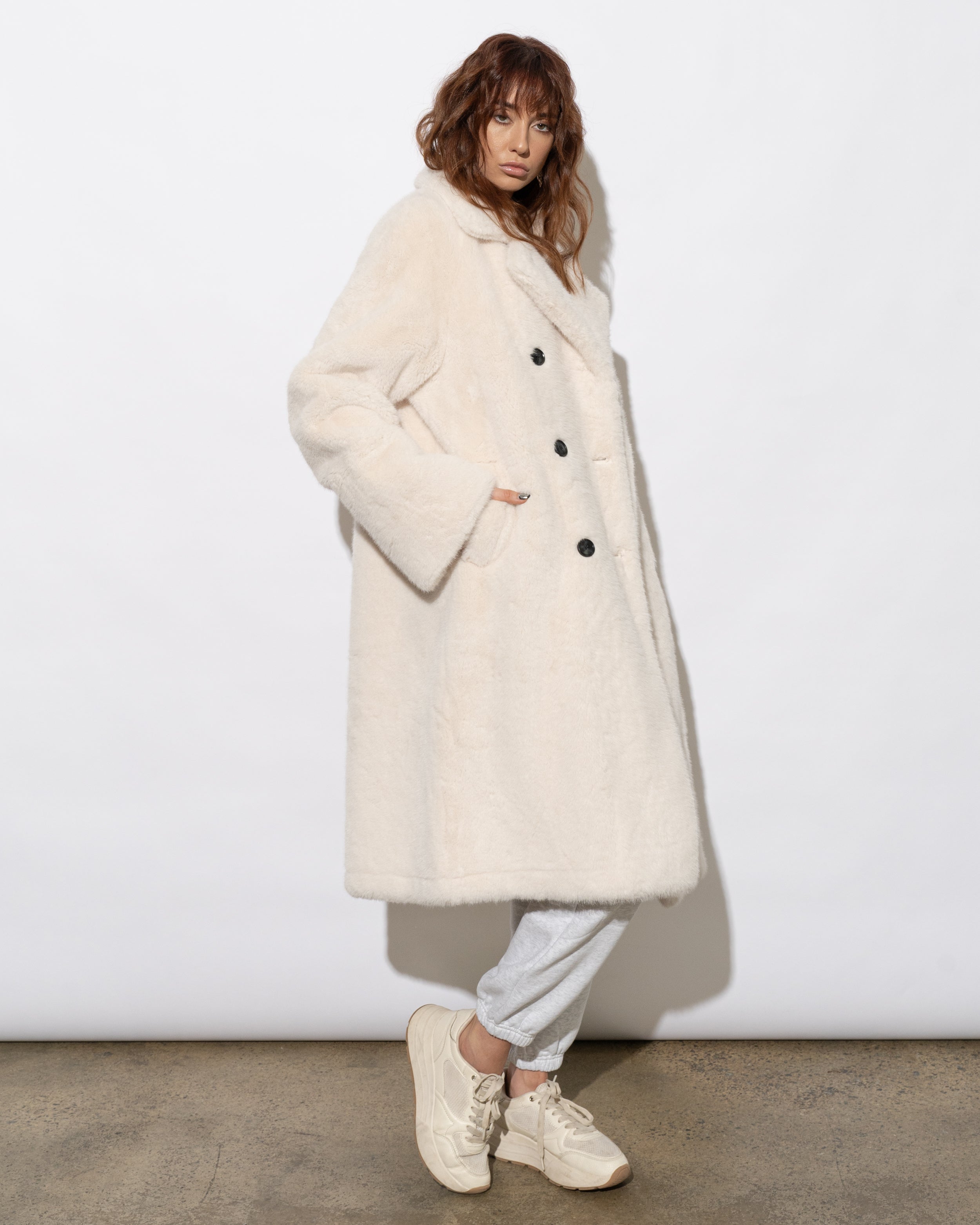 Conquer the chill in the ultra chic Willow Faux Fur Coat in Creme. This sumptuously soft winter essential combines neutral tones with a bold, sexy longline silhouette, perfect for the daring woman-on-a-mission. Embrace the cold weather with its statement chunky buttoned double-breasted closure, adjustable rolled cuffs, and deep set hip pockets keeping you toasty. Upgrade your urban style with this winter must-have.