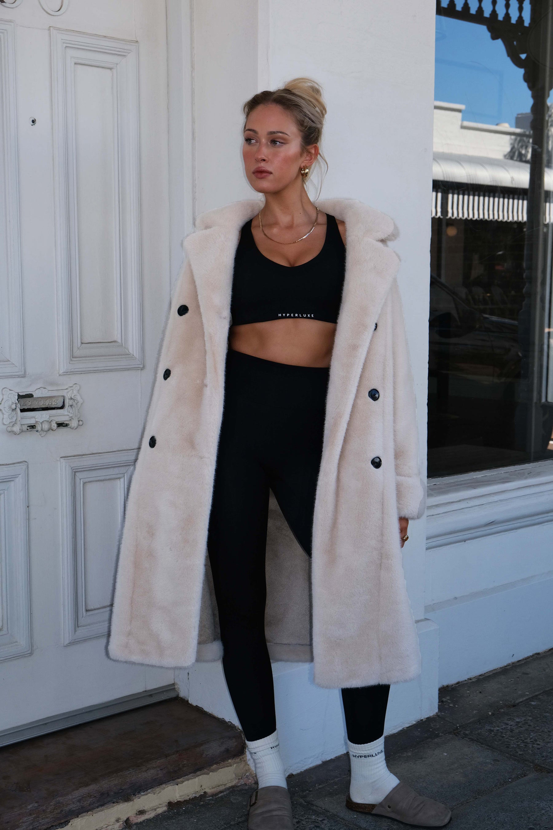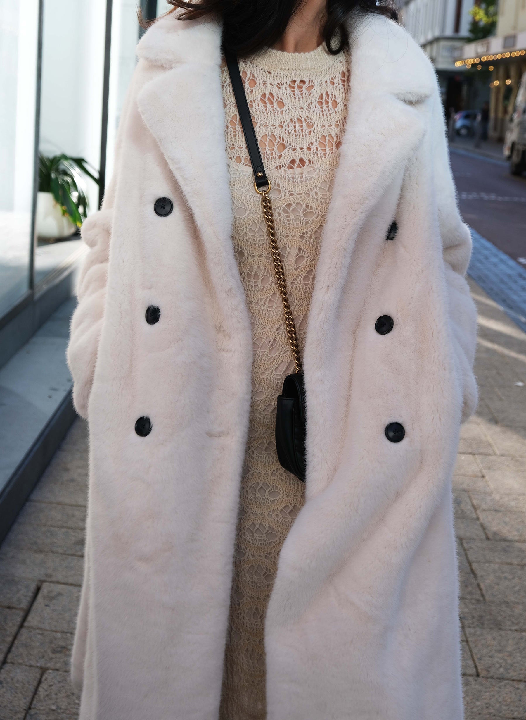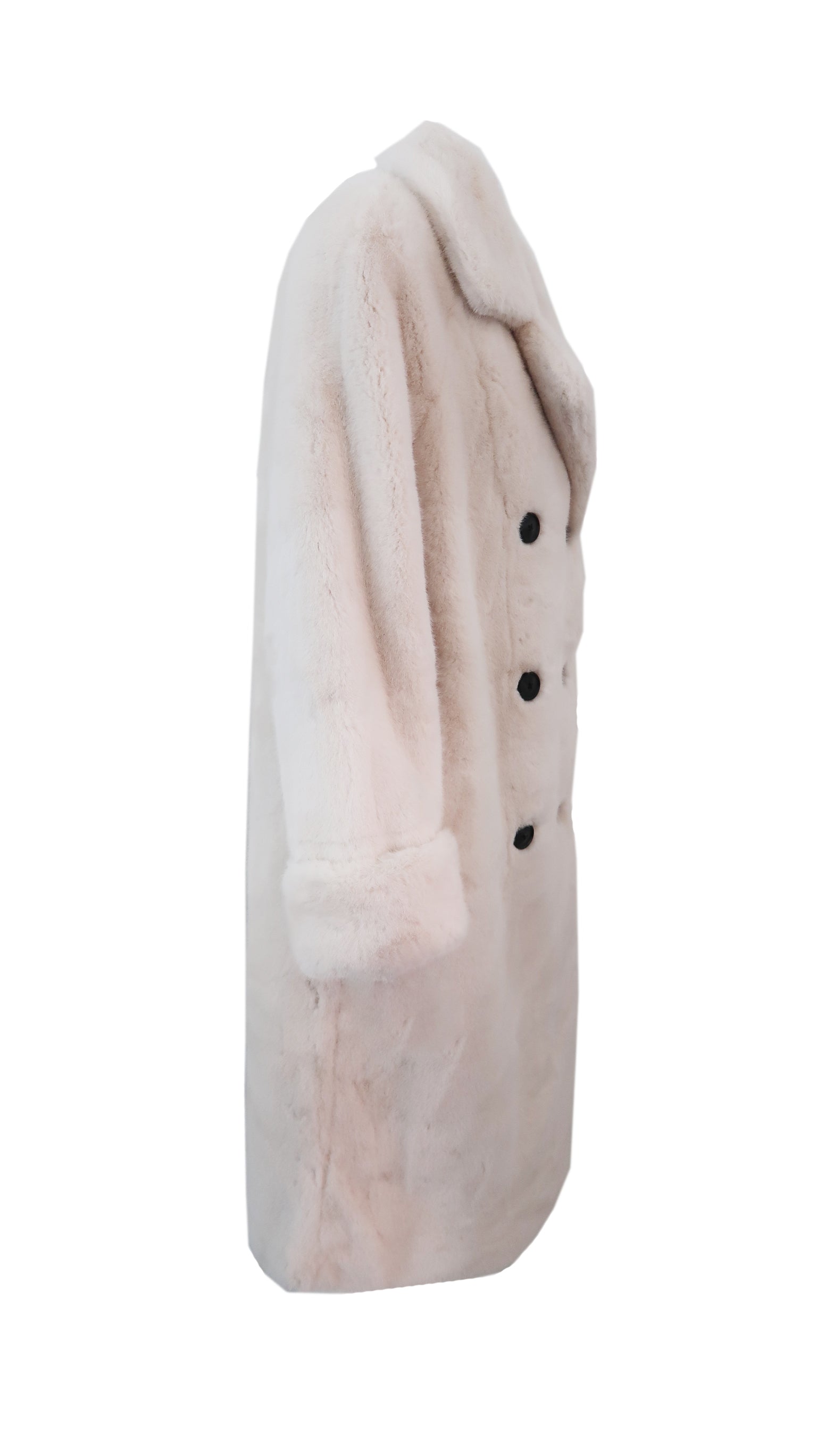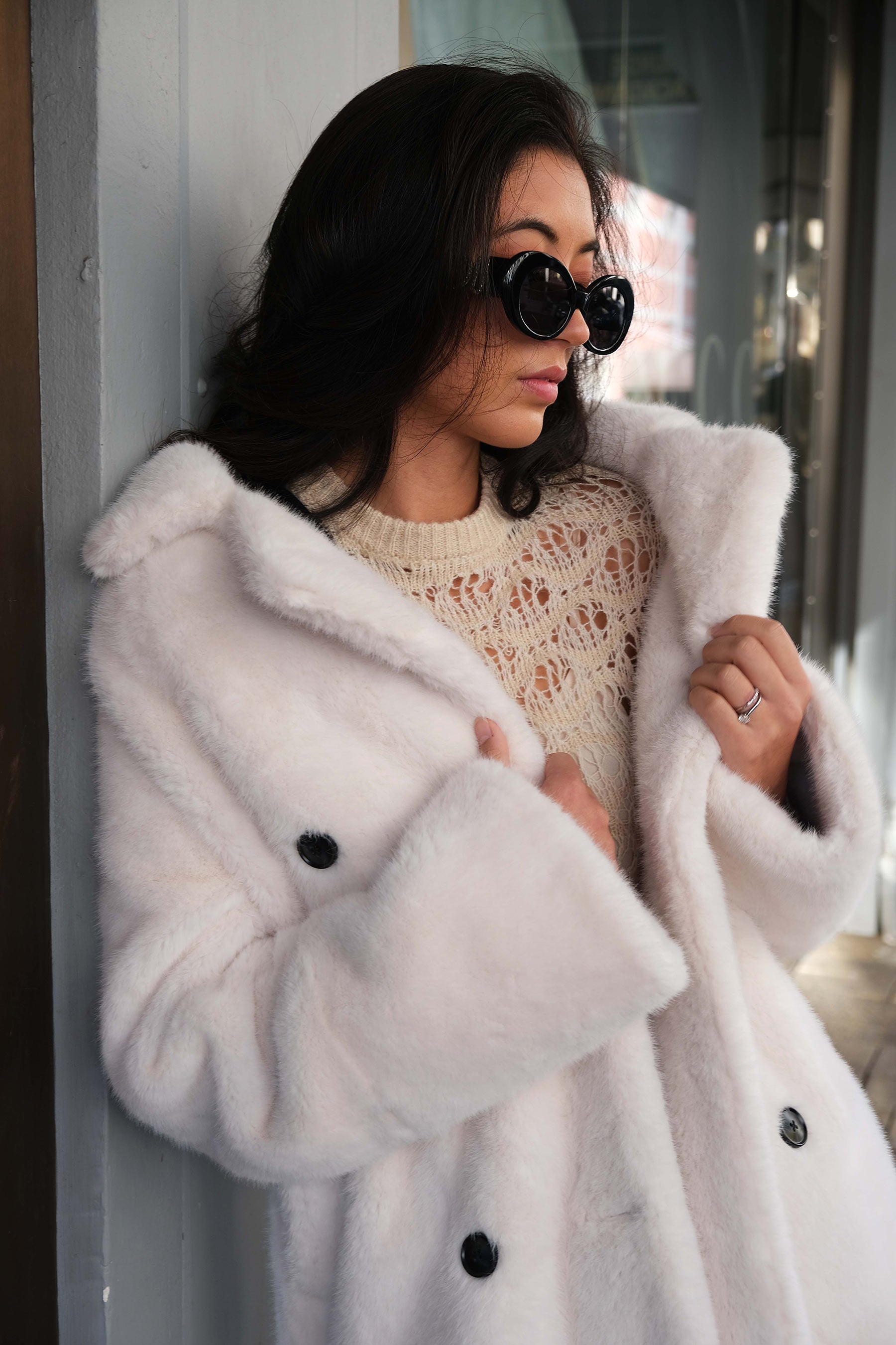 Conquer the chill in the ultra chic Willow Faux Fur Coat in Creme. This sumptuously soft winter essential combines neutral tones with a bold, sexy longline silhouette, perfect for the daring woman-on-a-mission. Embrace the cold weather with its statement chunky buttoned double-breasted closure, adjustable rolled cuffs, and deep set hip pockets keeping you toasty. Upgrade your urban style with this winter must-have.
