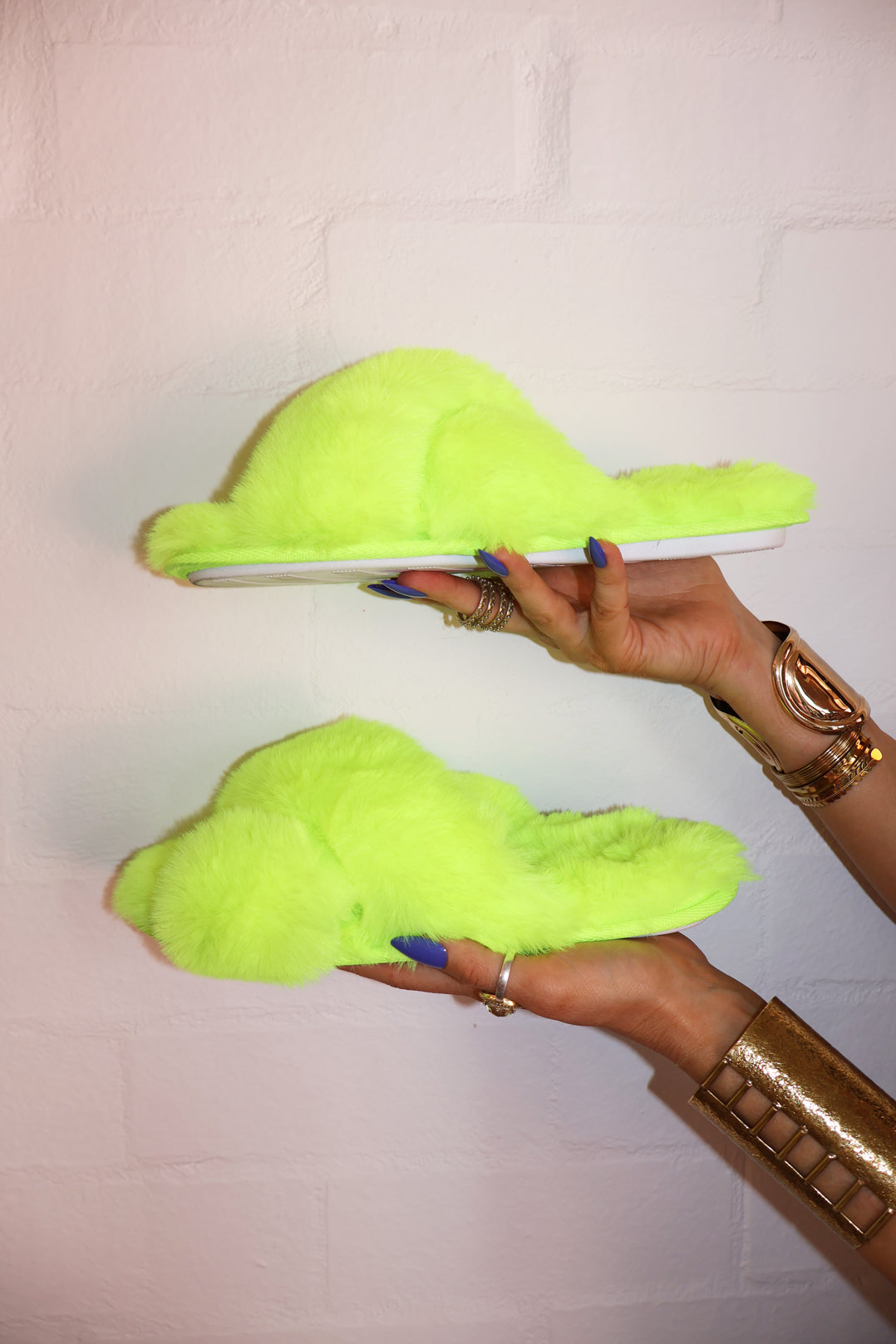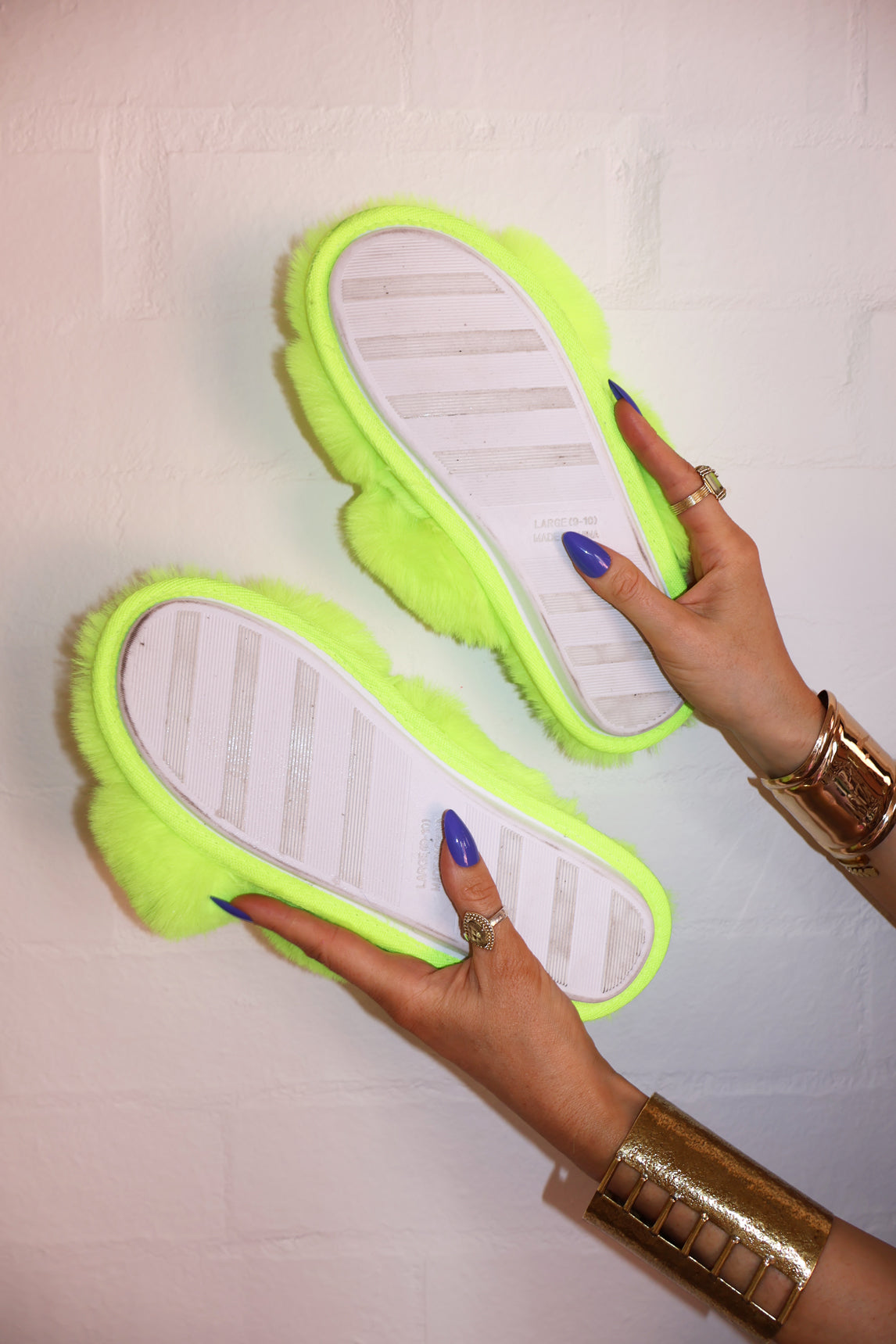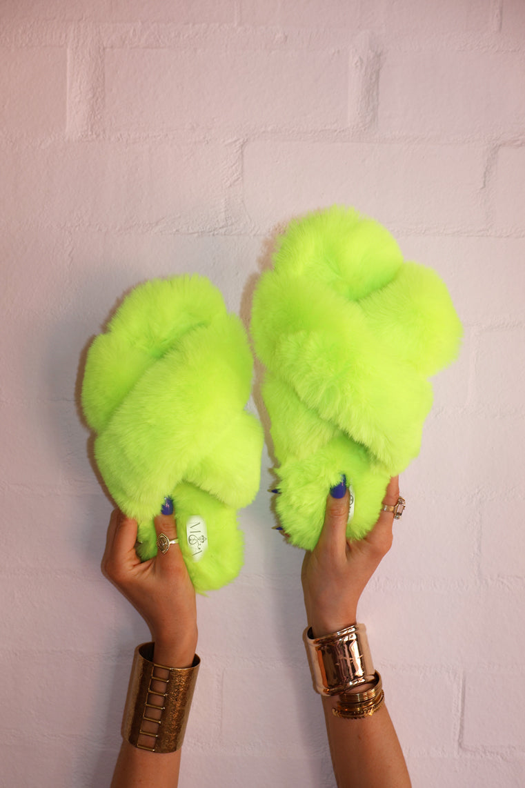 Say goodbye to boring slippers and hello to neon happiness! These bold, neon yellow fluffy slippers are the ultimate statement piece for your feet. With irresistibly soft criss-cross straps that hug your toes like a cozy cloud, you’ll feel like you’re walking on sunshine (literally).